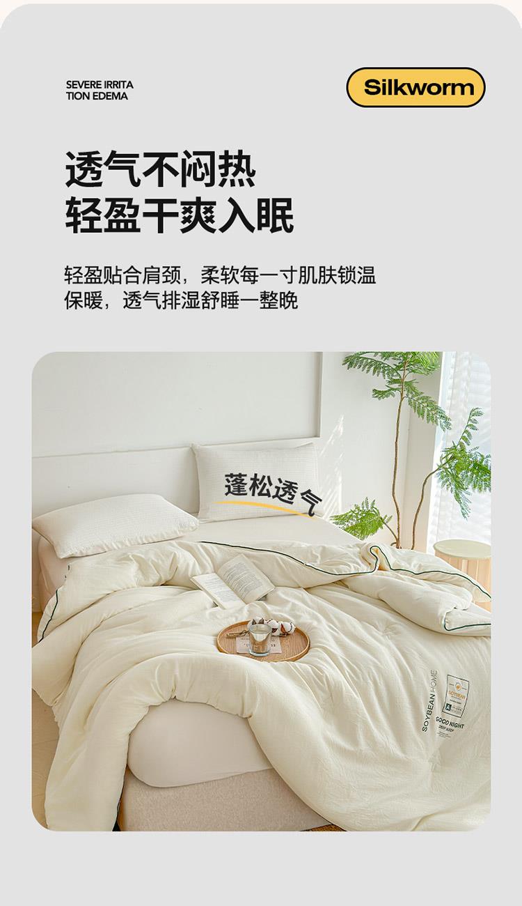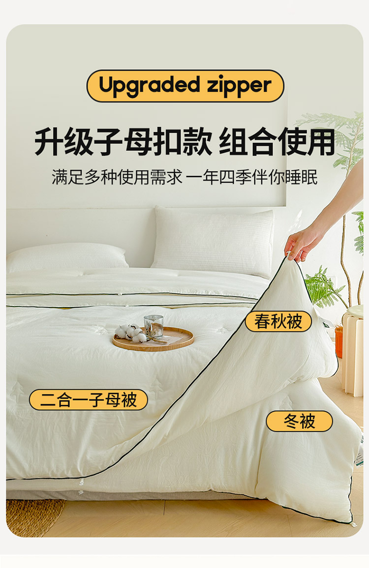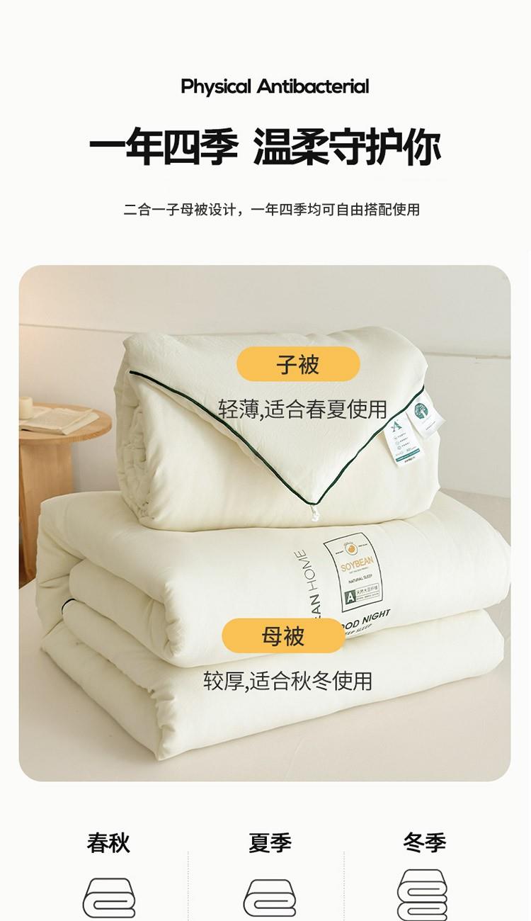规格:150*200cm(3斤) 面料:聚酯纤维 填充:10%大豆纤维+90%聚酯纤维 花色:深林白 采用A类亲肤面料,软糯细腻,透气不闷热,轻盈干爽入眠;新一代活性印染工艺,色牢度高,不易褪色;绗缝定位,针脚细腻,不易跑棉不结团不变形;立体滚边,美观时尚,不易脱边;10%大豆纤维+90%聚酯纤维,填充均匀,蓬松柔软;二合一升级子母扣款设计,可组合子母被,可单独合成睡袋。多种规格可选,一年四季可用。
