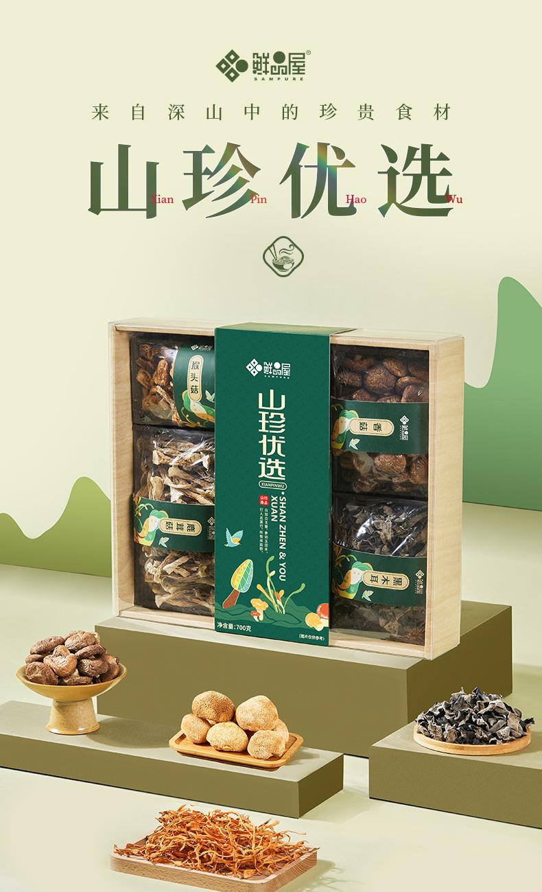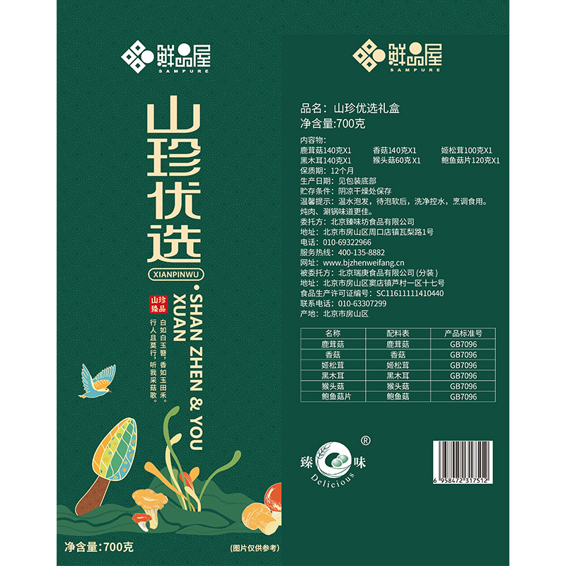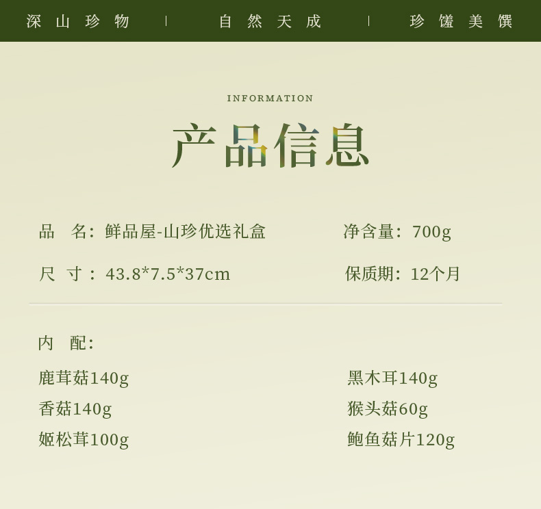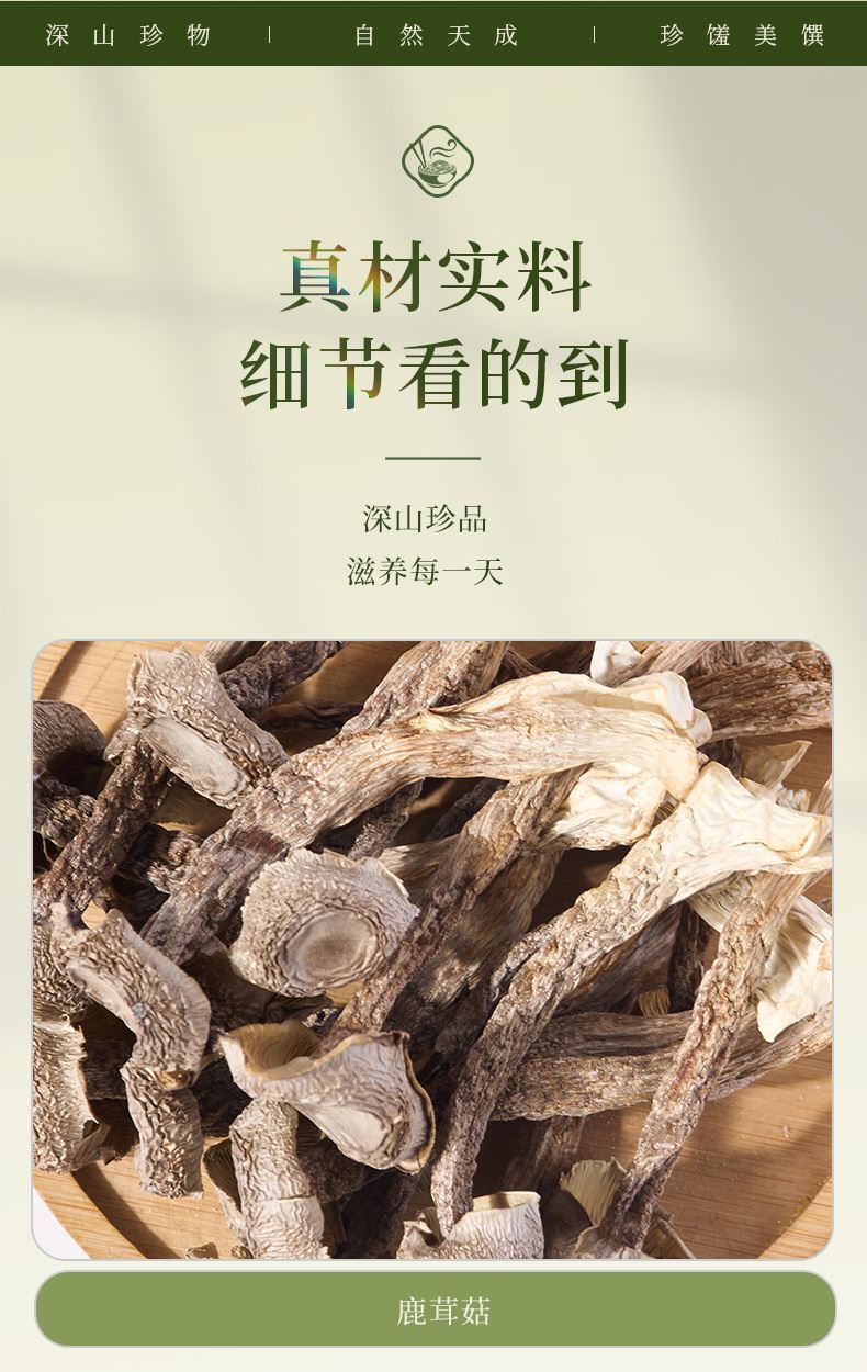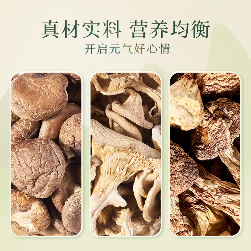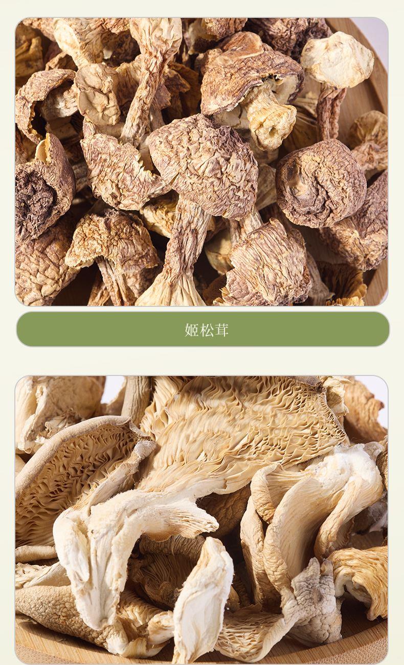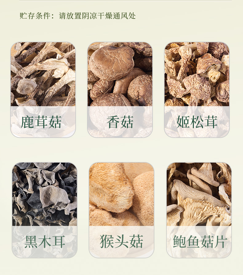 鹿茸菇140g 香菇140g 姬松茸100g 黑木耳140g 猴头菇60g 鲍鱼菇片120g