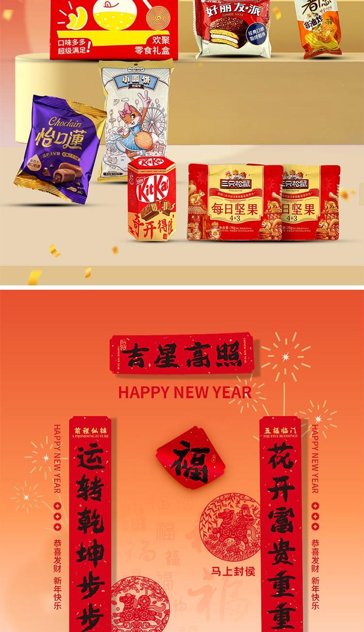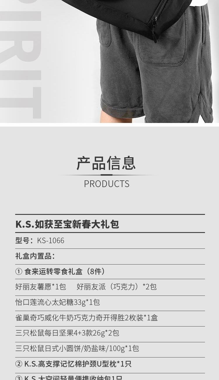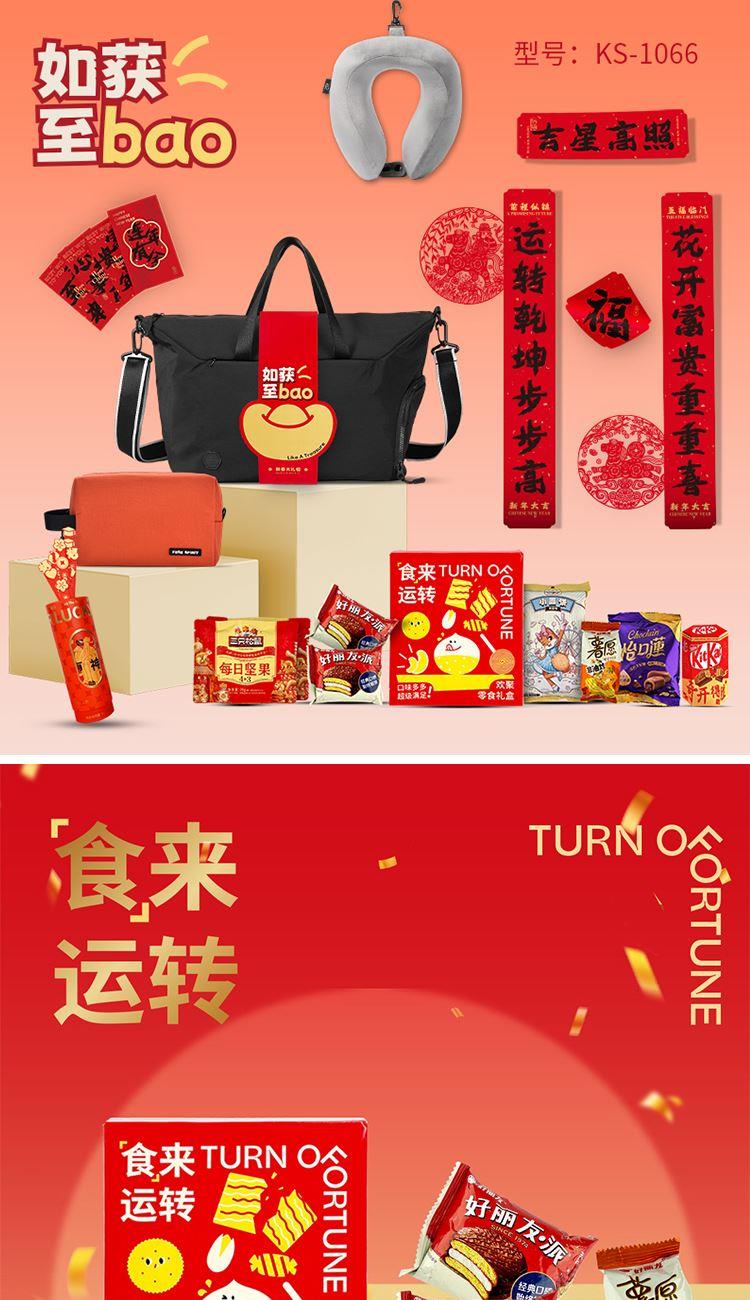 内置经典年品(春联、红包、窗花)与零食礼盒,搭配实用好物(U型枕、求签桶、收纳包),心意满满。