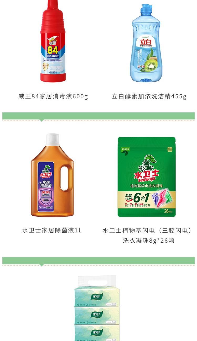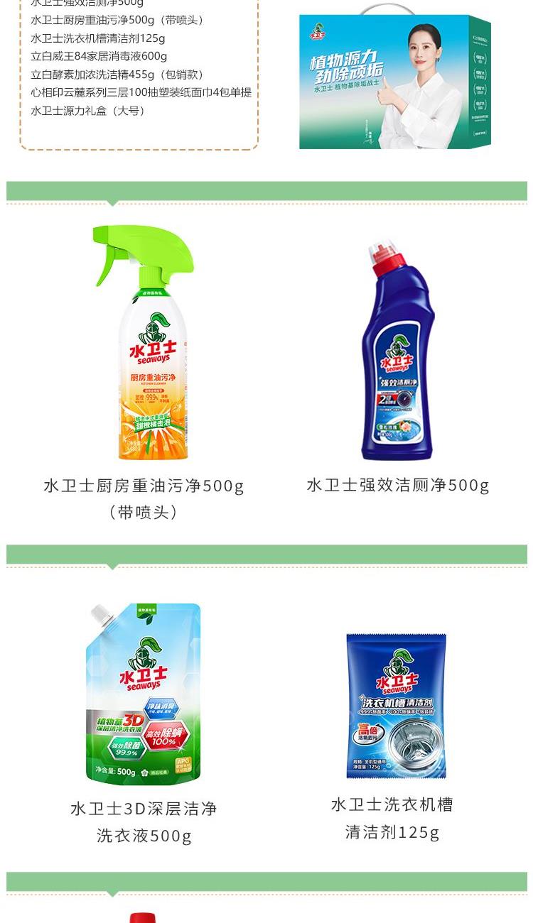 水卫士植物基闪电(三腔闪电)洗衣凝珠8g*26颗 水卫士3D深层洁净洗衣液500g 水卫士家清液1L 水卫士强效洁厕净500g 水卫士厨房重油污净500g(带喷头) 水卫士洗衣机槽清洁剂125g 立白威王84家居消毒液600g 立白酵素加浓洗洁精455g 心相印云麓系列三层100抽塑装纸面巾4包单提 思珀莱源力礼盒(净含量4388g 大号)