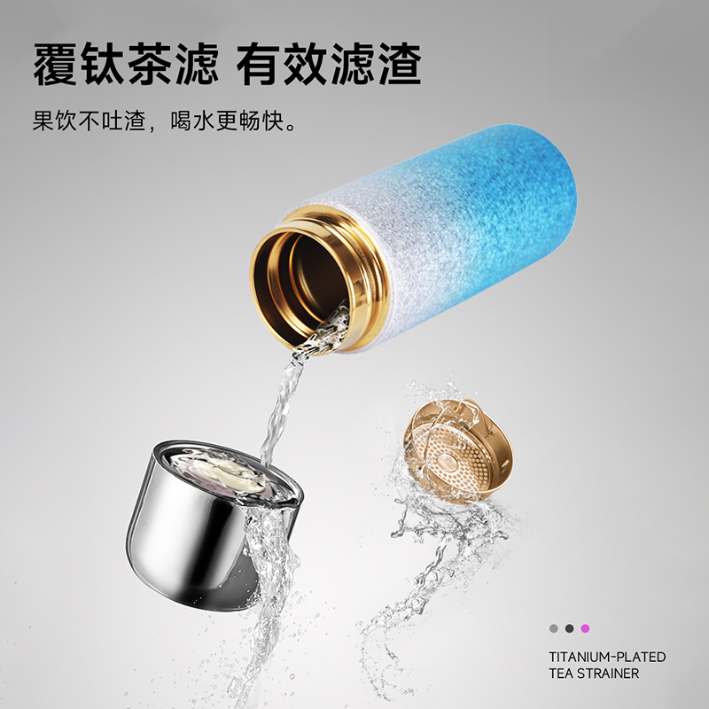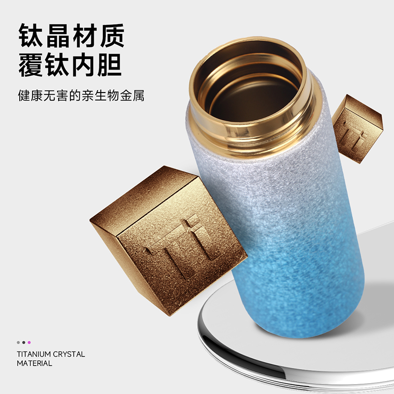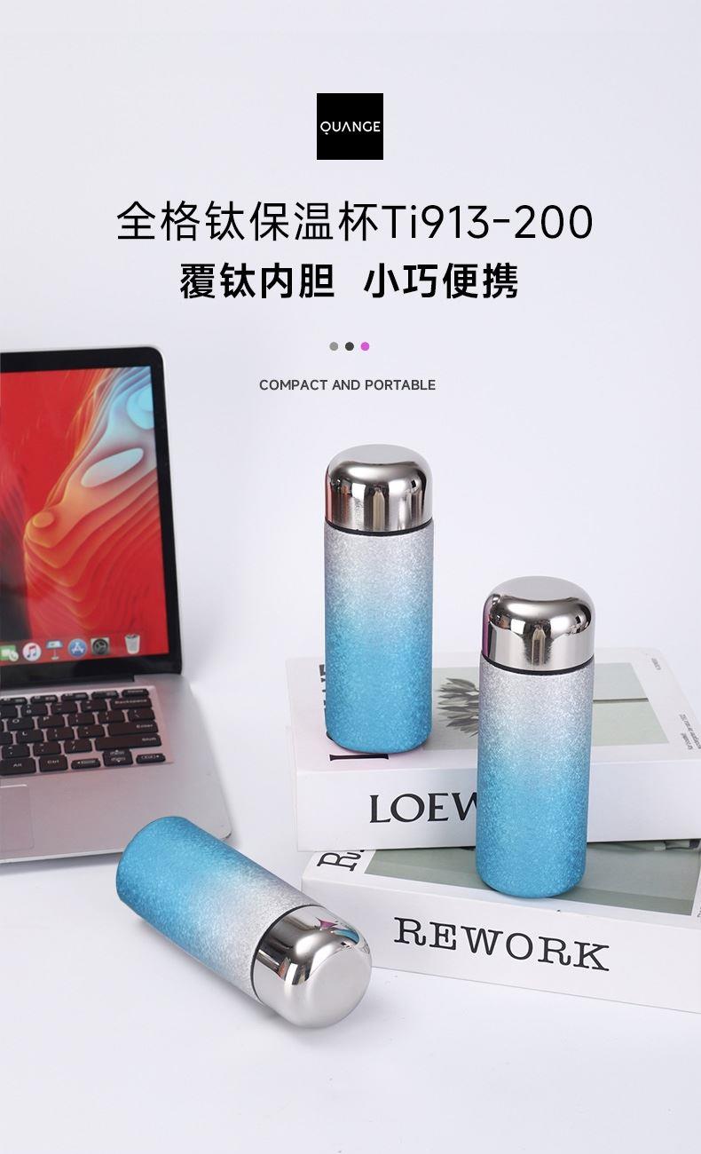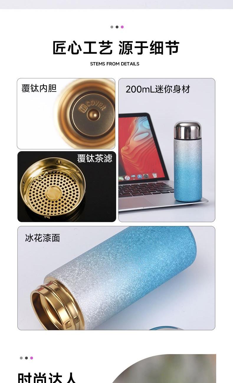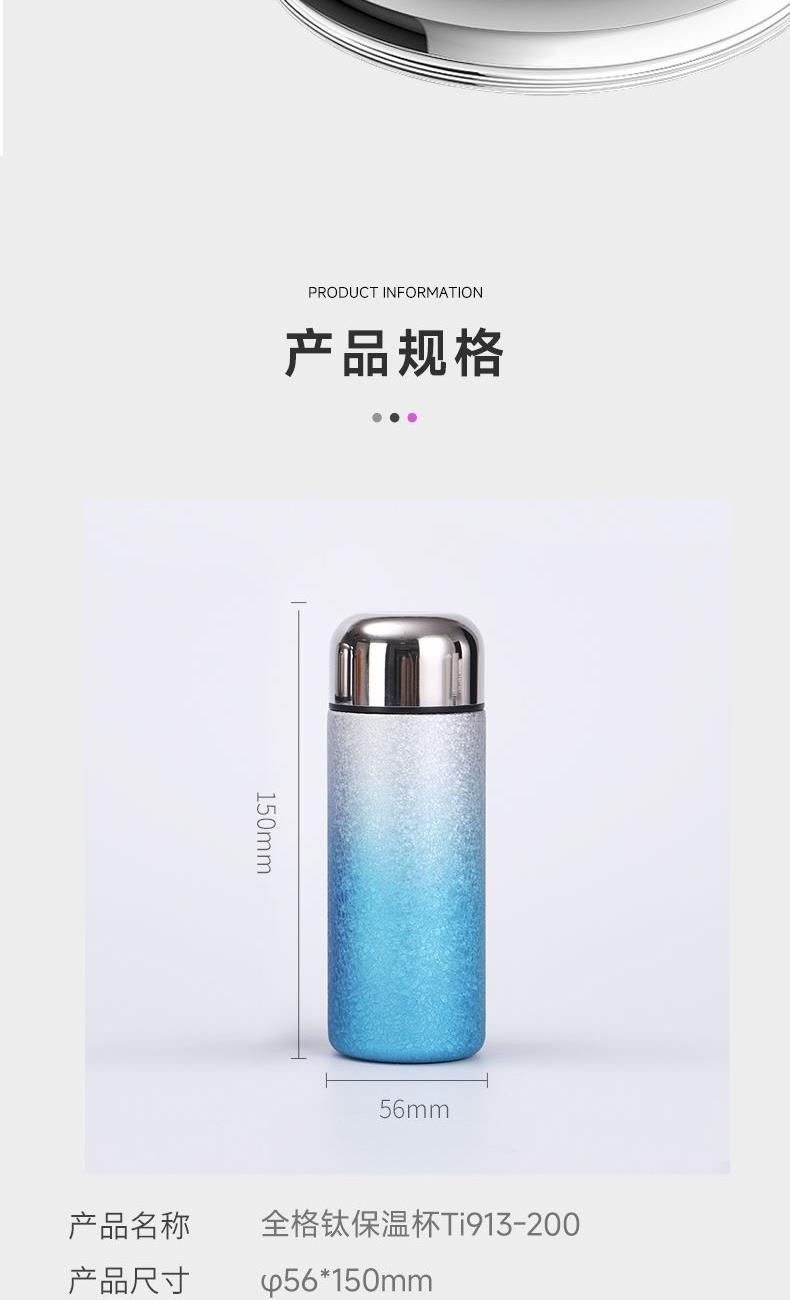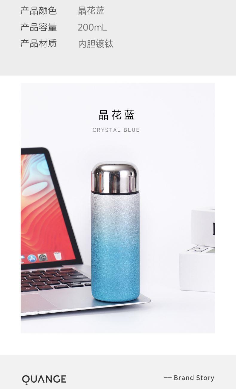 颜色:晶花蓝 容量:200mL 材质:内胆、茶滤SUS304+钛TA1(镀钛);杯盖:SUS304,杯盖:PP,密封圈:硅橡胶 产品尺寸:φ5.6*15cm 包装:彩盒,6*6*16.5cm 毛重:0.186kg 1. 200ml迷你杯,纤巧轻盈,携带方便 2. 镀钛内胆,长效保鲜,可以盛放各种饮品 3. 杯身水晶纹晶花漆工艺