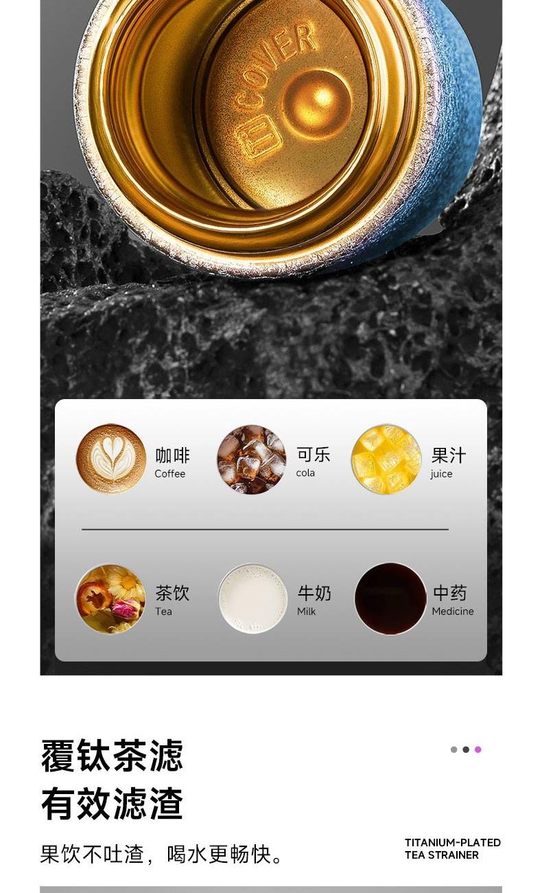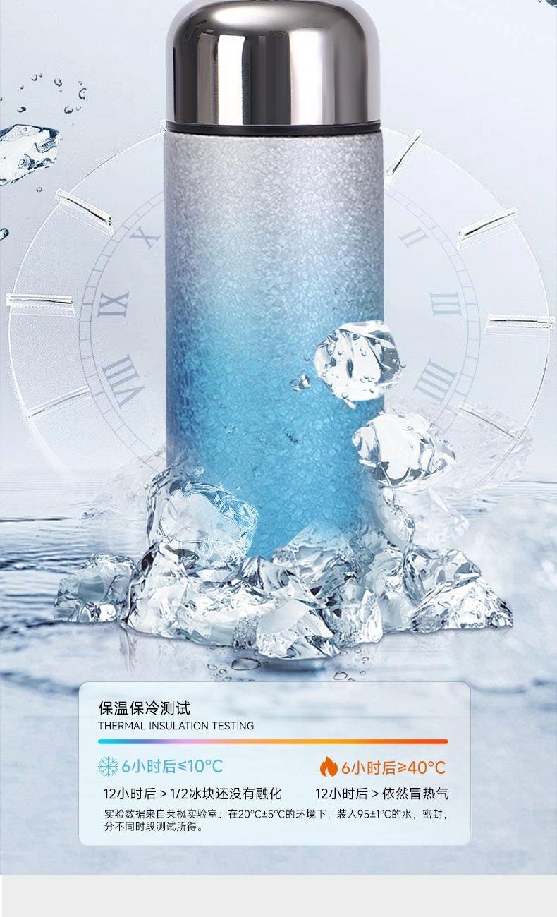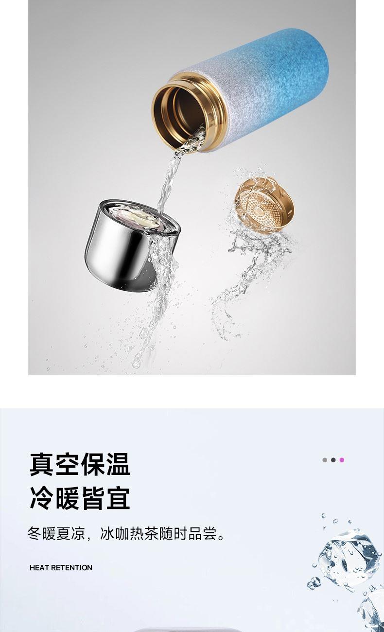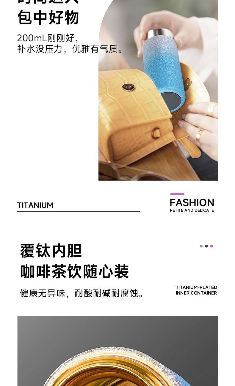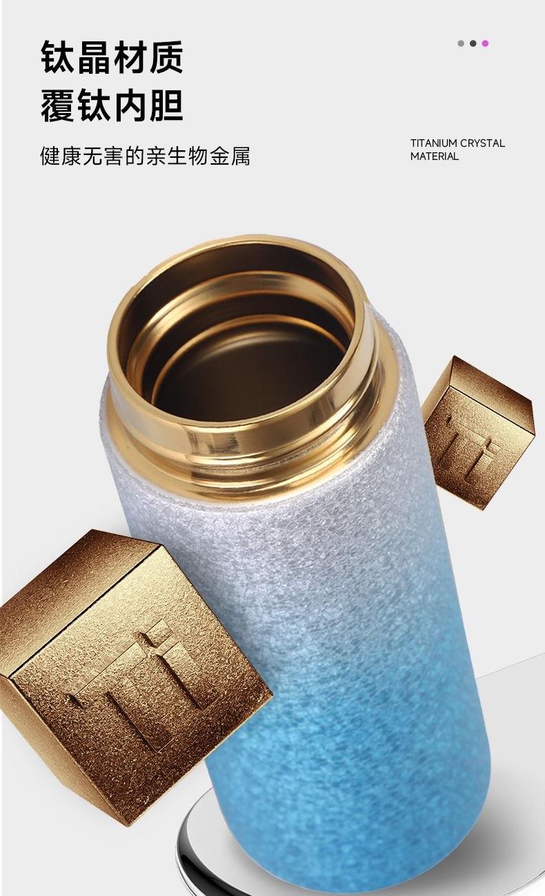 颜色:晶花蓝 容量:200mL 材质:内胆、茶滤SUS304+钛TA1(镀钛);杯盖:SUS304,杯盖:PP,密封圈:硅橡胶 产品尺寸:φ5.6*15cm 包装:彩盒,6*6*16.5cm 毛重:0.186kg 1. 200ml迷你杯,纤巧轻盈,携带方便 2. 镀钛内胆,长效保鲜,可以盛放各种饮品 3. 杯身水晶纹晶花漆工艺