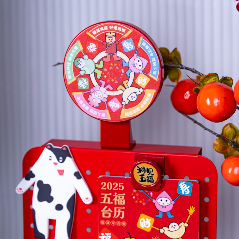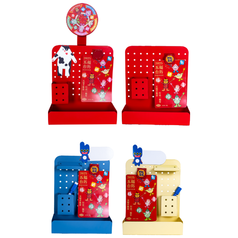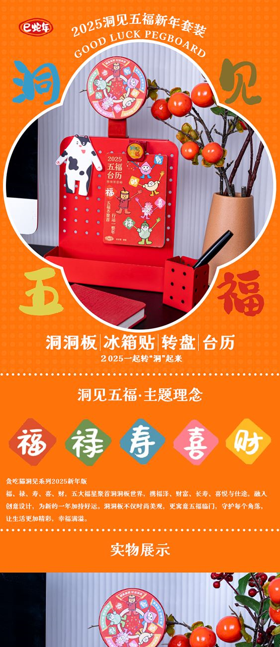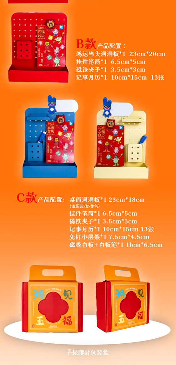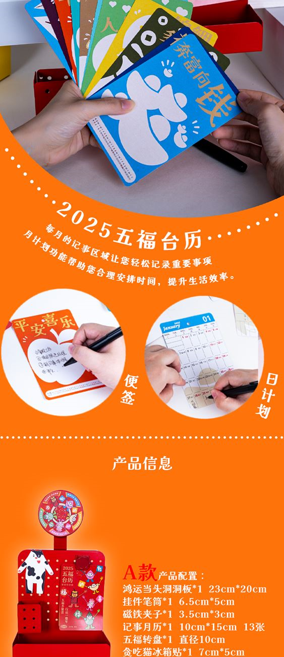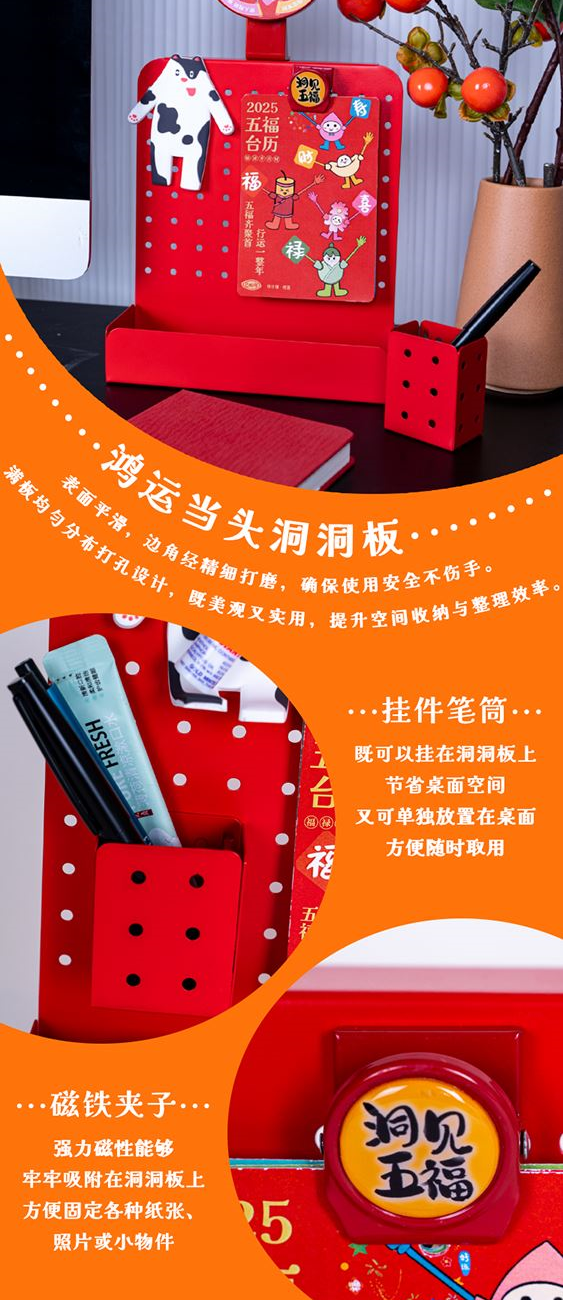 鸿运当头洞洞板*1 23cm*20cm 挂件笔筒*1 6.5cm*5cm 磁铁夹子*1 3.5cm*3cm 记事月历*1 10cm*15cm 13张 五福转盘*1 直径10cm 贪吃猫冰箱贴*1 7cm*5cm 包装盒尺寸:27.5*23.3*10.5cm