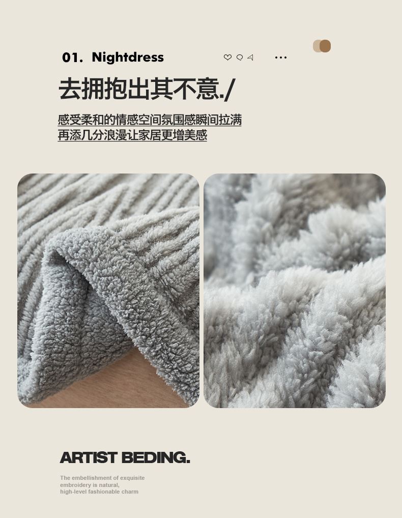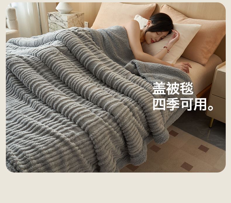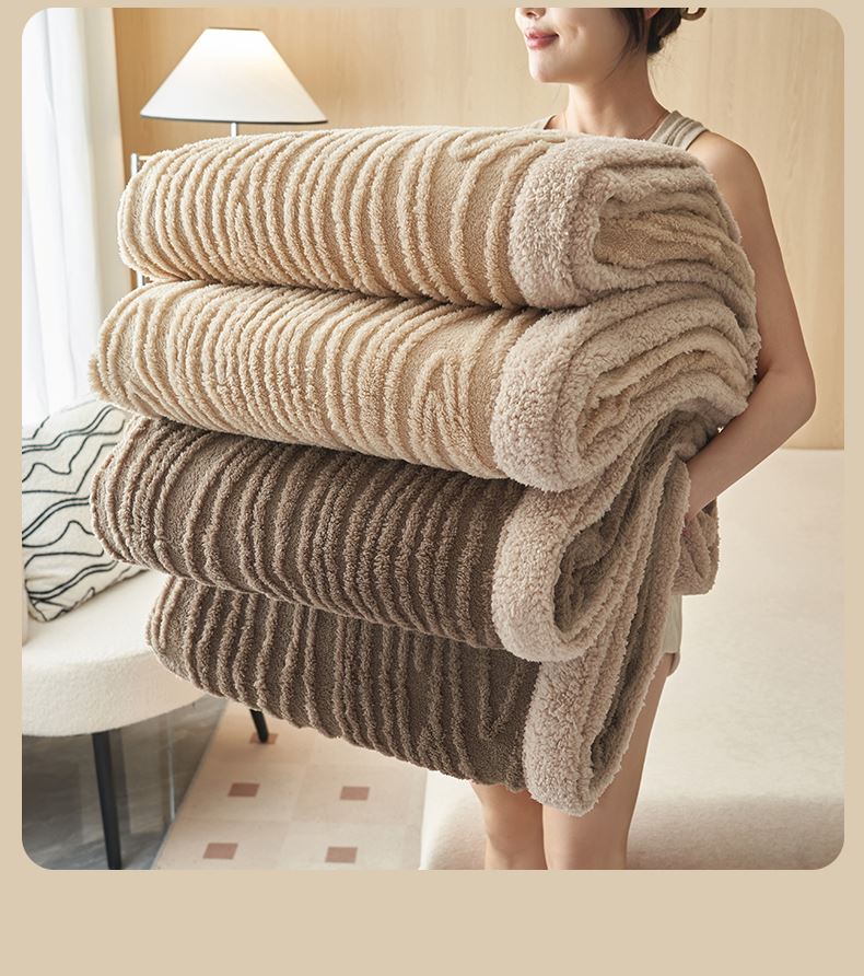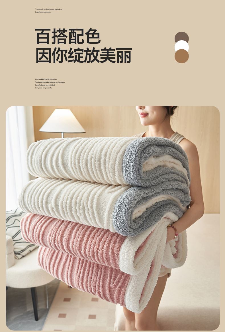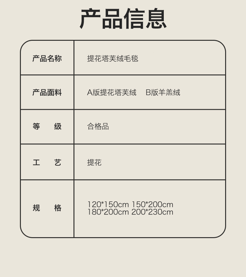 规格:150*200cm 面料:聚酯纤维 花色:乐享生活-深咖、乐享生活-灰、乐享生活-驼色、乐享生活-奶白、乐享生活-墨绿、乐享生活-豆沙 A版提花塔芙绒,加厚塔芙绒,纤维细长,不易掉毛,保暖透气,轻抚绒面是轻柔的温暖。B版羊羔绒,仿佛羊绒的软糯质感,像被云朵包裹着,保暖蓄热效果更好