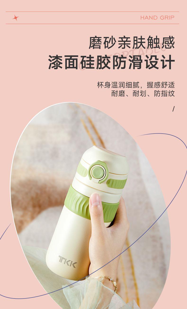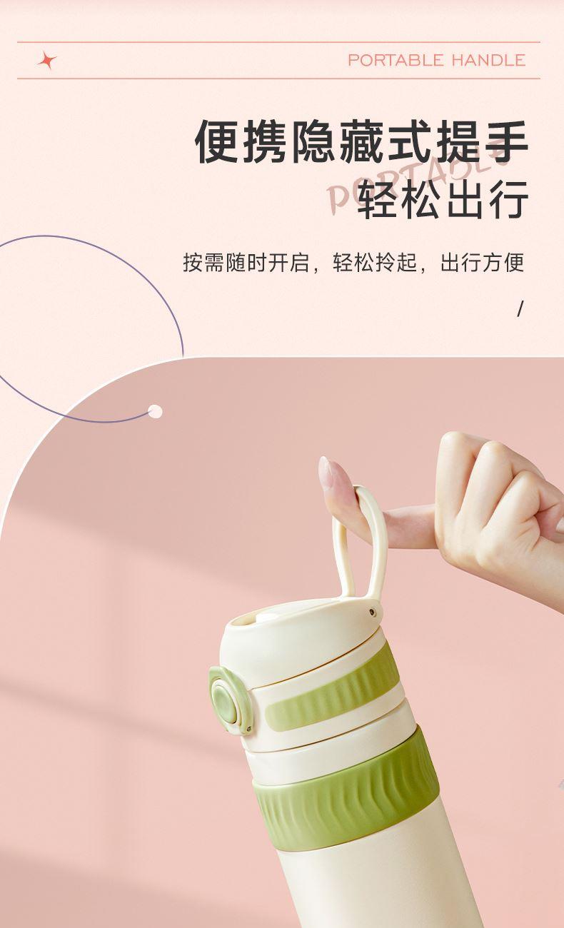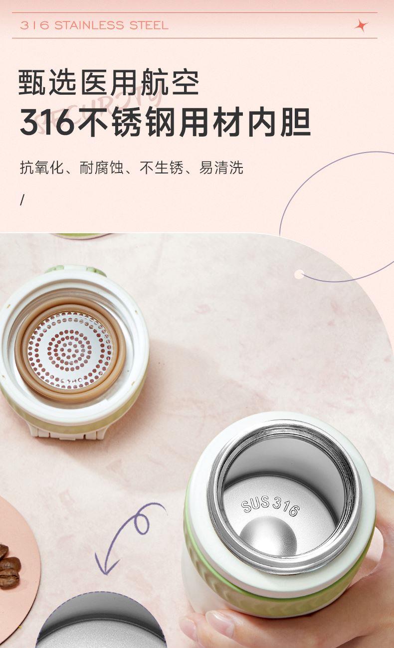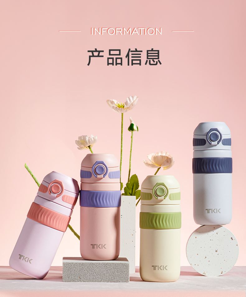 杯身材质:316不锈钢 杯盖材质:PP+TPE 杯套材质:硅胶 商品净重:306g ★ 316不锈钢用材内胆,耐腐蚀、不锈钢、易清洗 ★ 单手一键开盖,给你愉快补水体验感 ★ 便捷隐藏式提手,节省空间,生活品质好物 ★ 长效保温锁鲜,留住咖啡醇正风味,给您全天的温暖呵护 ★ 杯身温润细腻,磨砂亲肤触感,漆面硅胶防滑设计,握感舒适,耐磨耐划、防指纹 ★ 密封防漏,出行充满安全感 ★ 杯底配置防滑垫,放置静音,防滑不怕倒