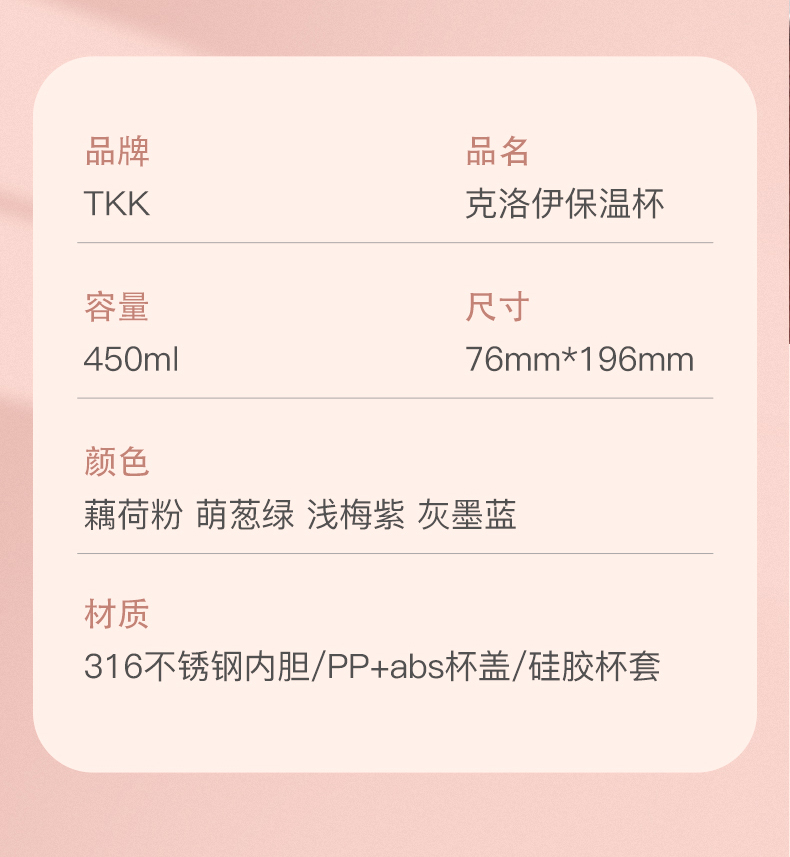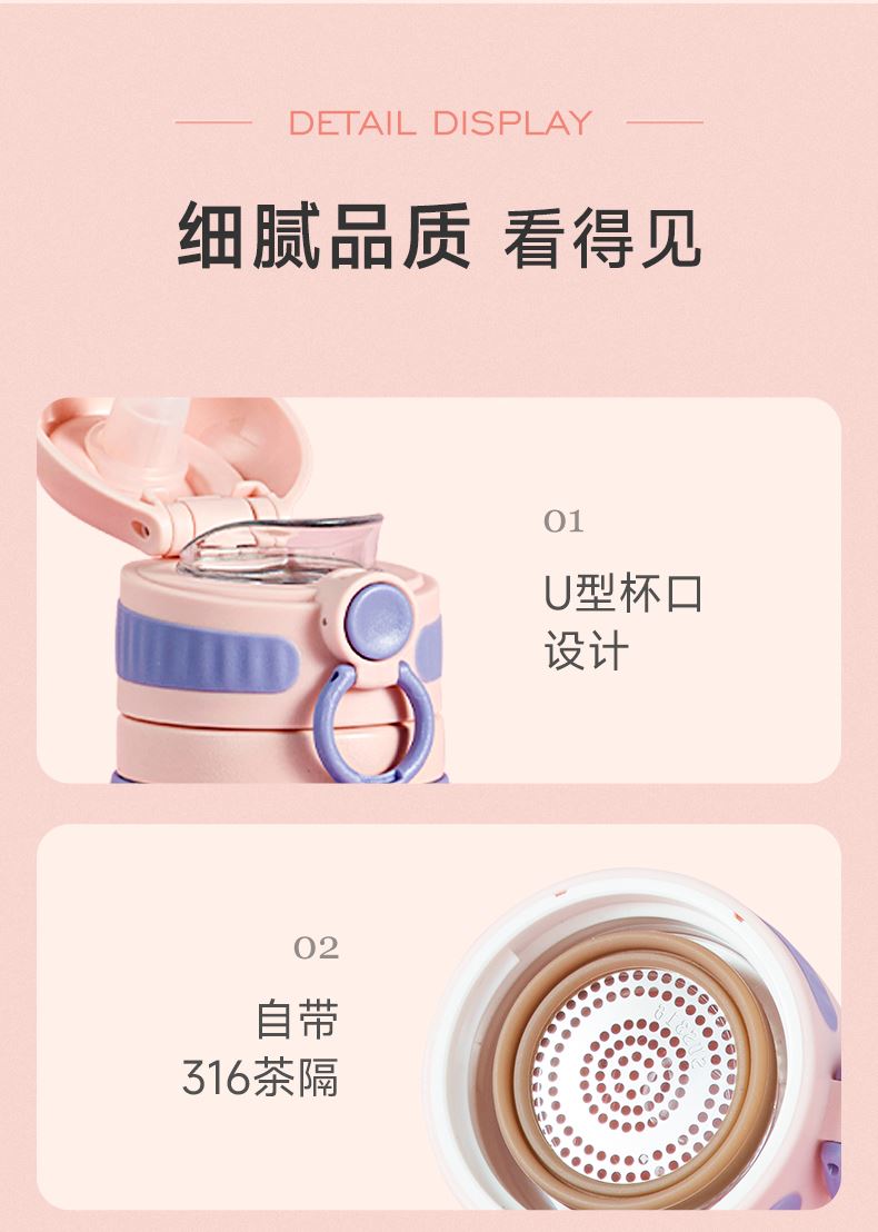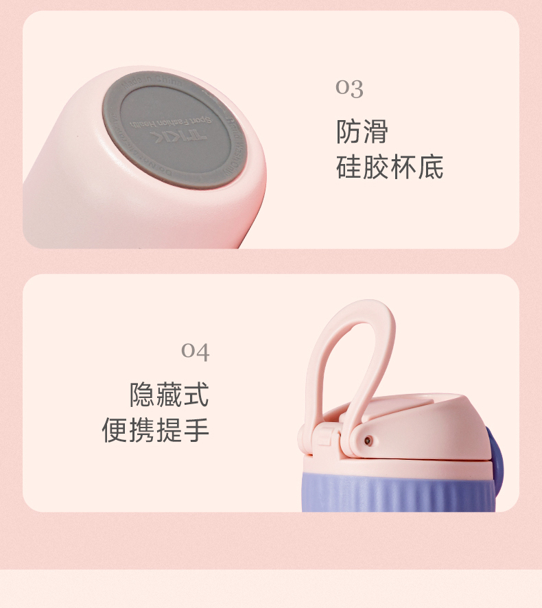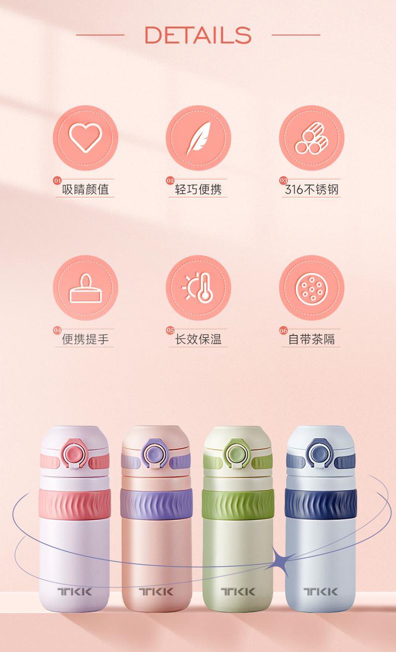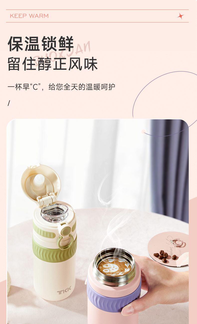 杯身材质:316不锈钢 杯盖材质:PP+TPE 杯套材质:硅胶 商品净重:306g ★ 316不锈钢用材内胆,耐腐蚀、不锈钢、易清洗 ★ 单手一键开盖,给你愉快补水体验感 ★ 便捷隐藏式提手,节省空间,生活品质好物 ★ 长效保温锁鲜,留住咖啡醇正风味,给您全天的温暖呵护 ★ 杯身温润细腻,磨砂亲肤触感,漆面硅胶防滑设计,握感舒适,耐磨耐划、防指纹 ★ 密封防漏,出行充满安全感 ★ 杯底配置防滑垫,放置静音,防滑不怕倒