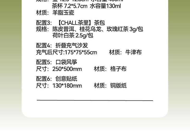 礼盒配置:折叠收纳箱*1 陶瓷杯壶两件套* 1 【CHALL茶里】茶包*4 折叠充气沙发*1 口袋风筝*1、贴纸*1 产品规格:收纳箱-42*28*23cm 杯壶两件套-壶 12.5*12.6cm 容量 460ml 茶杯 7.2*5.7cm 水容量130ml 充气沙发-充气后尺寸:175*75*55cm 口袋风筝-250*500mm