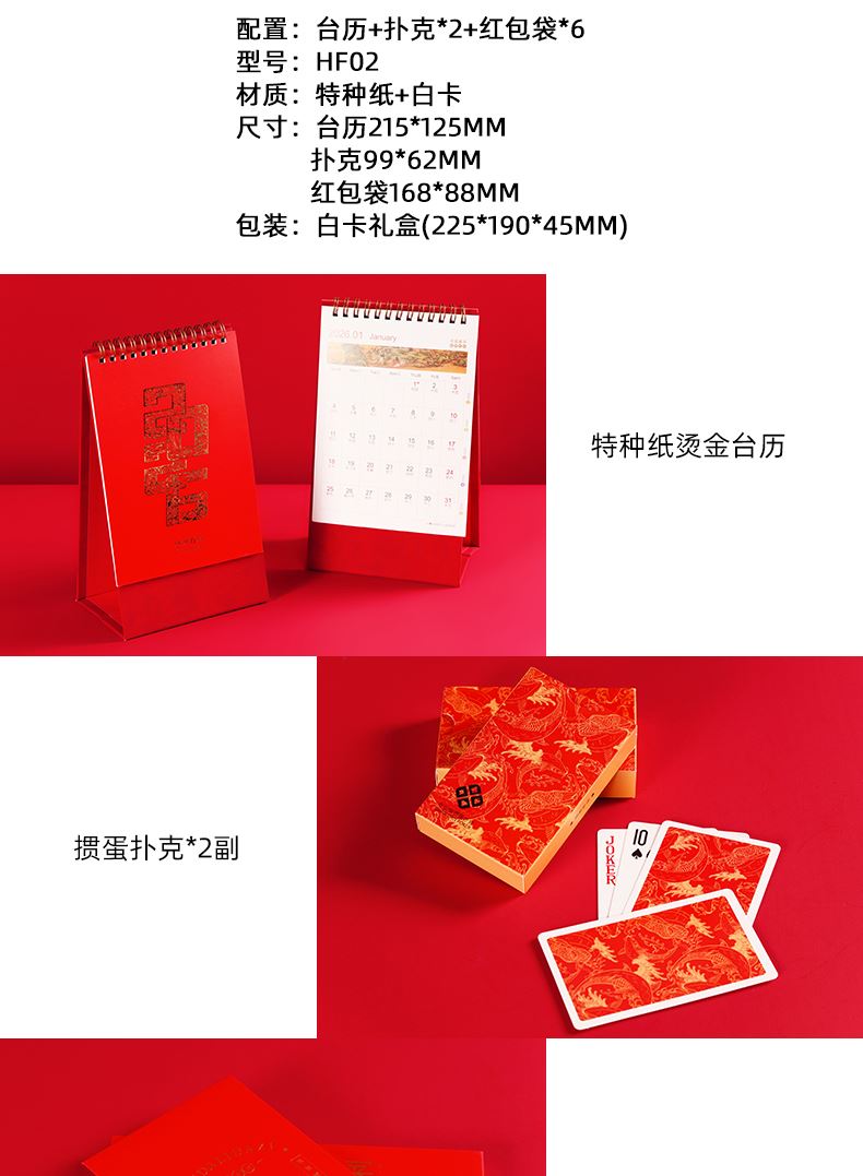 配置:台历+扑克*2+红包袋*6 型号:NF02 材质:特种纸+白卡 尺寸:台历215*125mm 扑克99*62mm 红包袋168*88mm 包装:白卡礼盒(225*190*45mm)
