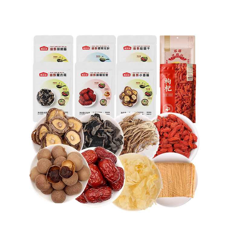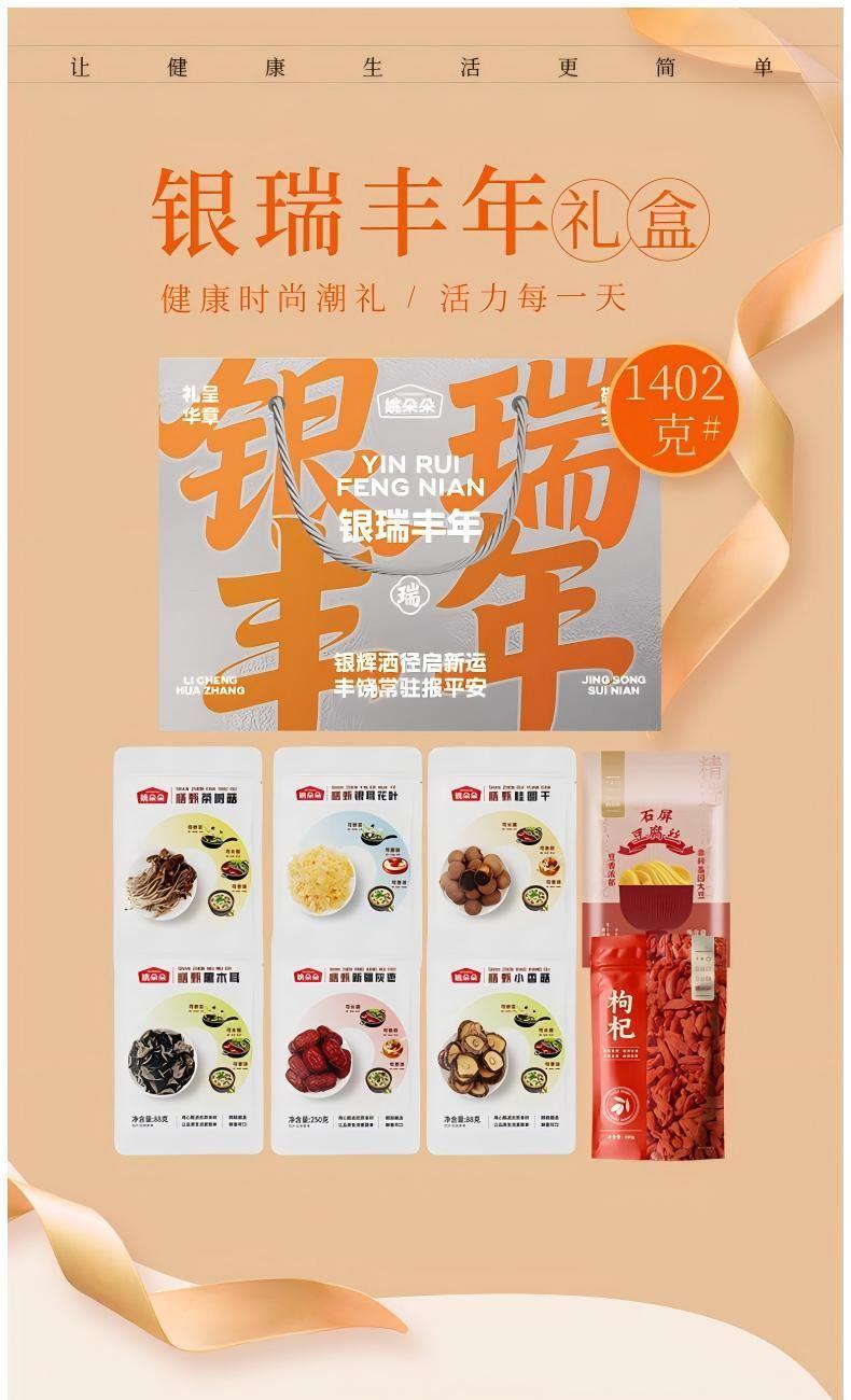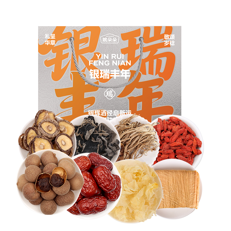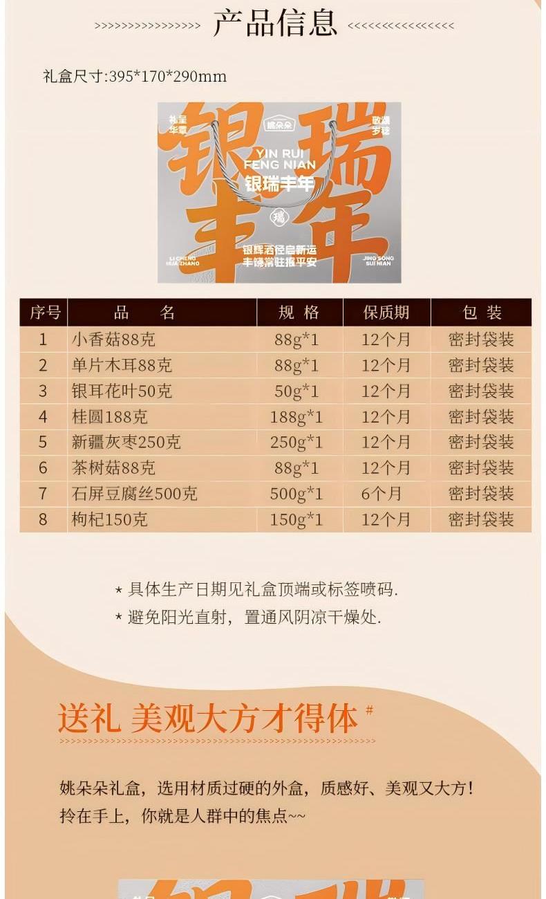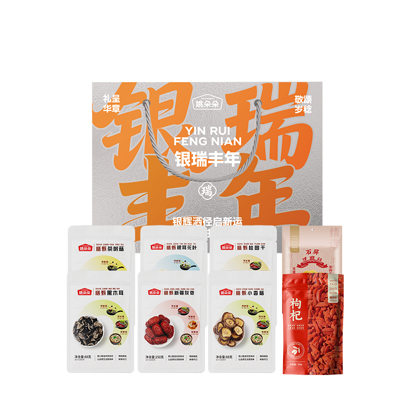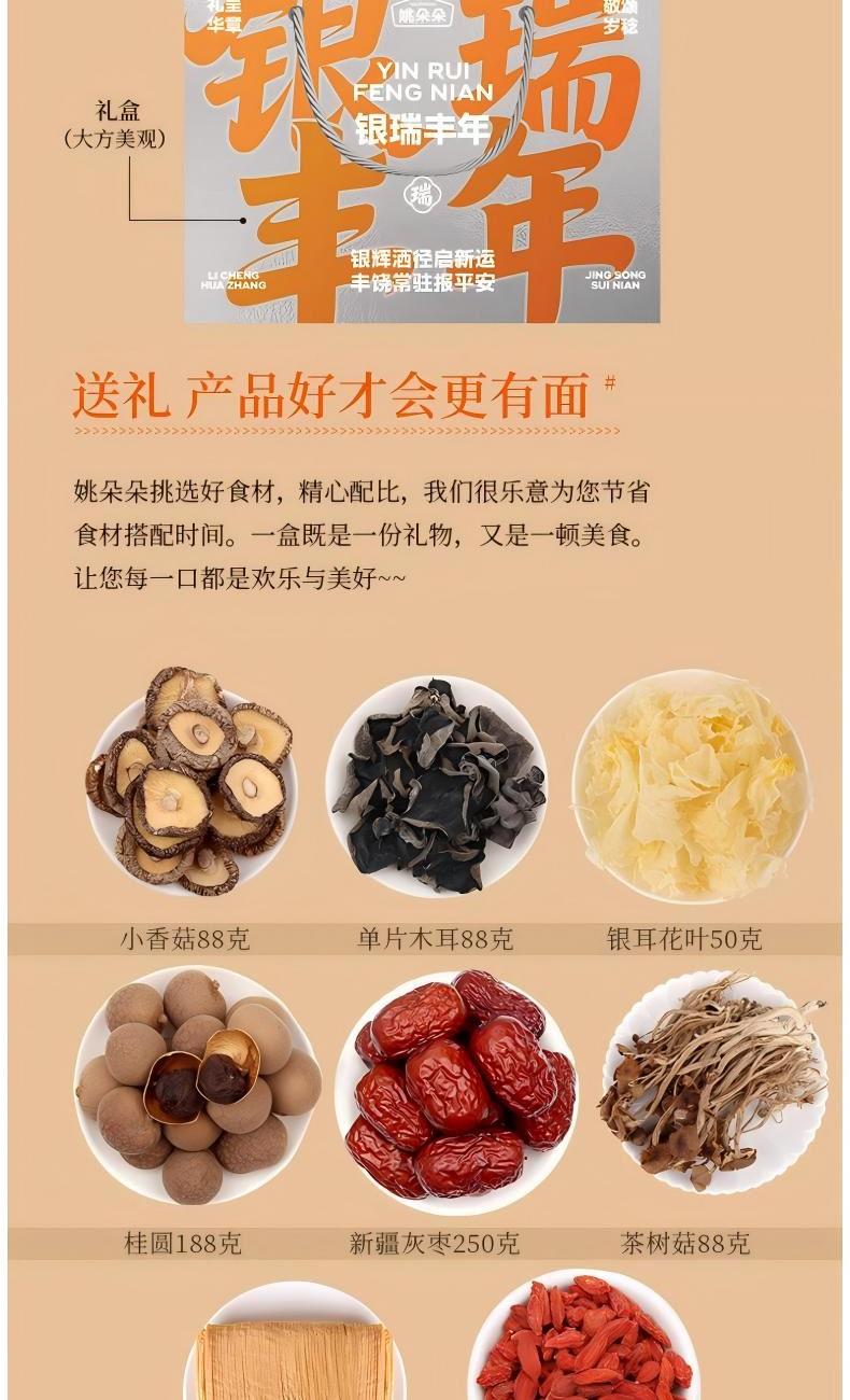 姚朵朵小香菇88克 姚朵朵单片木耳88克 姚朵朵银耳花叶50克 姚朵朵桂圆188克 姚朵朵新疆灰枣250克 姚朵朵茶树菇88克 姚朵朵石屏豆腐丝500克 枸杞150克(优选) 包装盒-银瑞丰年