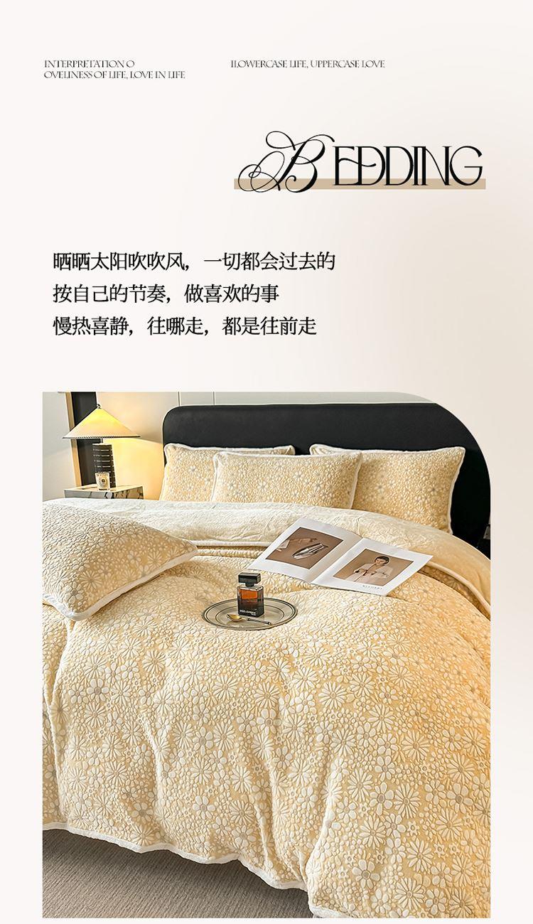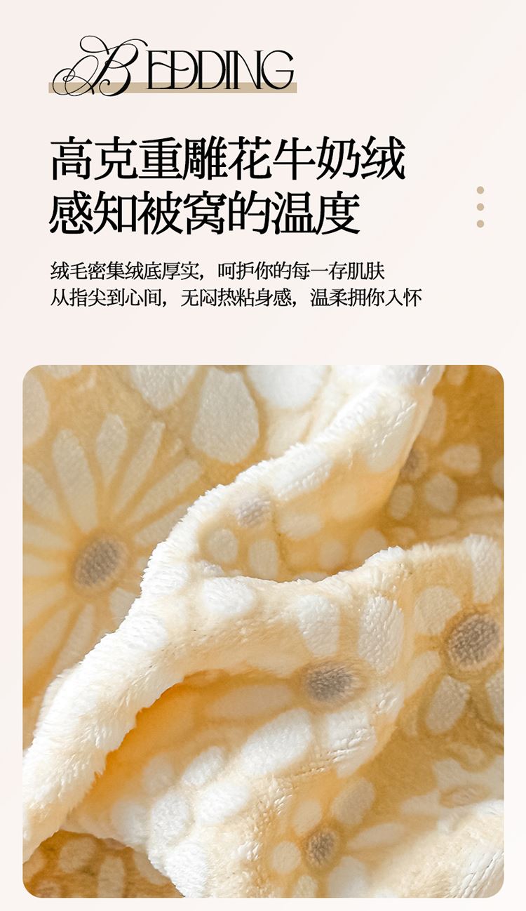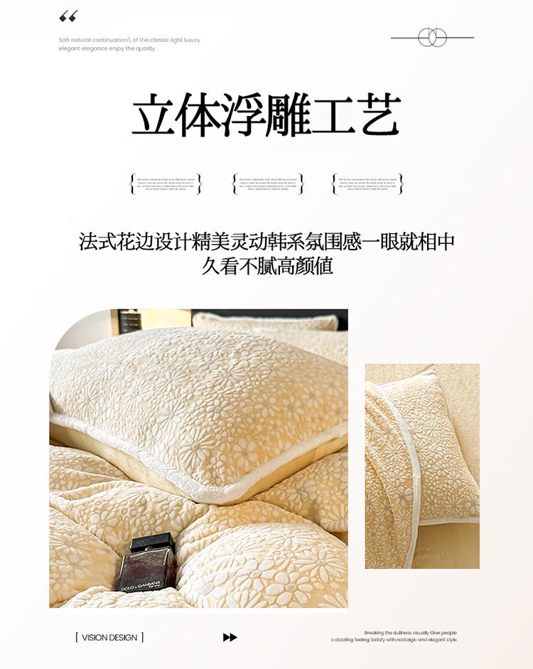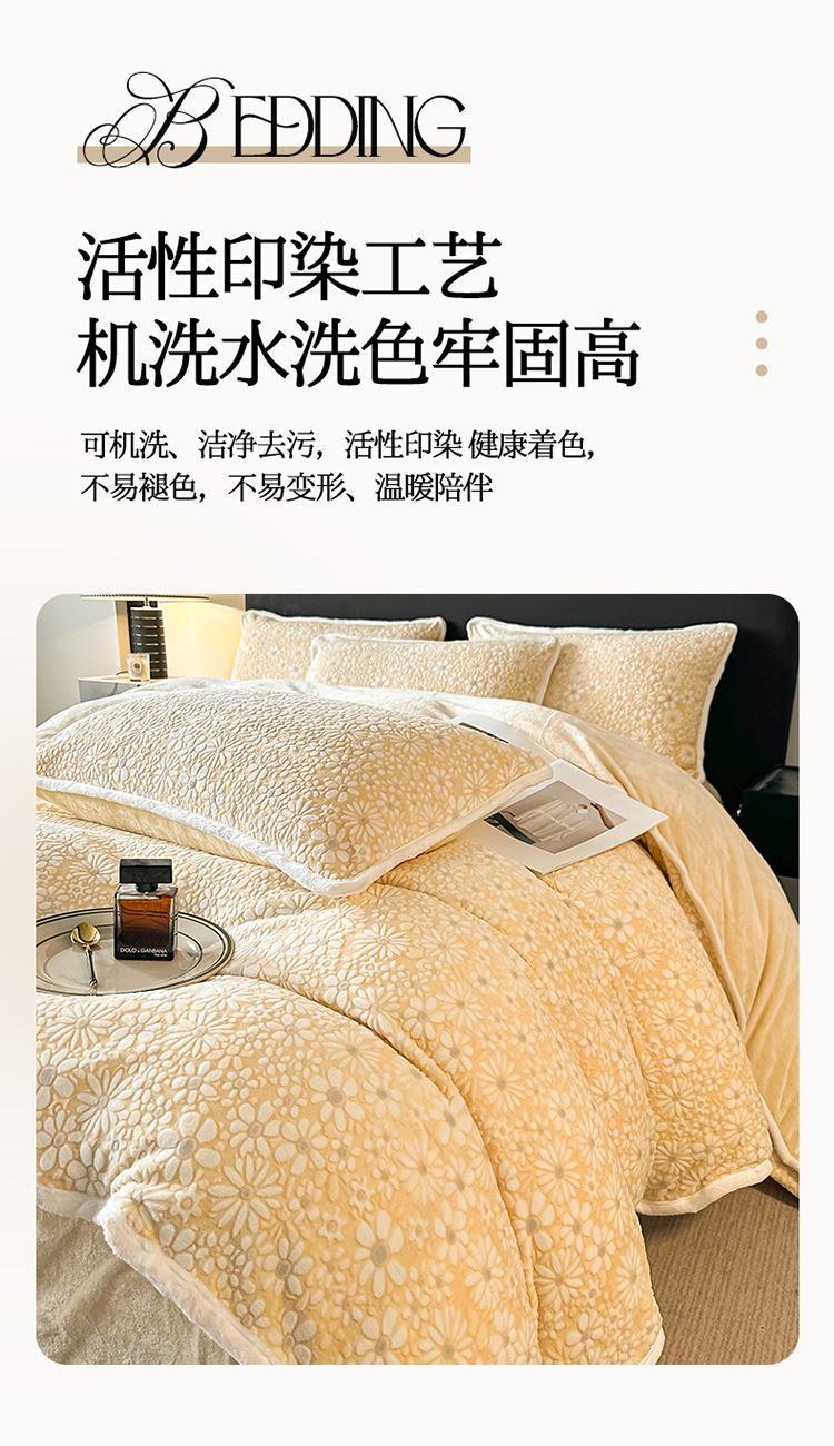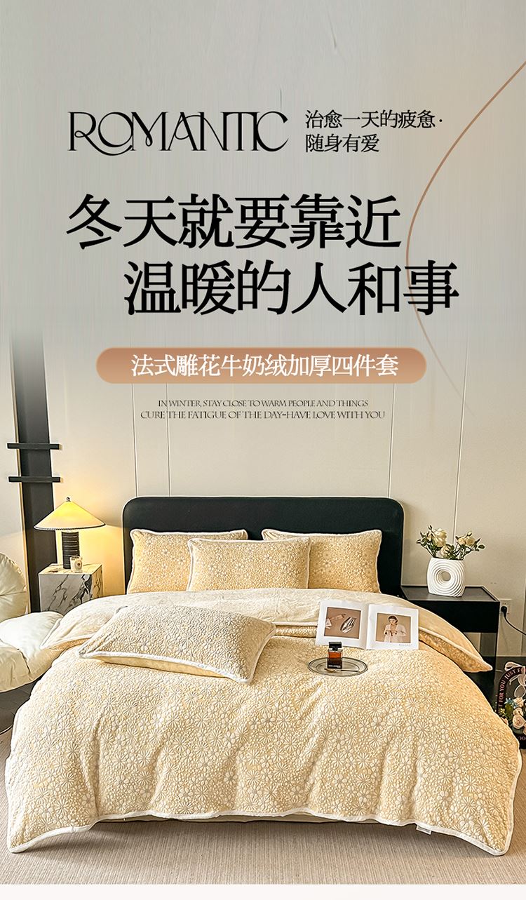 1:冬季温暖的秘密 加厚雕花牛奶绒蓄热保暧法式包边颜值出众 物理防静电安心睡眠活性印染可机洗水洗 2:高克重雕花牛奶绒感知被窝的温度 绒毛密集绒底厚实,呵护你的每一存肌肤从指尖到心间,无闷热粘身感,温柔拥你入怀 尺寸:被套200*230cm*1 床单:245*250cm*1 枕套:48*74cm*2 包装:礼袋