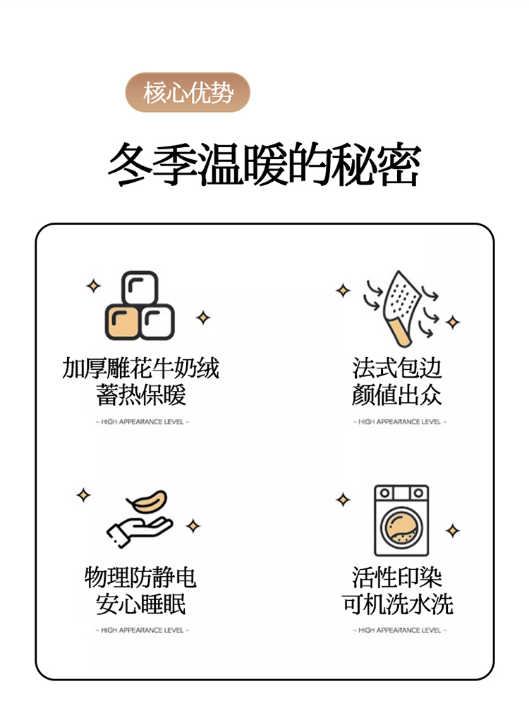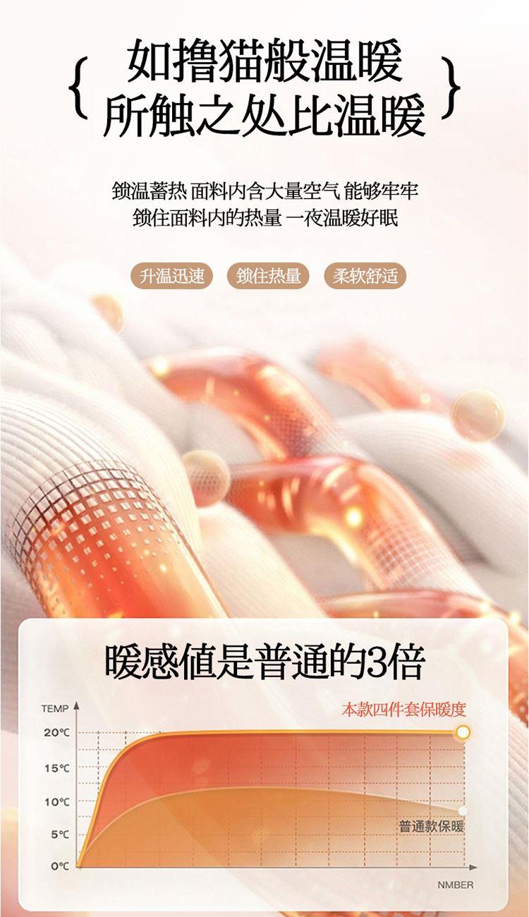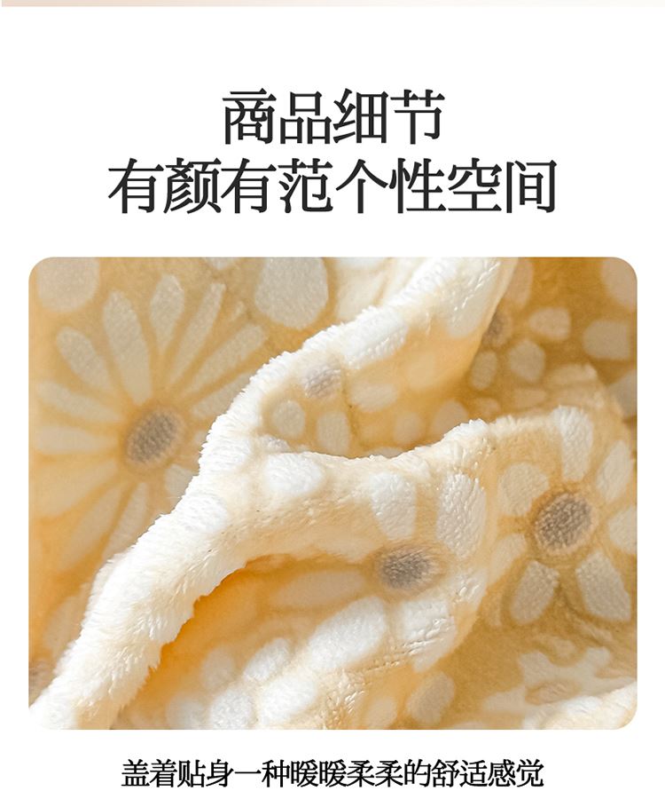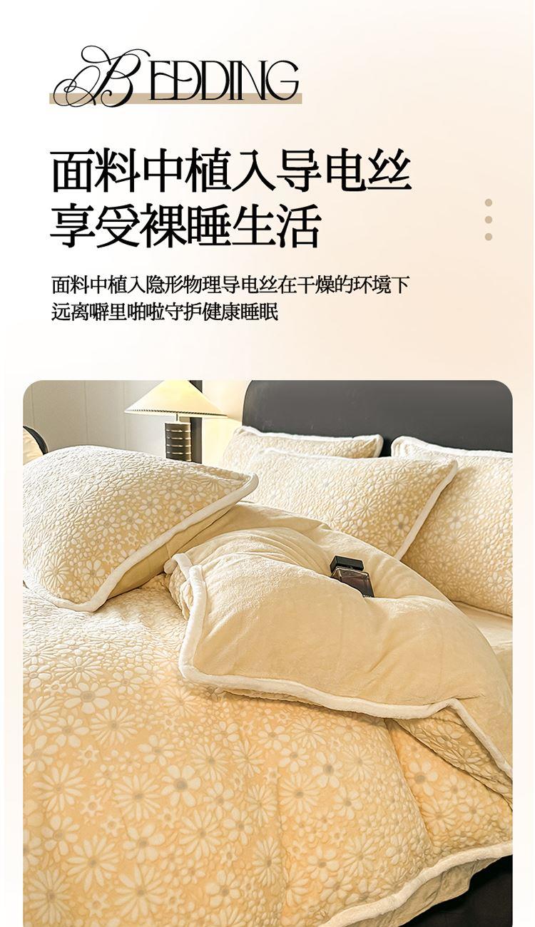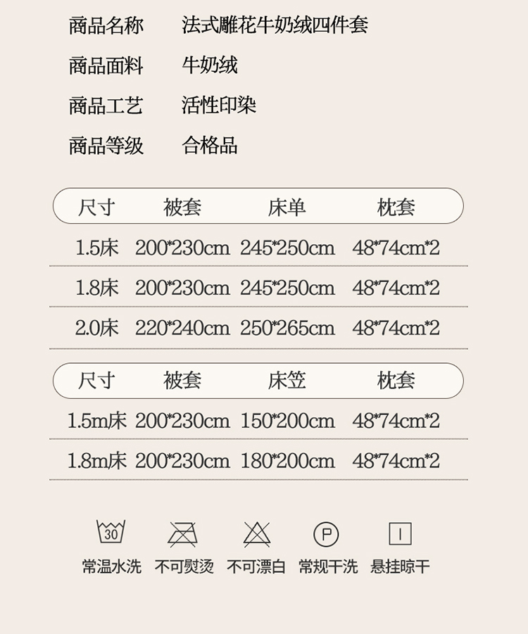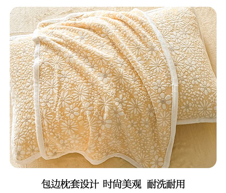 1:冬季温暖的秘密 加厚雕花牛奶绒蓄热保暧法式包边颜值出众 物理防静电安心睡眠活性印染可机洗水洗 2:高克重雕花牛奶绒感知被窝的温度 绒毛密集绒底厚实,呵护你的每一存肌肤从指尖到心间,无闷热粘身感,温柔拥你入怀 尺寸:被套200*230cm*1 床单:245*250cm*1 枕套:48*74cm*2 包装:礼袋