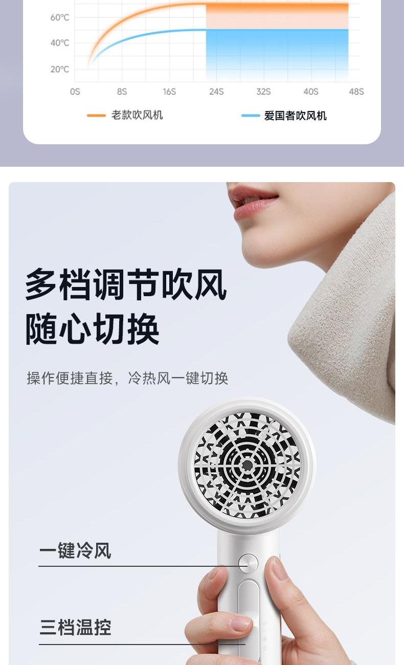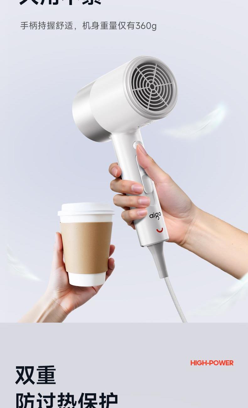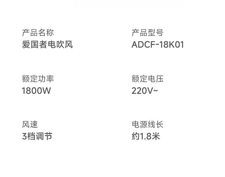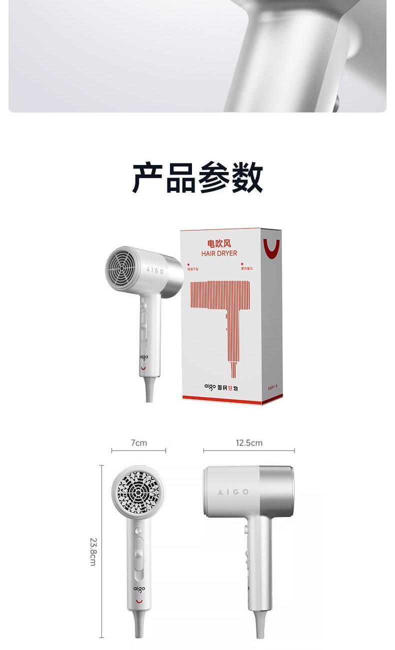 1800W大功率,有快速干发功能 独特的健康护发功能,防止头发过干而受损 柔和暖风,适合吹干头发或定型 本电吹风附赠风嘴,便于准 确定型 2档2温设计,贴合更多使用场景 带独立冷风按钮,一键切换 功率:1800W 包装尺寸:135*80*260mm 包装方式:彩邮外