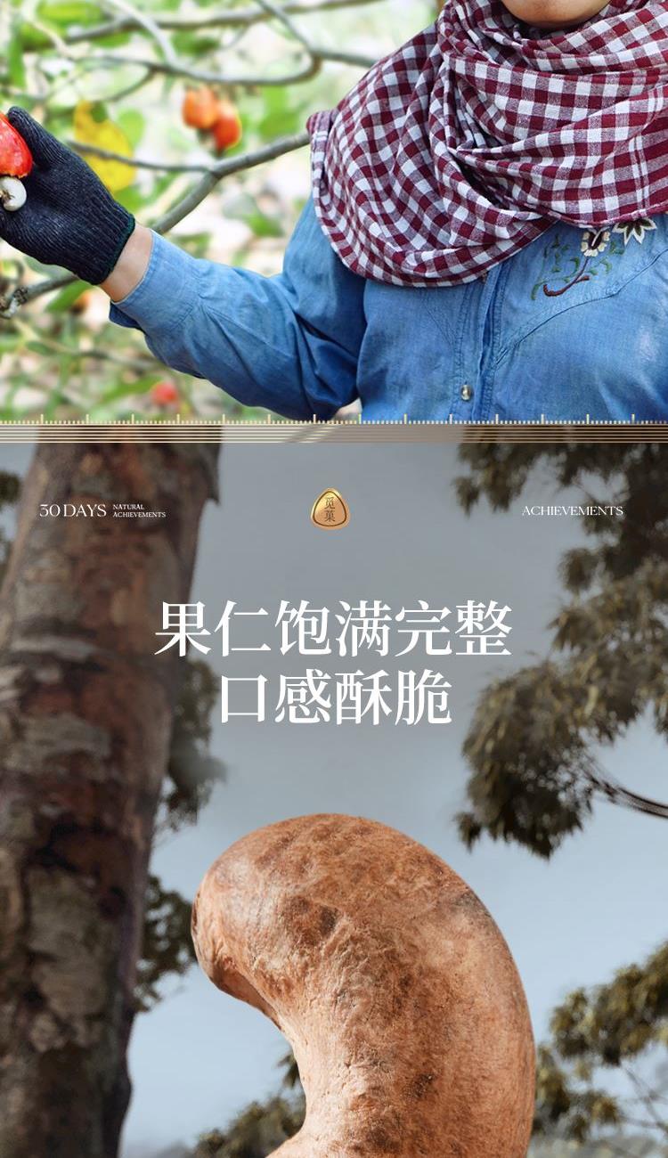 产地大不同 热带季风带 全年逾2000小时光合作用 富饶红砂土孕育丰盈大果 品种大不同 柬埔寨高产PN1腰果品种 技术更迭见证质量产量双增长 柬埔寨全新树种果实约180颗/磅 刷新传统颗粒标准 口感大不同 低温烘焙锁住醇厚酯香 酥脆绵香 香甜酥脆