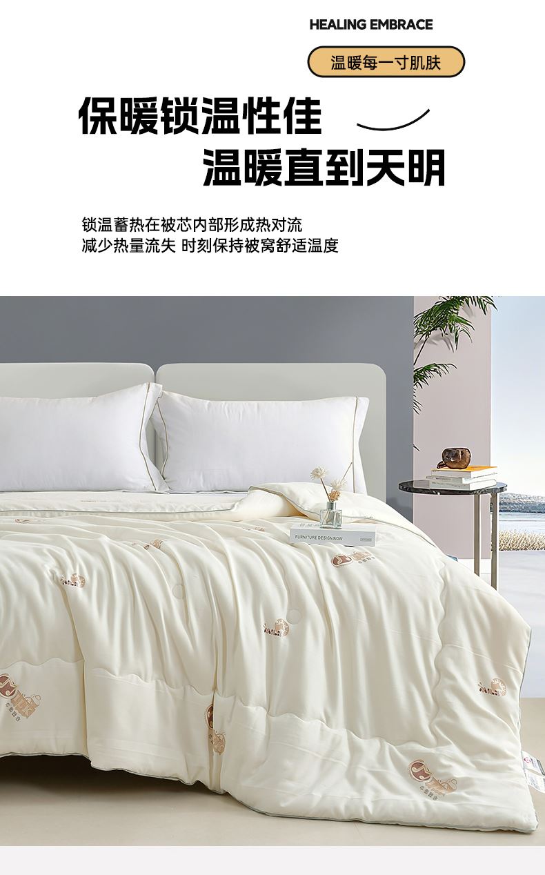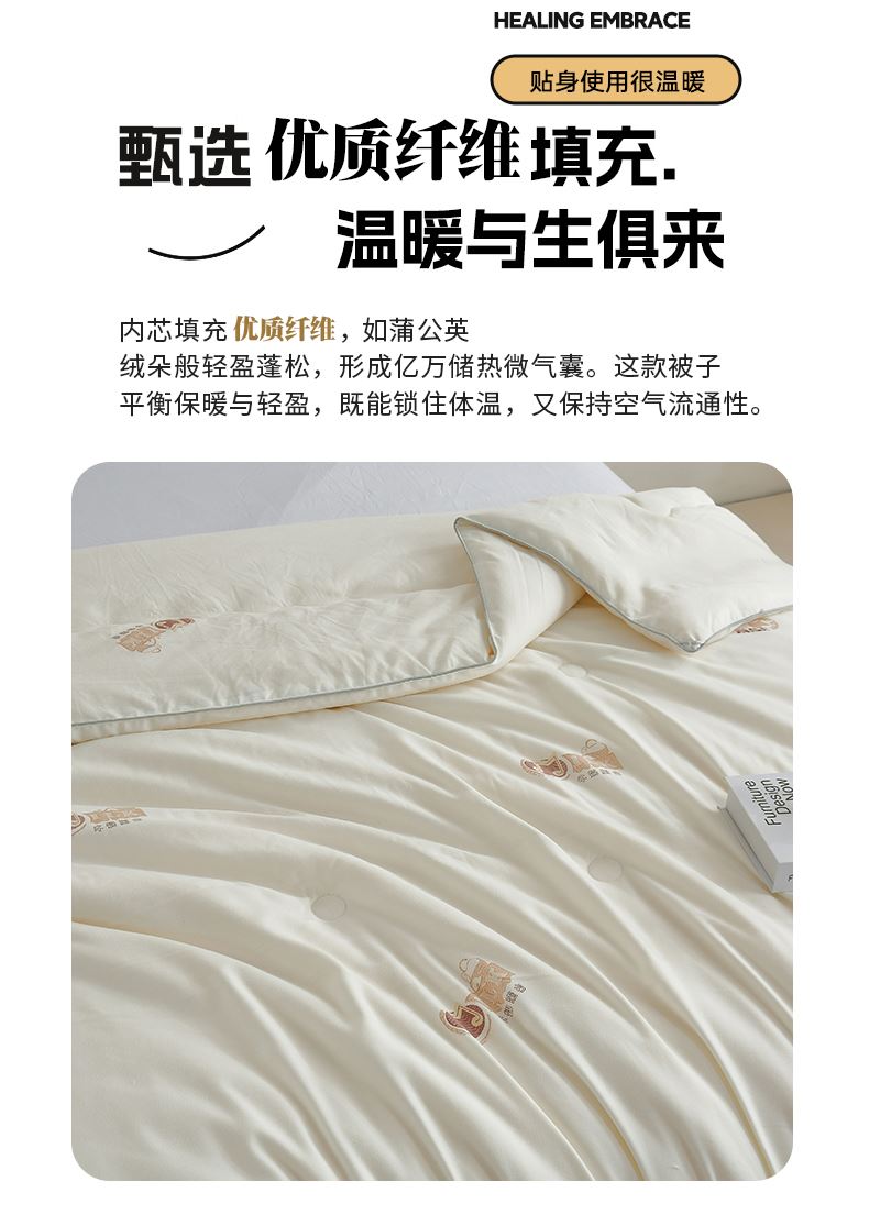 2.内芯填充优质羽丝棉,数千万根超细纤维如蒲公英绒朵般轻盈蓬松,形成亿万储热微气囊。不同于普通冬被的厚重压身,这款被子平衡保暖与轻盈,既能牢牢锁住体温,又保持空气流通性,整夜保持干爽舒宜。