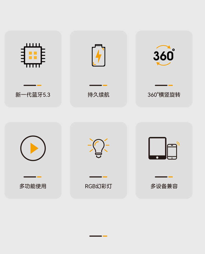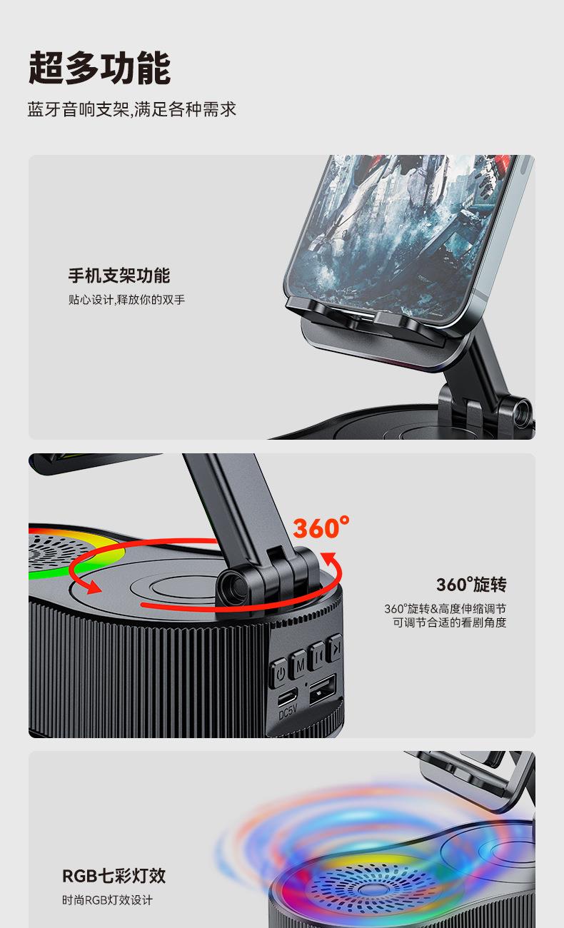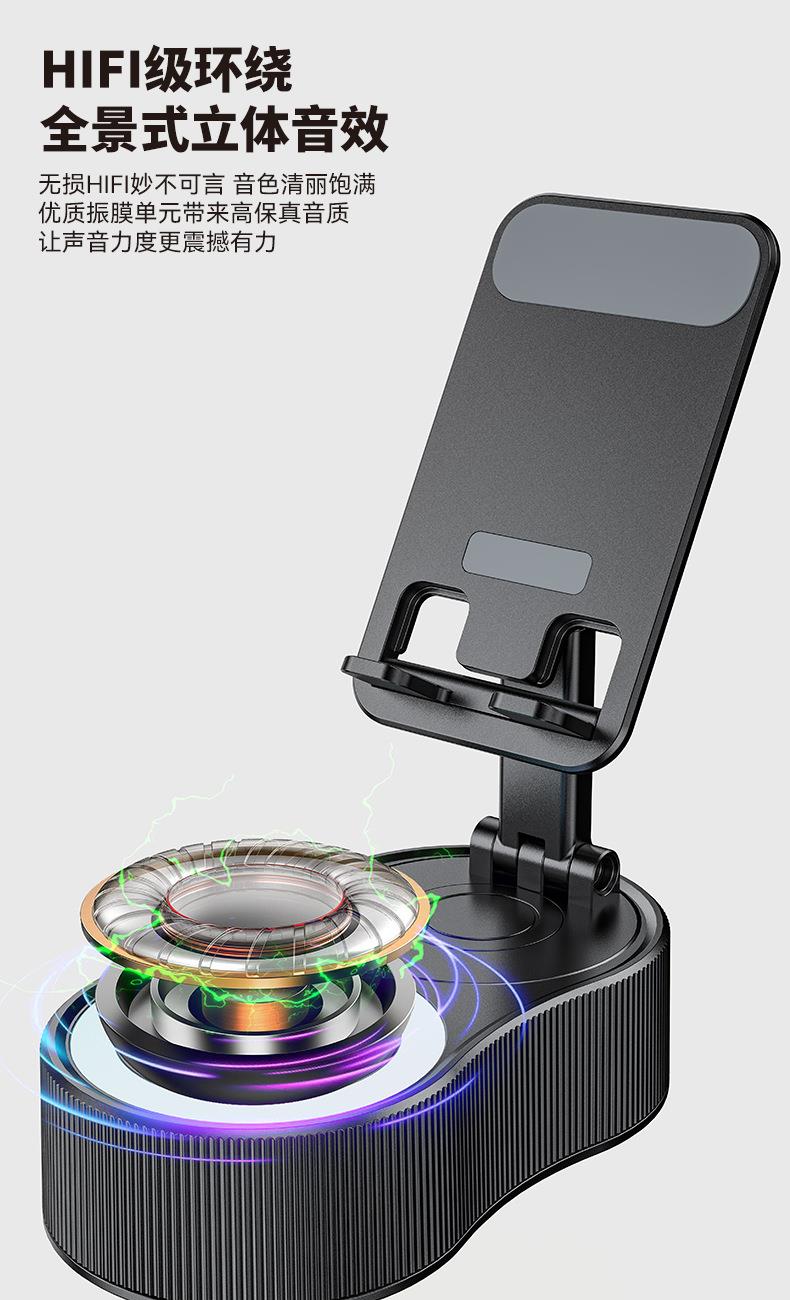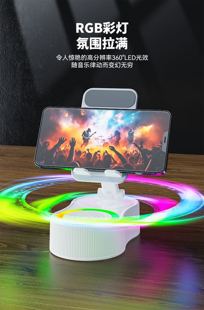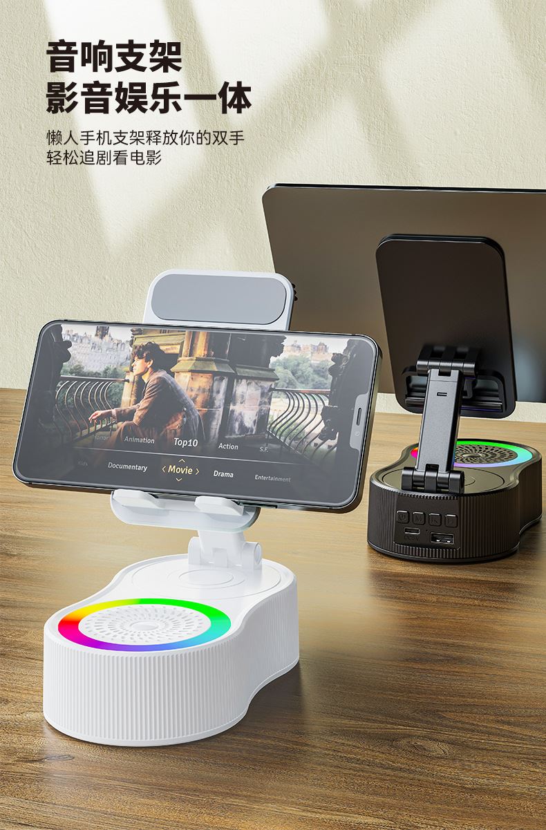 三合一手机支架炫彩无线蓝牙音响 型 号: WYS-2303BT 产品尺寸 :150*85*52mm 产品净重 :325g 材质 :ABS+硅胶 颜色 :白色,黑色, 电池容量:3000mAh 续航:8H RGB炫彩跑马灯多设备都兼容 360°无死角自由旋转手机平板均可使用 手机支架结合蓝牙音响功能更加强大 360度立体音质办公娱乐体验更加好 预留充电位,追剧娱乐两不误