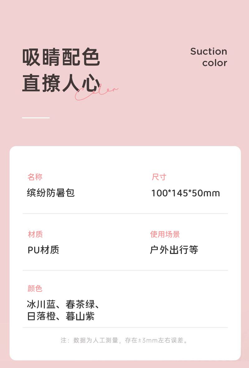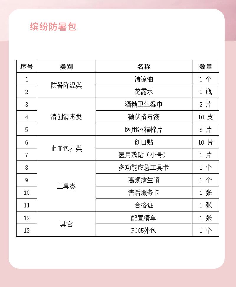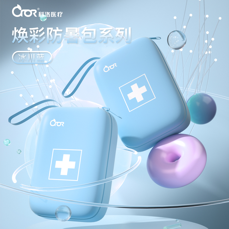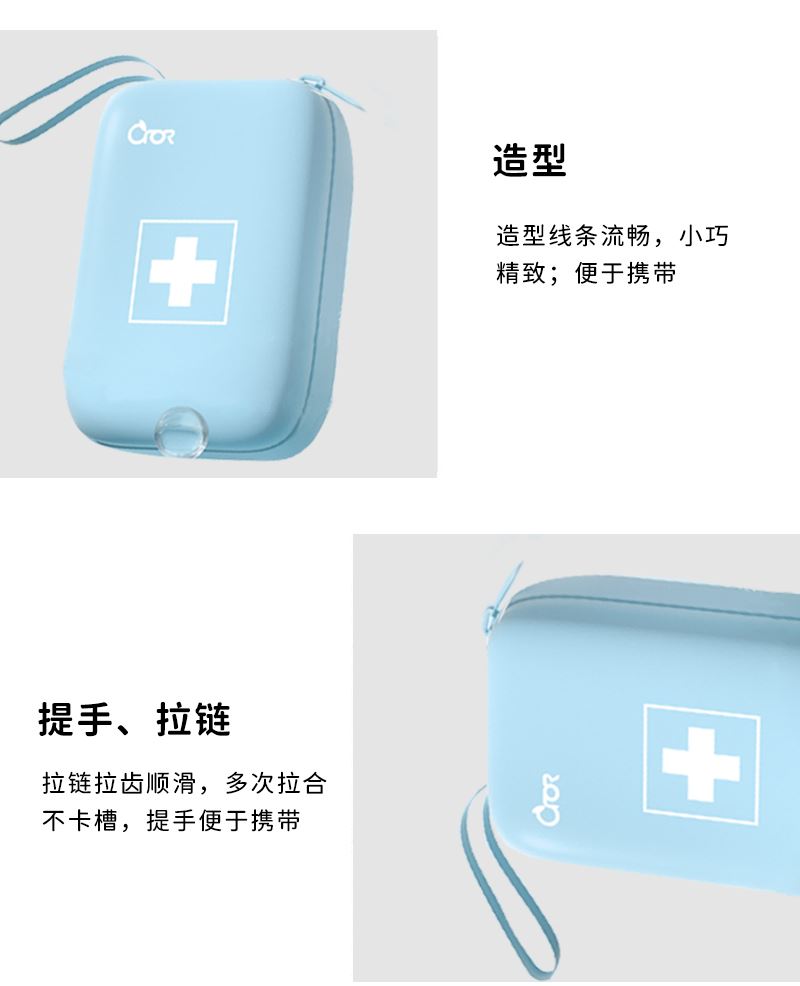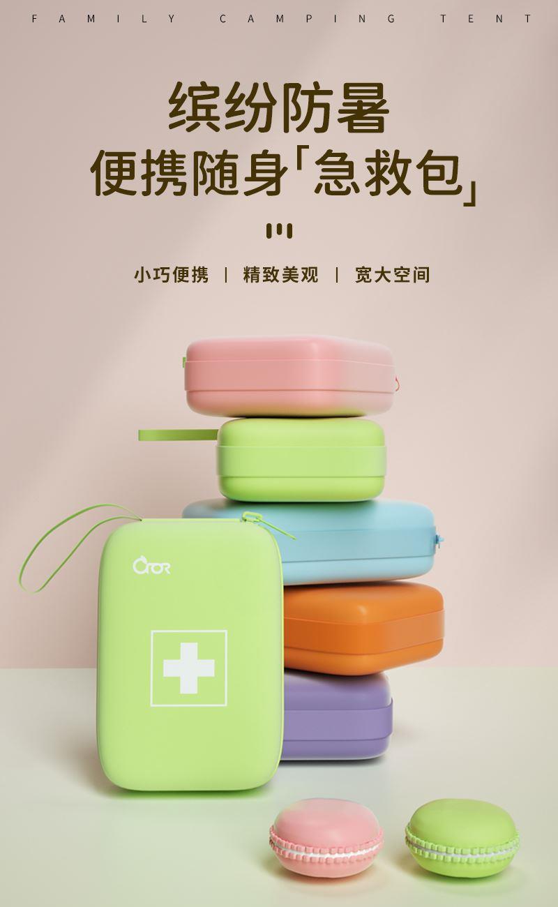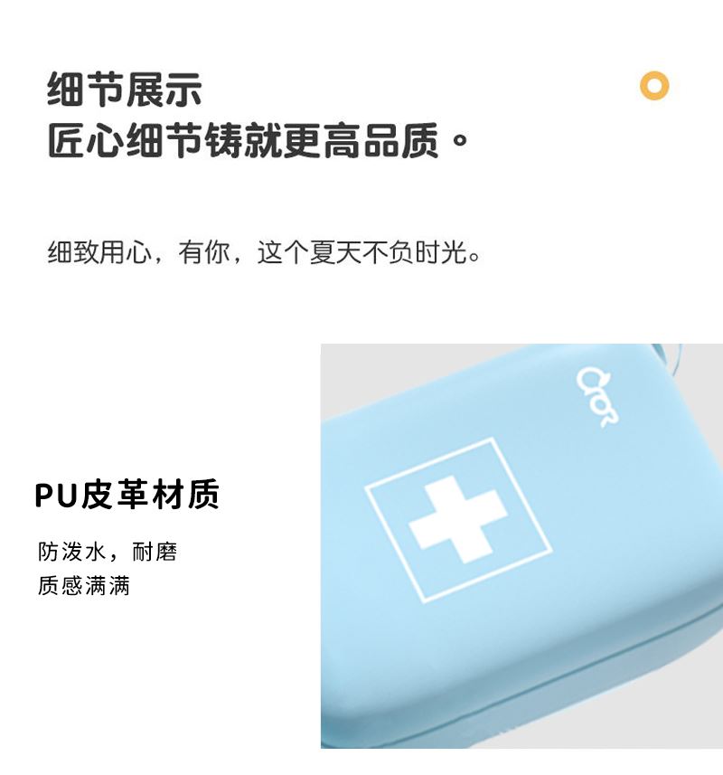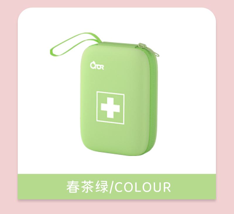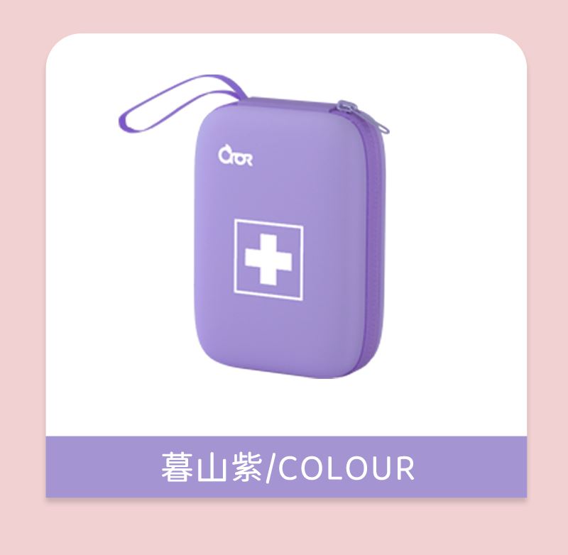 产品材质:PU革覆EVA 产品规格:145*100*45mm 产品颜色:暮山紫、冰川蓝、日落橙、春茶绿 产品配置:含5大类13种急救用品