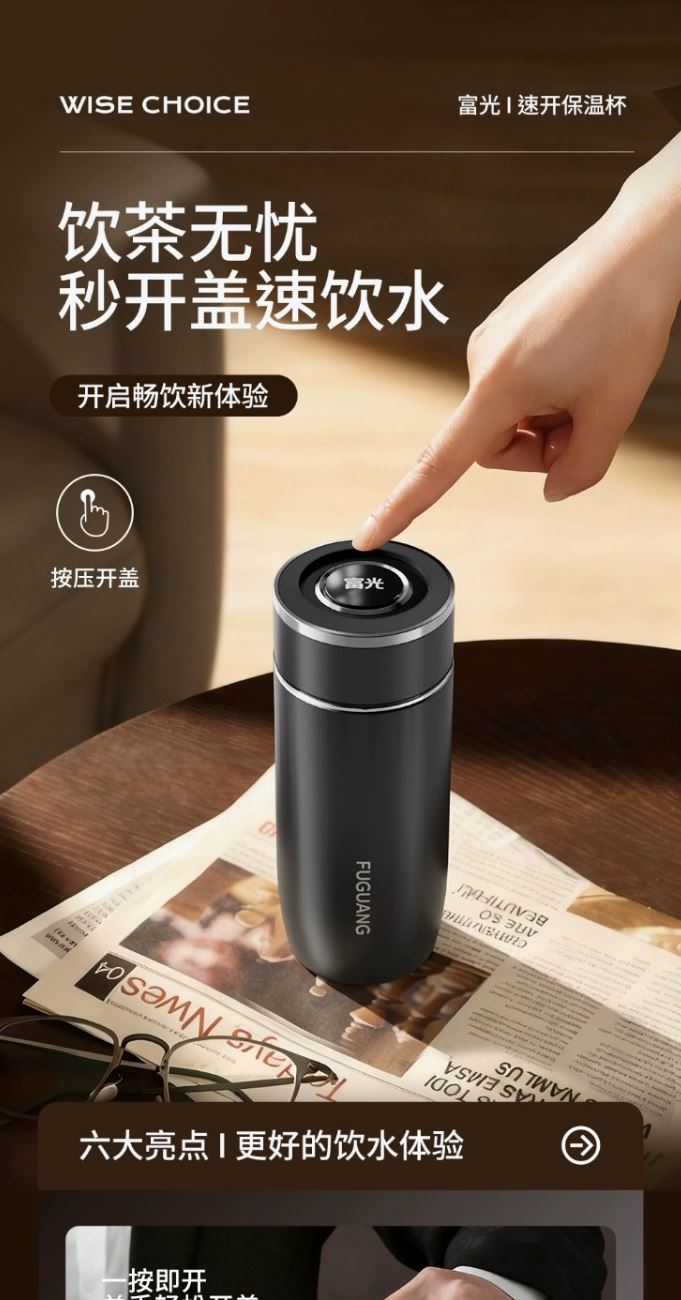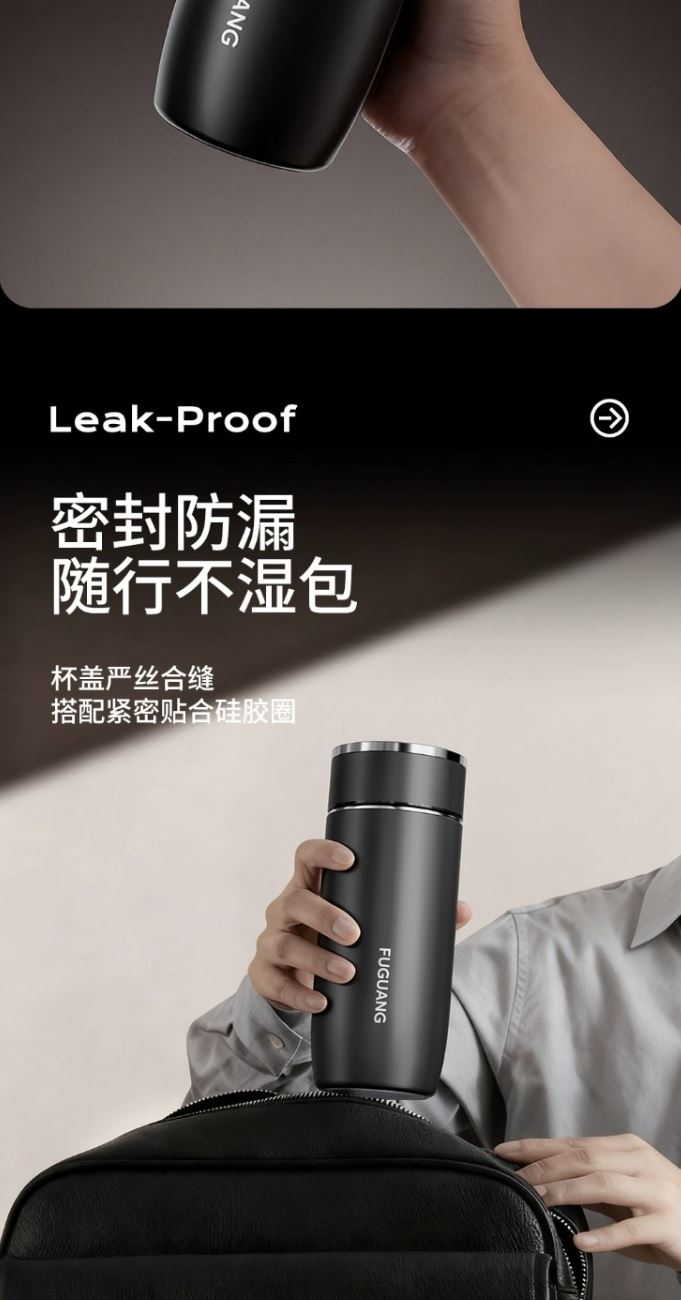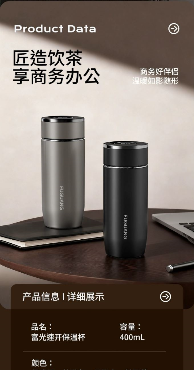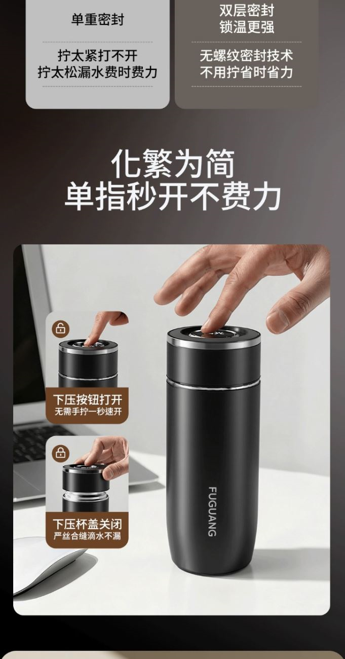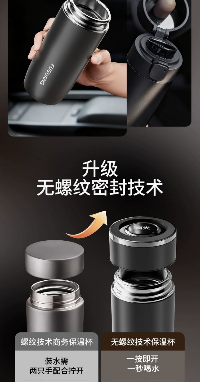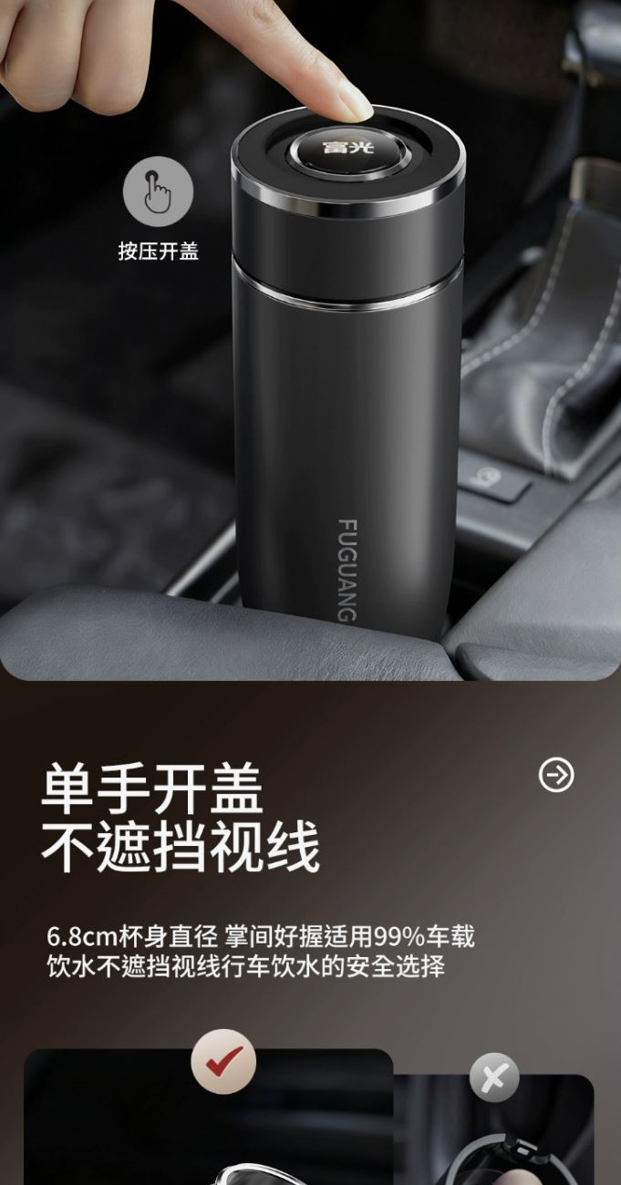 颜色:儒雅黑 炫酷灰 月影白 魅影蓝 尺寸:68*175mm 容量:400ml 材质:316L奥氏体不锈钢内胆,不锈钢手捏滤网。 无尾真空超长保温。 圆润杯口,自带茶隔,快速分离茶汤。 一键开合单手轻松开盖。硅胶杯底静音防滑 包装:单瓦盒