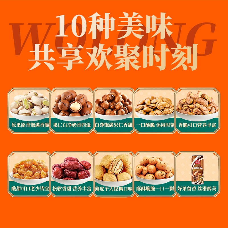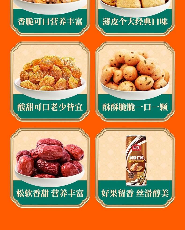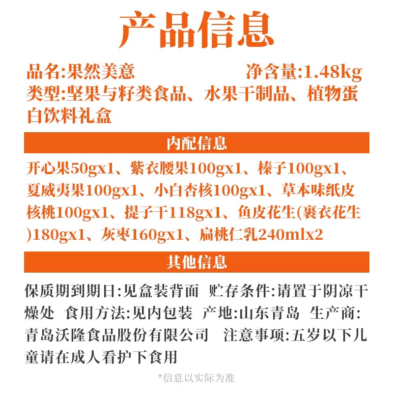 口袋开心果 50g×1袋(21/26) 榛子 100g×1袋 草本味纸皮核桃 100g×1袋 夏威夷果 100g×1袋 小白杏核 100g×1袋 提子干 118g×1袋 紫衣腰果 100g×1袋(A240) 灰枣 160g×1袋 鱼皮花生(裹衣花生) 180g×1袋 扁桃仁乳 240mL×2罐