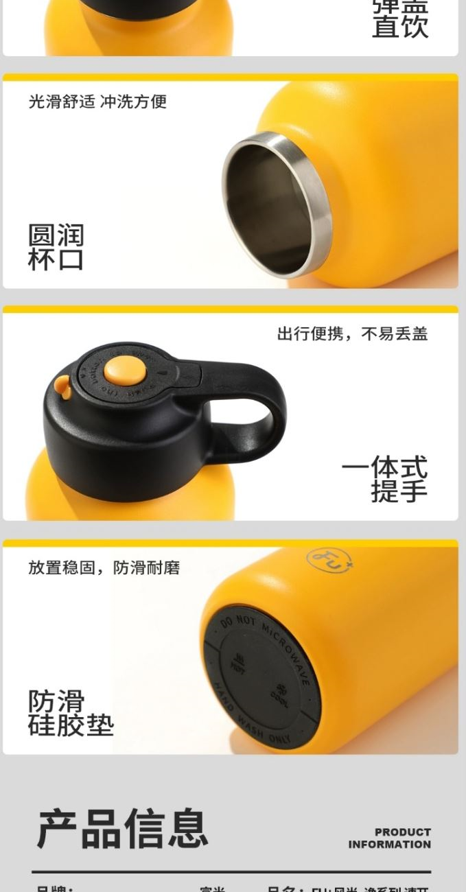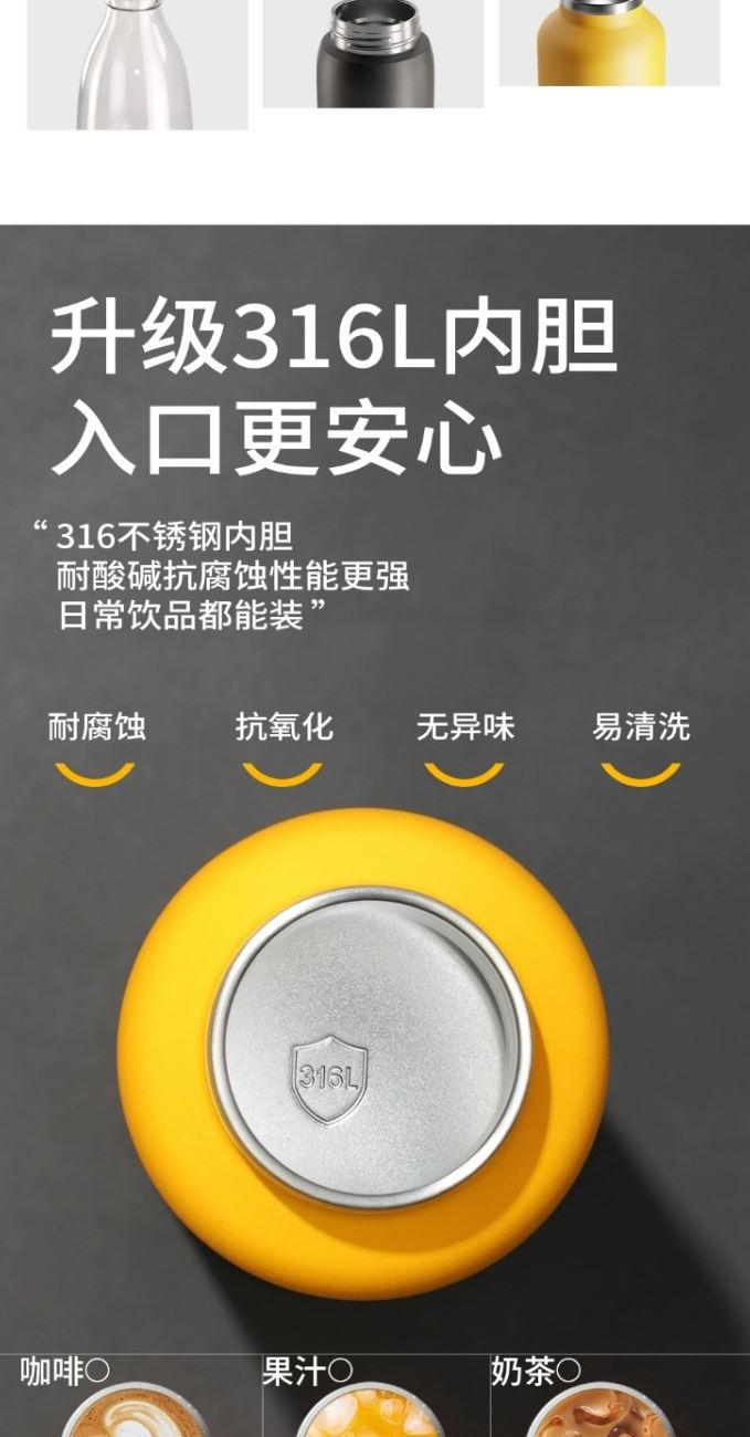 容量:380ml 颜色:白色 黄色 /黑色 黄色 尺寸:68*197*835mm 材质:严选316L不锈钢内胆,采用镀铜真空工艺, 强效保温保鲜。 单手速开盖无螺纹杯盖轻松按压即可开合盖,锁扣设计,不惧误开。 包装:单瓦盒