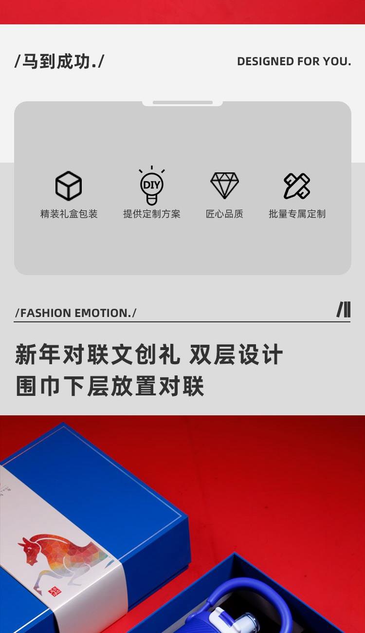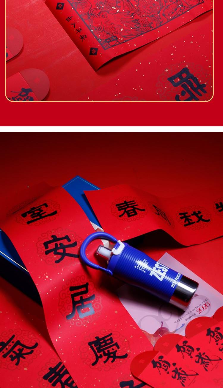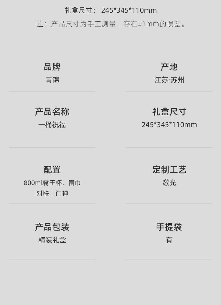 配置 霸王杯800ML*1 围巾*1 手提袋套*1 对联门神*1 精装礼盒手提袋*1 材质 霸王杯:内胆304钢底片216钢 对联门神:洒金艺术纸 定制工艺 激光 镭射 印刷 烫压印 尺寸 霸王杯杯:311*90mm 礼盒:245*345*110mm