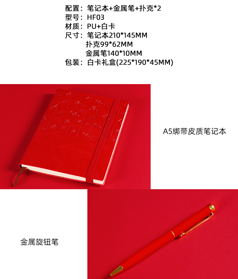 配置:笔记本+金属笔+扑克*2 型号:NF03 材质:PU+白卡 尺寸:笔记本210*145mm 扑克99*62mm 金属笔140*10mm 包装:白卡礼盒(225*190*45mm)