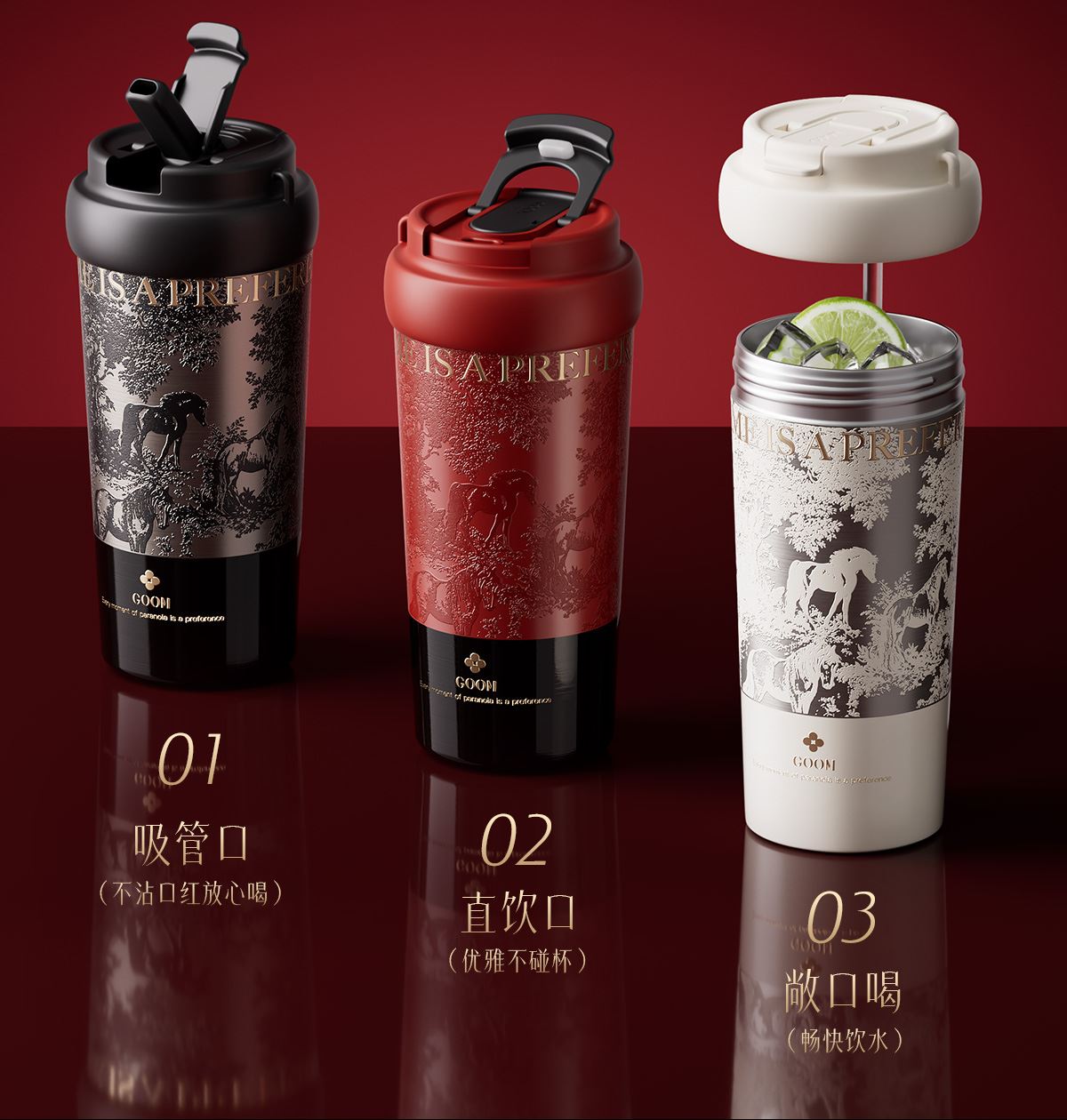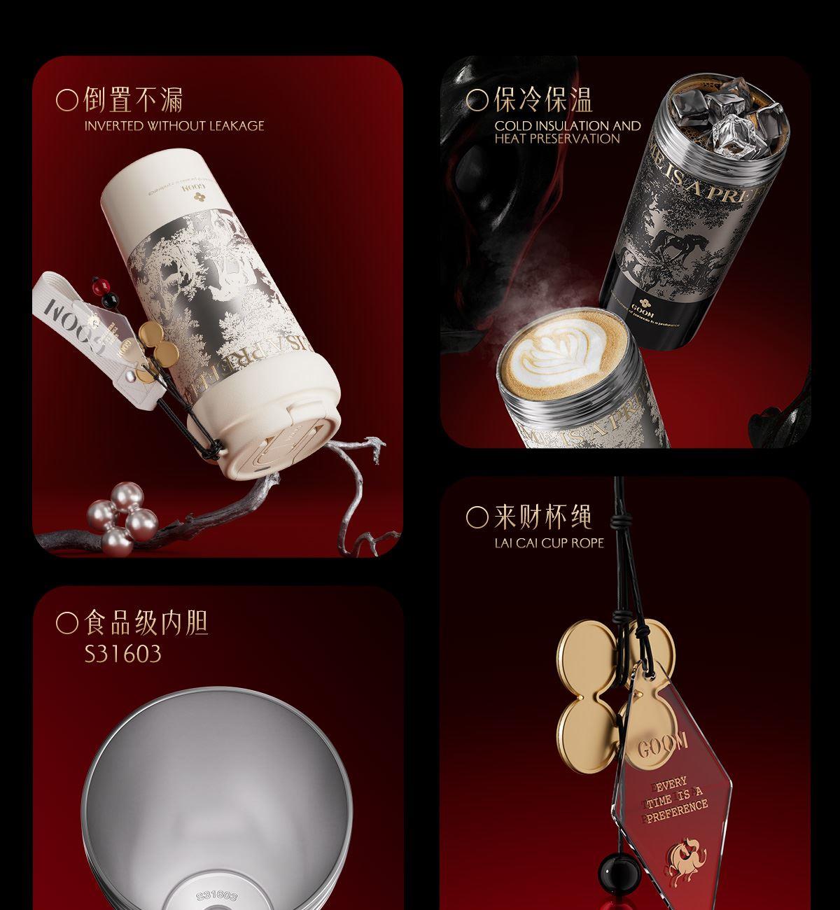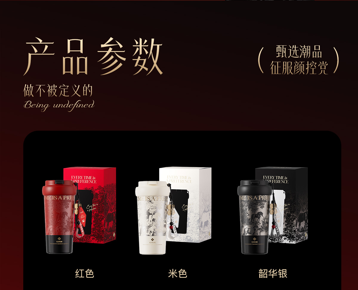 型 号:GM-23AW-B9 颜 色:韶华银/添鸿运/丰米运 材 质:外壳-奥氏体不锈钢S30408、内胆—奥氏体不锈钢S31603、杯盖/吸嘴-PP聚丙烯(丙烯与乙烯的聚合物)、吸管-PP聚丙烯(丙烯均聚物)、密封件-硅橡胶、手提绳-蜡绳+皮革+编织+金属、挂件-蜡绳、亚克力、锌合金、珠子 容 量:600ml 单杯尺寸:169*93mm 外箱尺寸:120*96*205mm