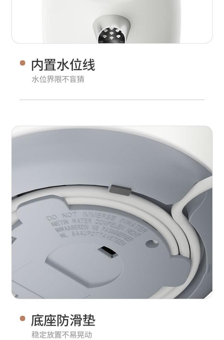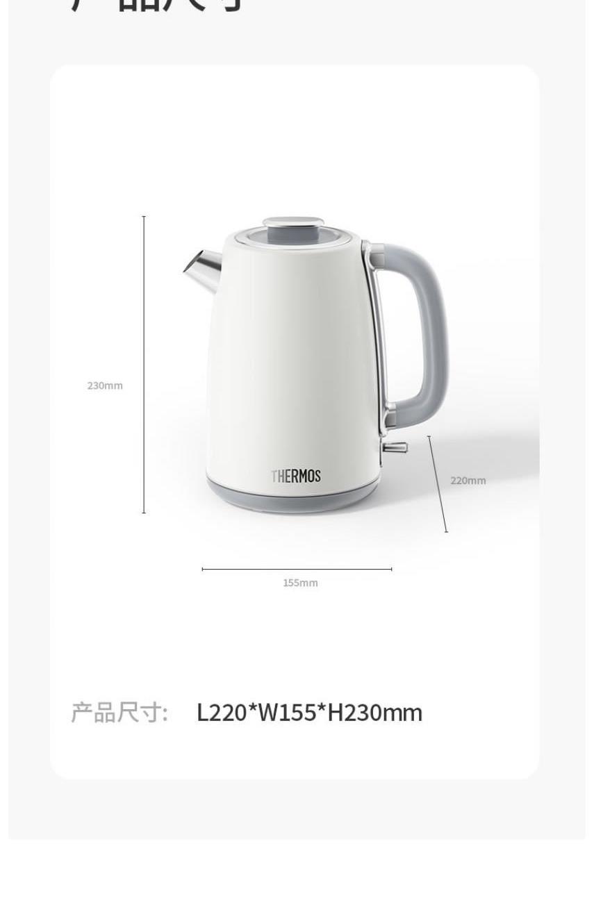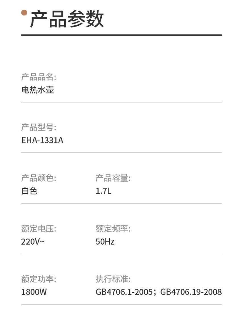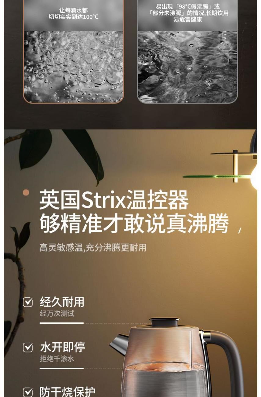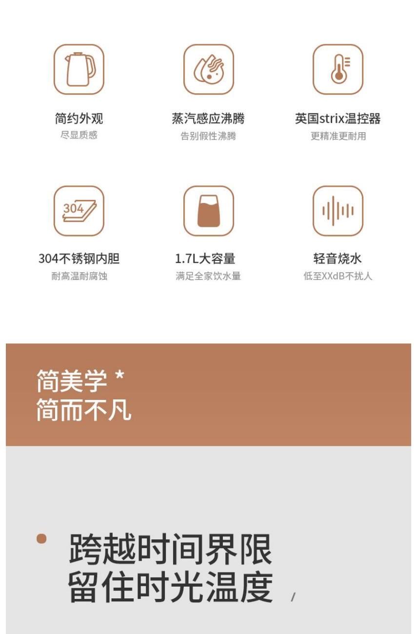 额定电源 :220V~50Hz 额定功率 : 1800W 额定容量:1.7L 加热方式:底盘加热 净 重 :1.03KG 毛重:1.52kg 包装尺寸 :219*219*316mm 简约外观 蒸汽感应沸腾,告别假性沸腾 英国strix温控器,更精 准更耐用 316不锈钢内胆,耐高温耐腐蚀 1.7L大容量,满足全家饮水量