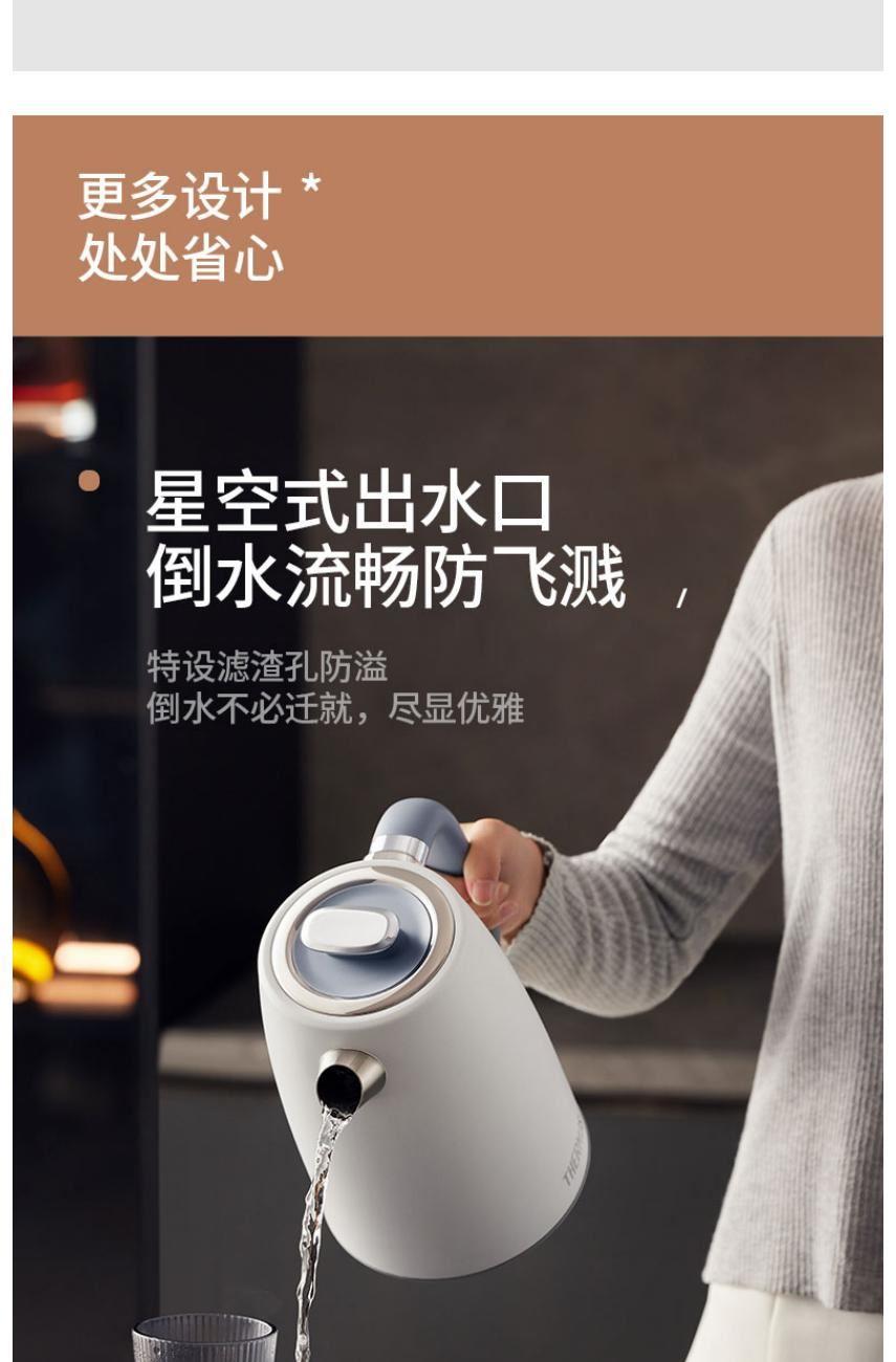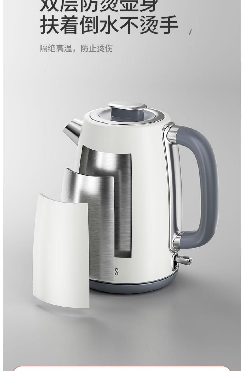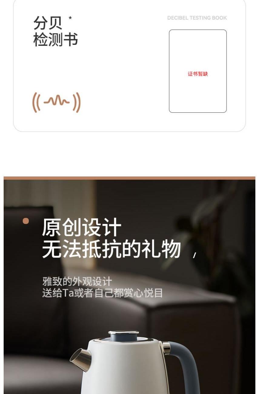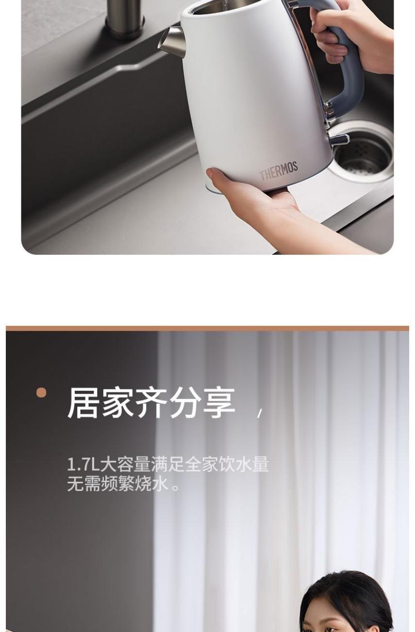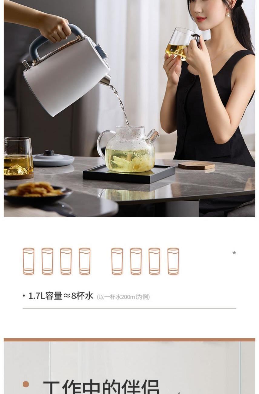 额定电源 :220V~50Hz 额定功率 : 1800W 额定容量:1.7L 加热方式:底盘加热 净 重 :1.03KG 毛重:1.52kg 包装尺寸 :219*219*316mm 简约外观 蒸汽感应沸腾,告别假性沸腾 英国strix温控器,更精 准更耐用 316不锈钢内胆,耐高温耐腐蚀 1.7L大容量,满足全家饮水量