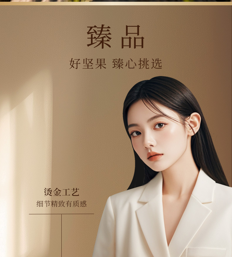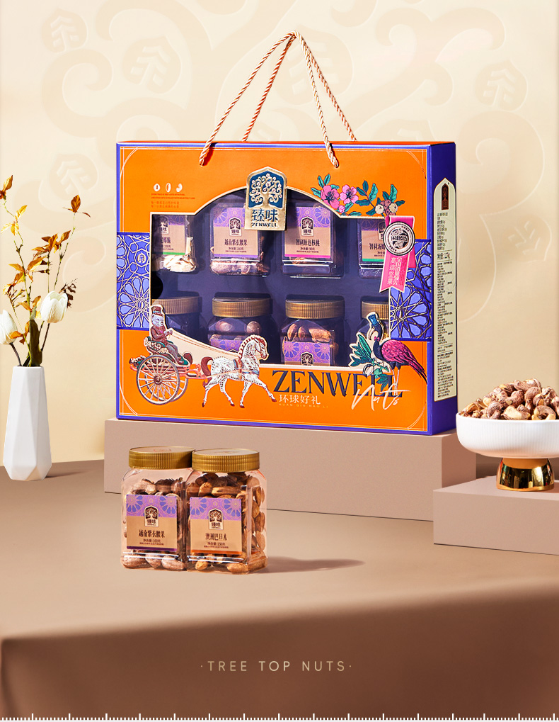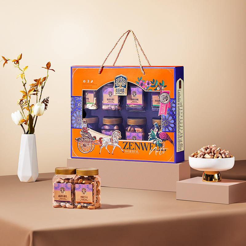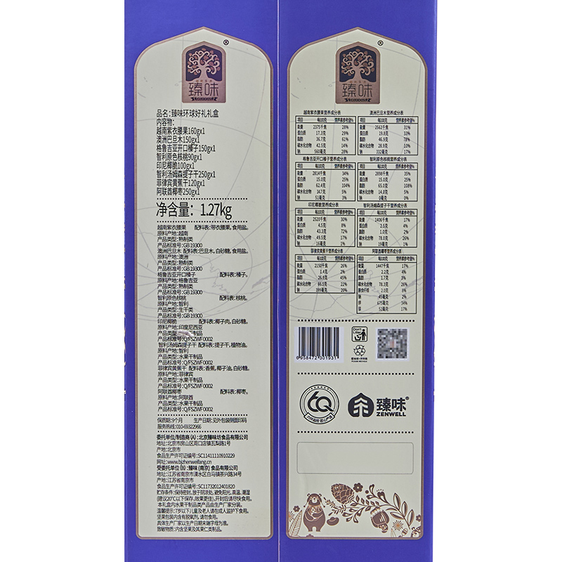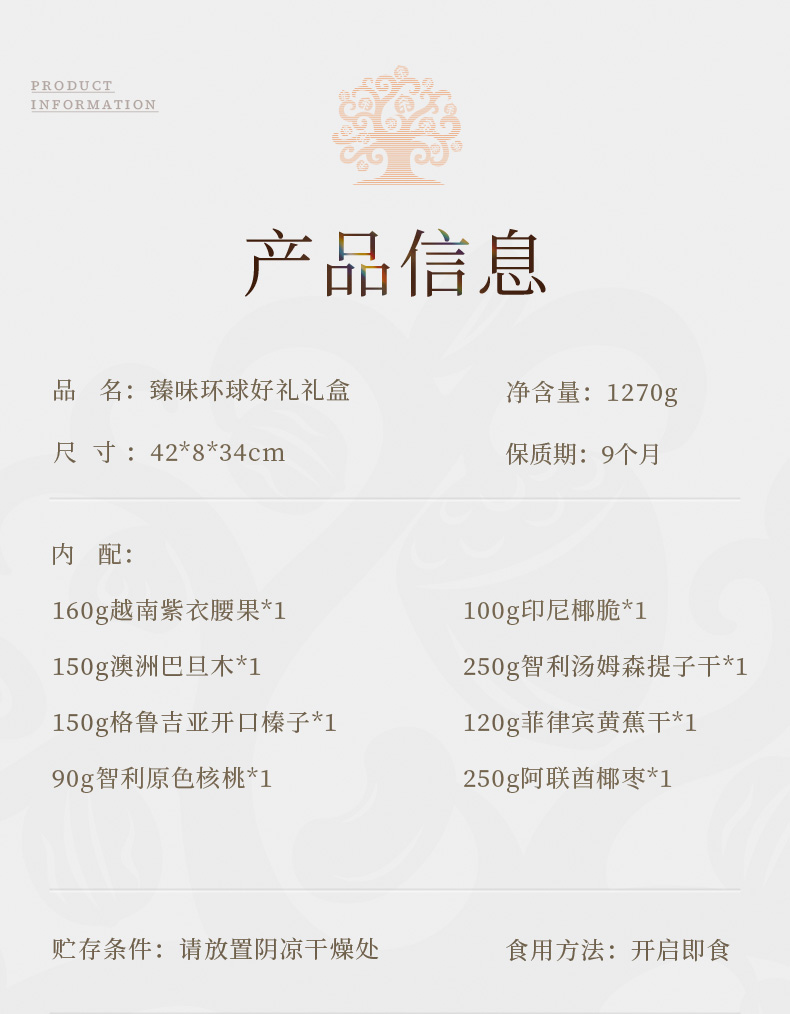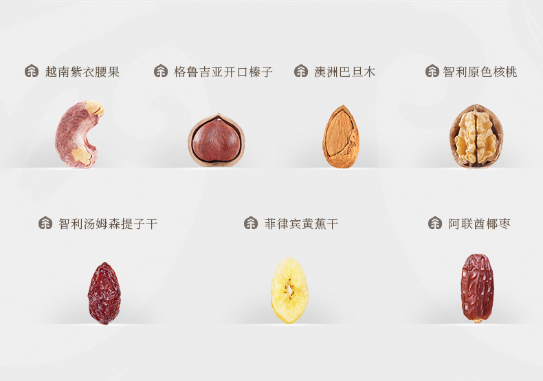 160g越南紫衣腰果*1 150g澳洲巴旦木*1 150g格鲁吉亚开口榛子*1 90g智利原色核桃*1 100g印尼椰脆*1 250g智利汤姆森提子干*1 120g菲律宾黄蕉干*1 250g阿联酋椰枣*1