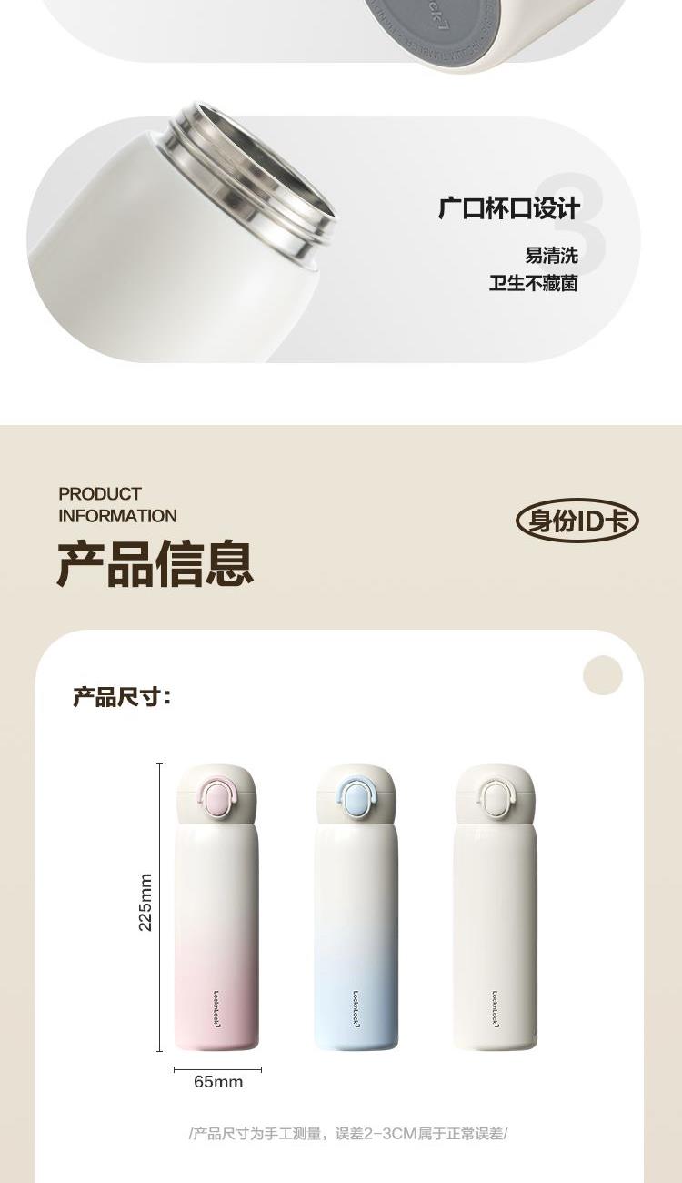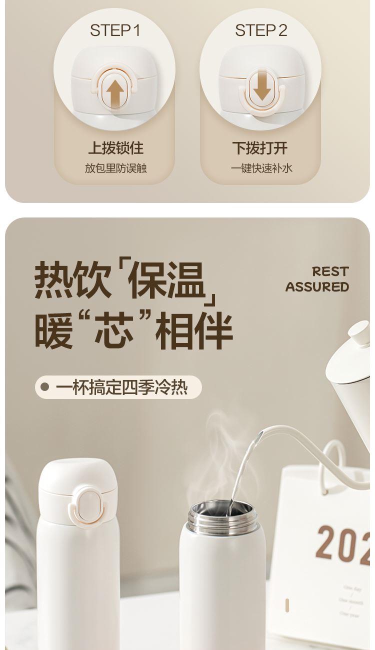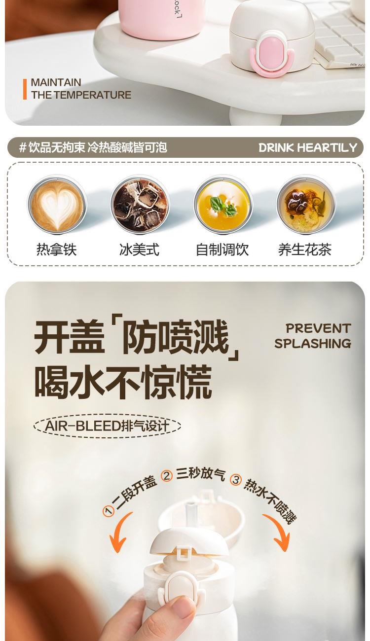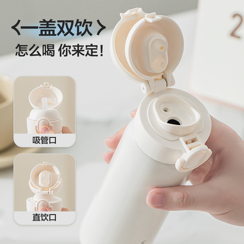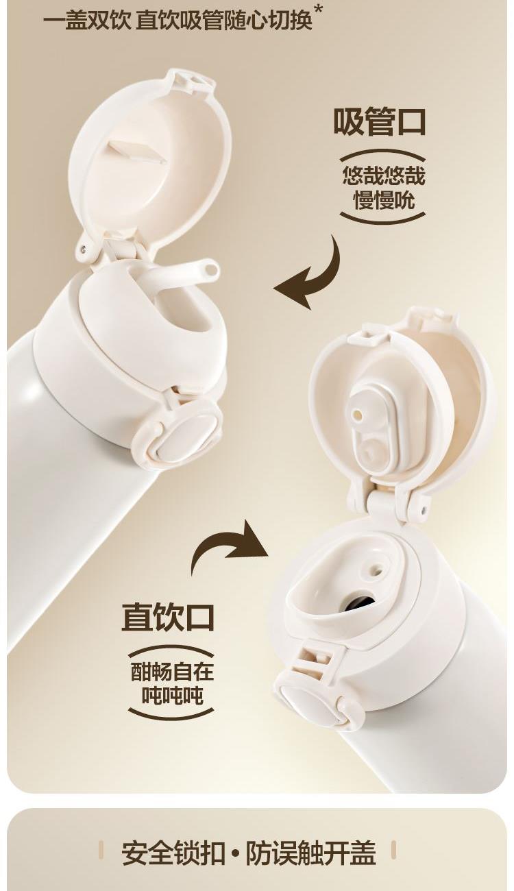 产品特点: 1.一盖两用,可吸管可直饮,轻按一次吸管口,再次按压直饮口。 2.防误开杯盖设计,儿童使用更放心(大小可放书包侧面)。 3.二段式开盖,安全不喷溅。 4.杯底硅胶底座,防滑耐磨。 5.居家、旅行、运动、通勤、礼品皆可。 6.内胆:316L不锈钢,杯盖:PP材质,吸管嘴、密封圈、气阀:硅胶