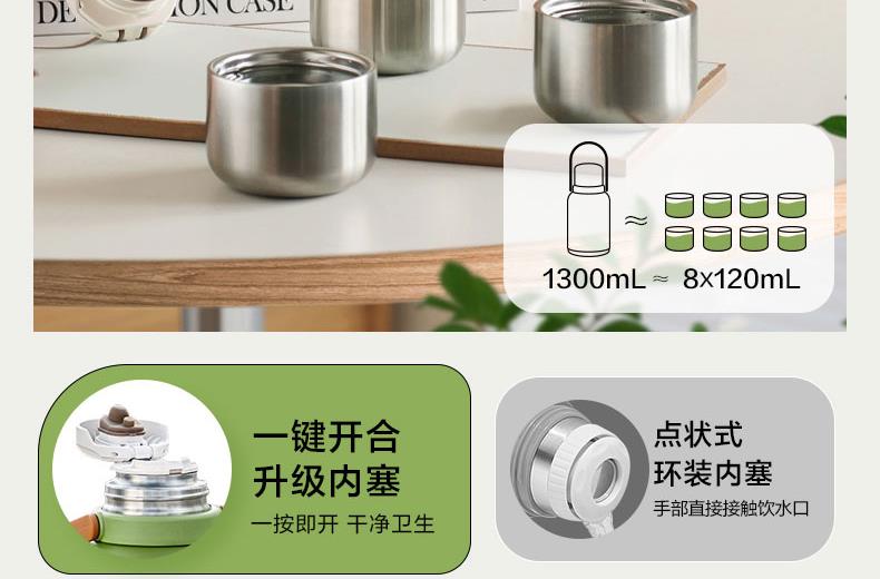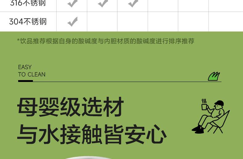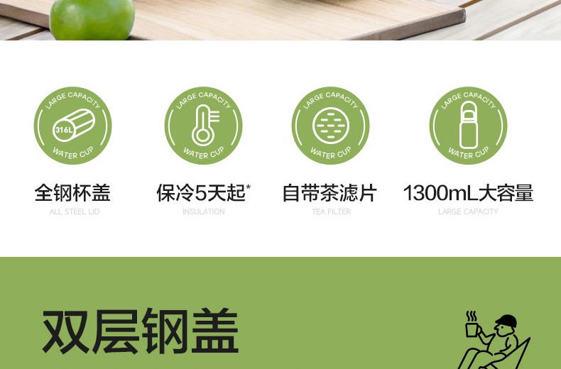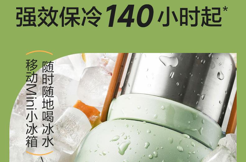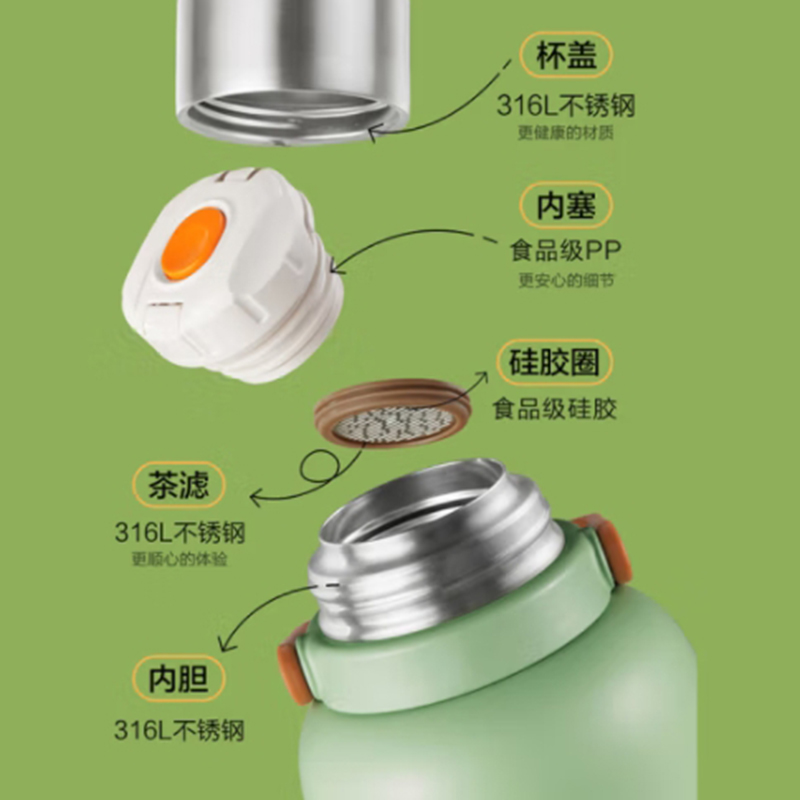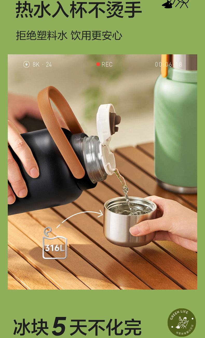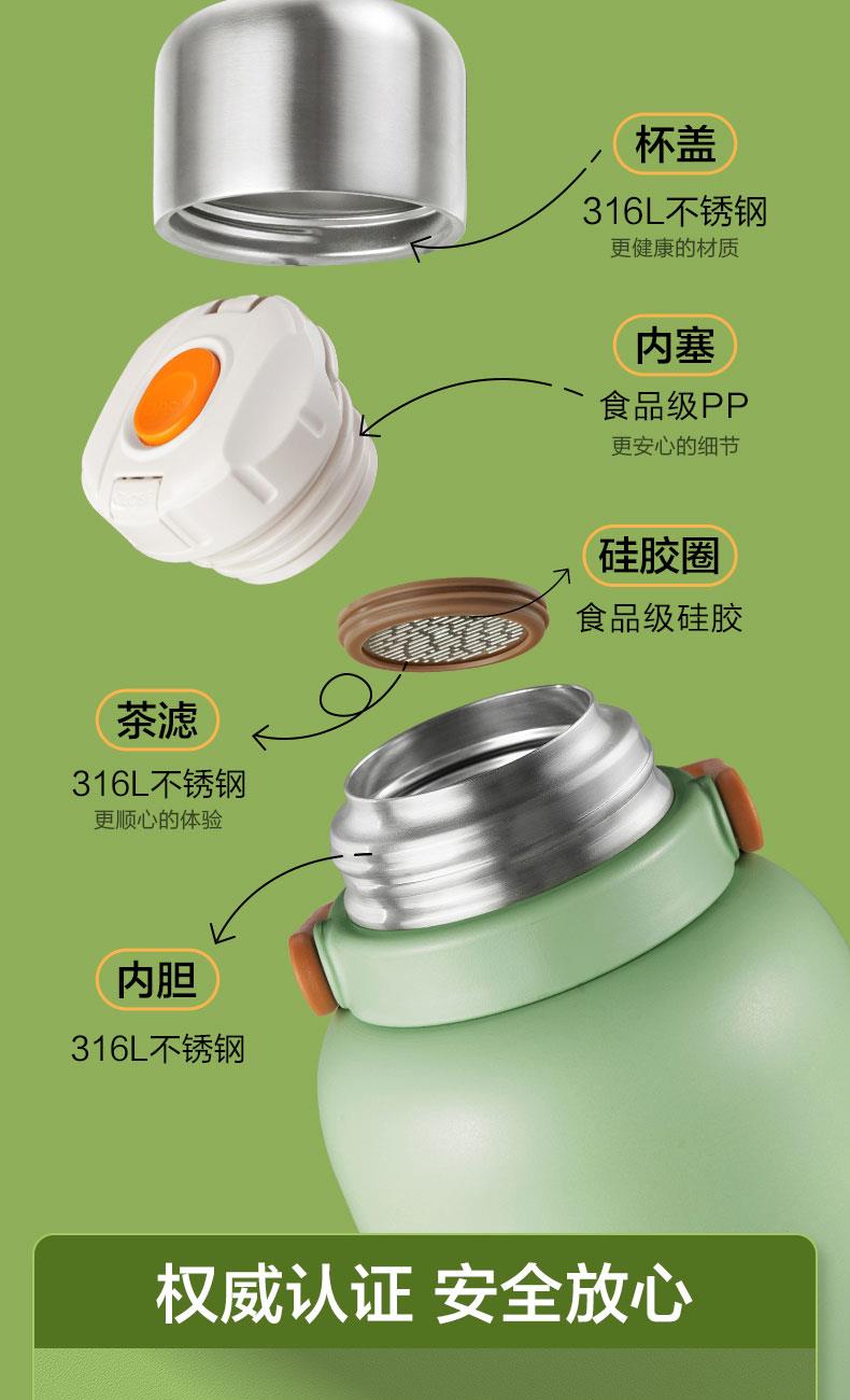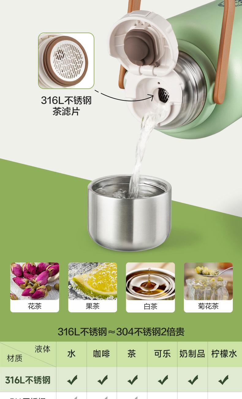 容量(L) 1.0L 材质 内胆316L不锈钢 规格参数 产品说明 代发在库颜色:高山绿/岩木黑 商品毛重(kg):0.85 功能卖点 1、1.0L大容量,旅行、居家好帮手; 2、双层钢盖,热水入杯不烫手,饮用更安心; 3、强效保冷140小时+;保温24小时+; 4、一杯双用(直饮、杯盖); 5、316不锈钢茶滤片,万物皆可泡; 6、316不锈钢内胆、杯盖,环保,健康; 7、360°密封不漏水,便携提手,随拎随走。