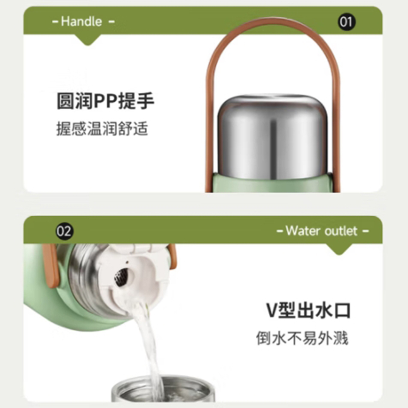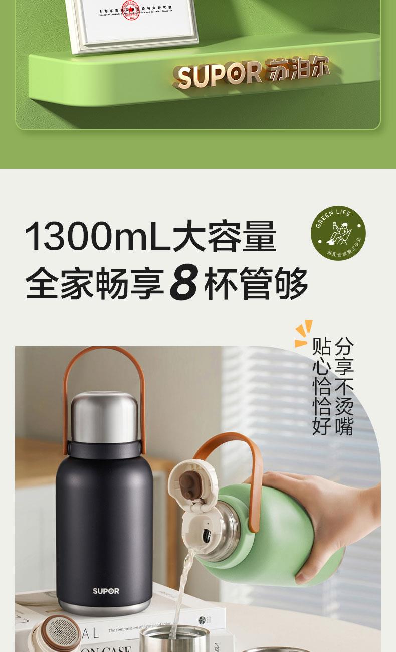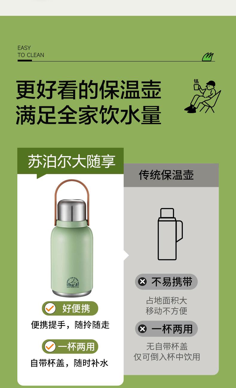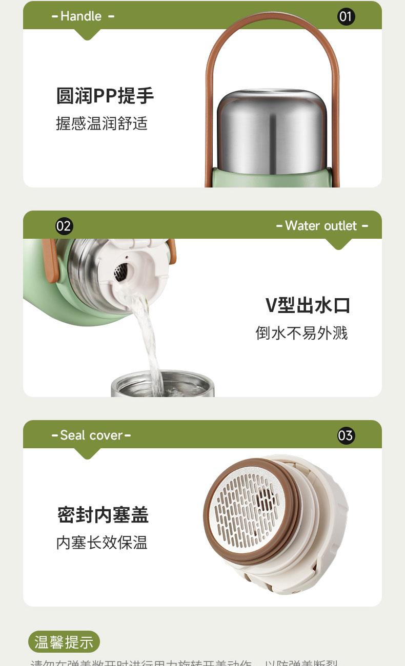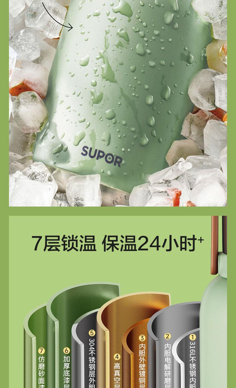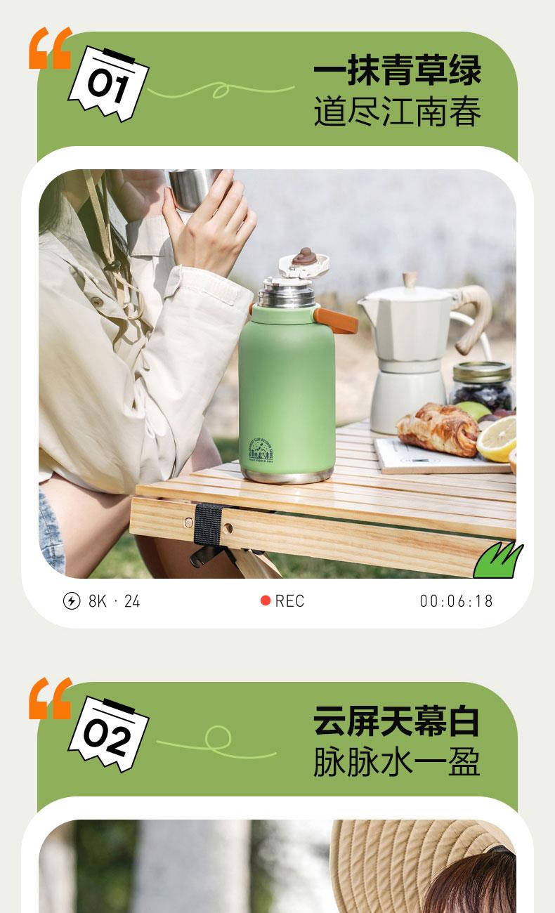 容量(L) 1.0L 材质 内胆316L不锈钢 规格参数 产品说明 代发在库颜色:高山绿/岩木黑 商品毛重(kg):0.85 功能卖点 1、1.0L大容量,旅行、居家好帮手; 2、双层钢盖,热水入杯不烫手,饮用更安心; 3、强效保冷140小时+;保温24小时+; 4、一杯双用(直饮、杯盖); 5、316不锈钢茶滤片,万物皆可泡; 6、316不锈钢内胆、杯盖,环保,健康; 7、360°密封不漏水,便携提手,随拎随走。