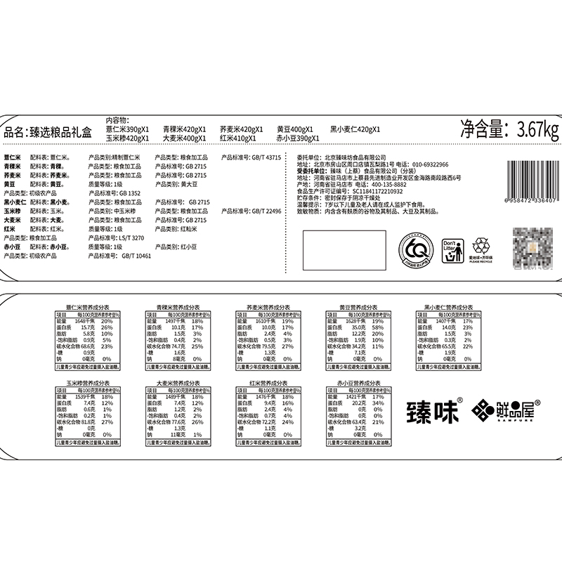 390g薏仁米*1 420g青稞米*1 420g荞麦米*1 400g黄豆*1 420g黑小麦仁*1 420g玉米糁*1 400g大麦米*1 410g红米*1 390g赤小豆*1