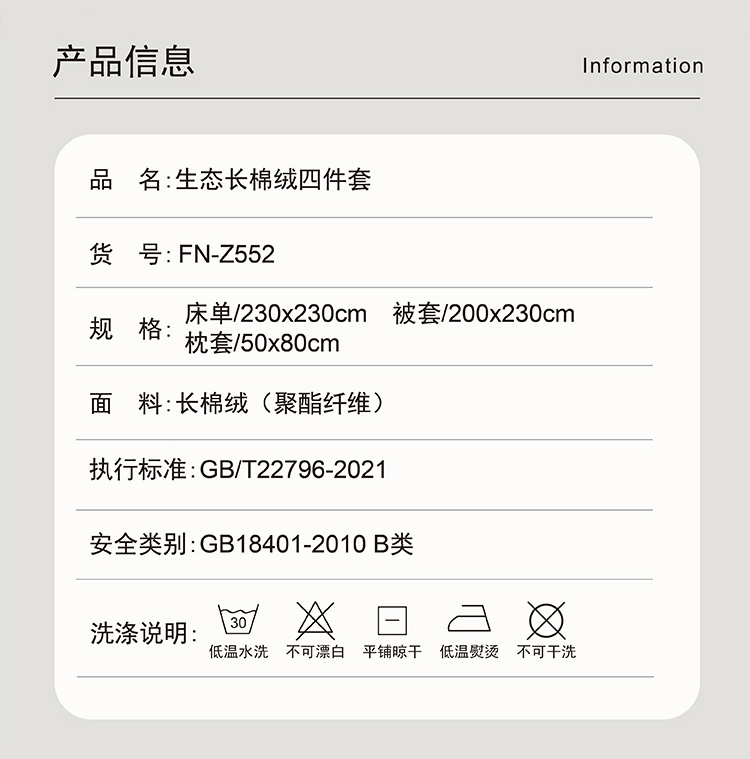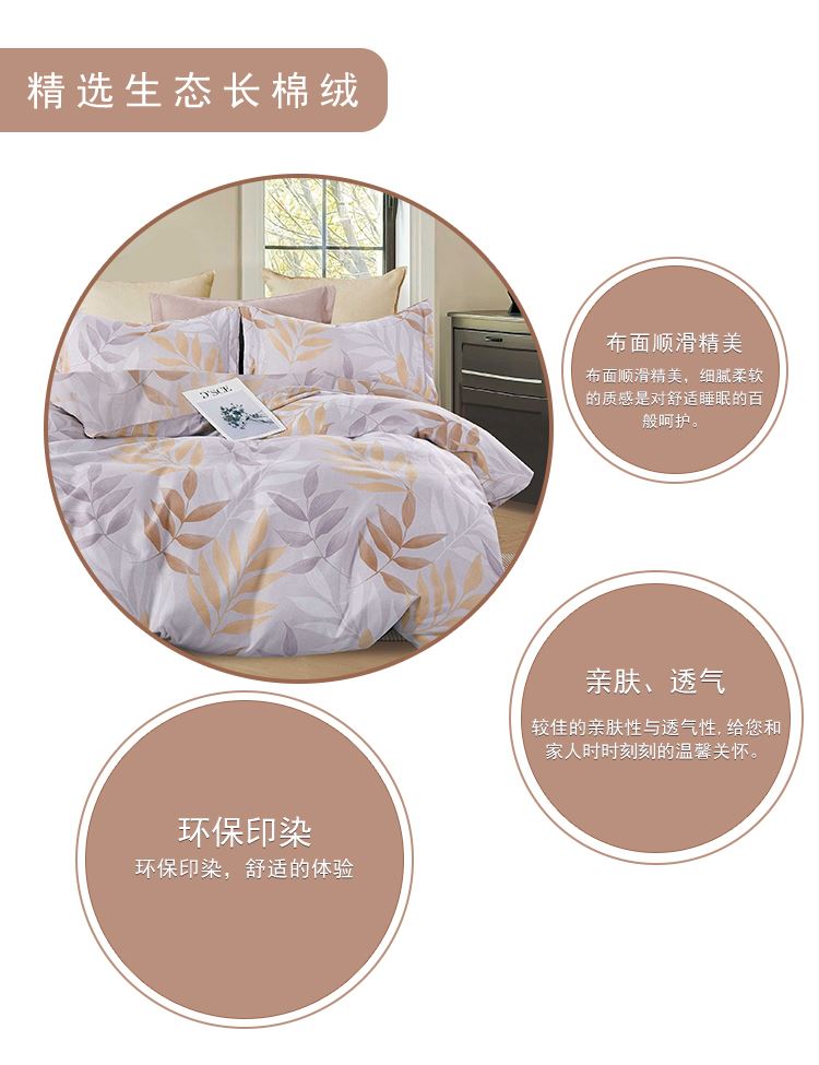 床单:230x230cm 被套:200x230cm 枕套:50x80cm 【面 料】长棉绒(聚酯纤维) 产品特点: 1.亲肤长棉绒面料,柔软舒适,不缩水,不变形; 2.活性印染,环保,不易褪色; 3.产品做工精细,足尺足码。