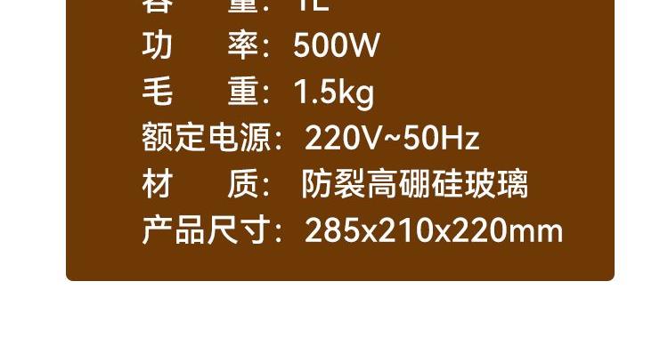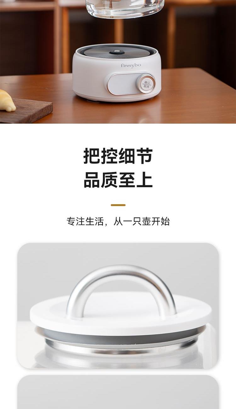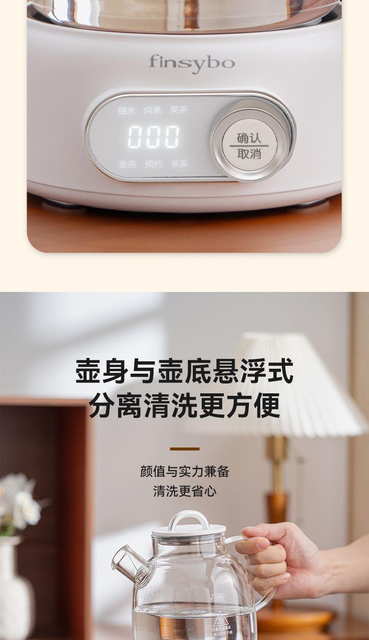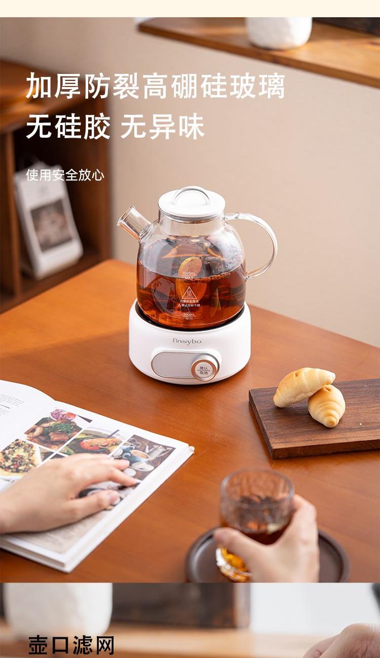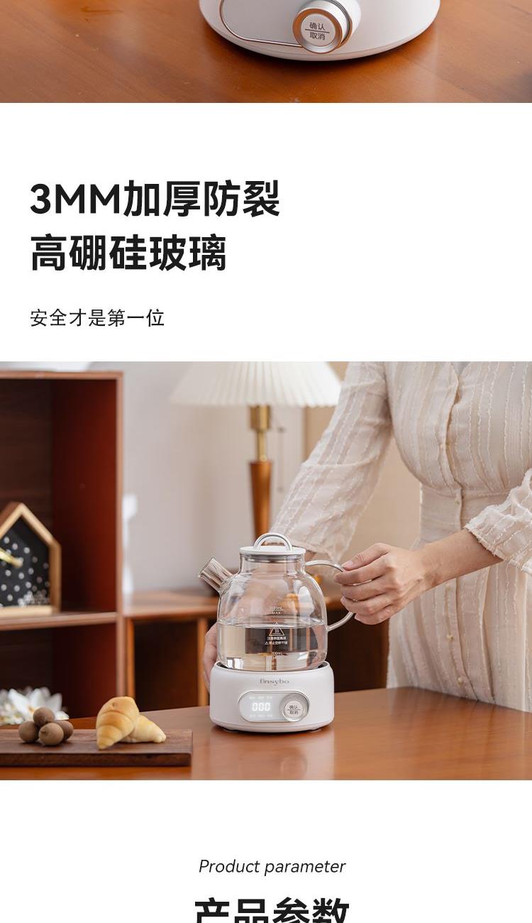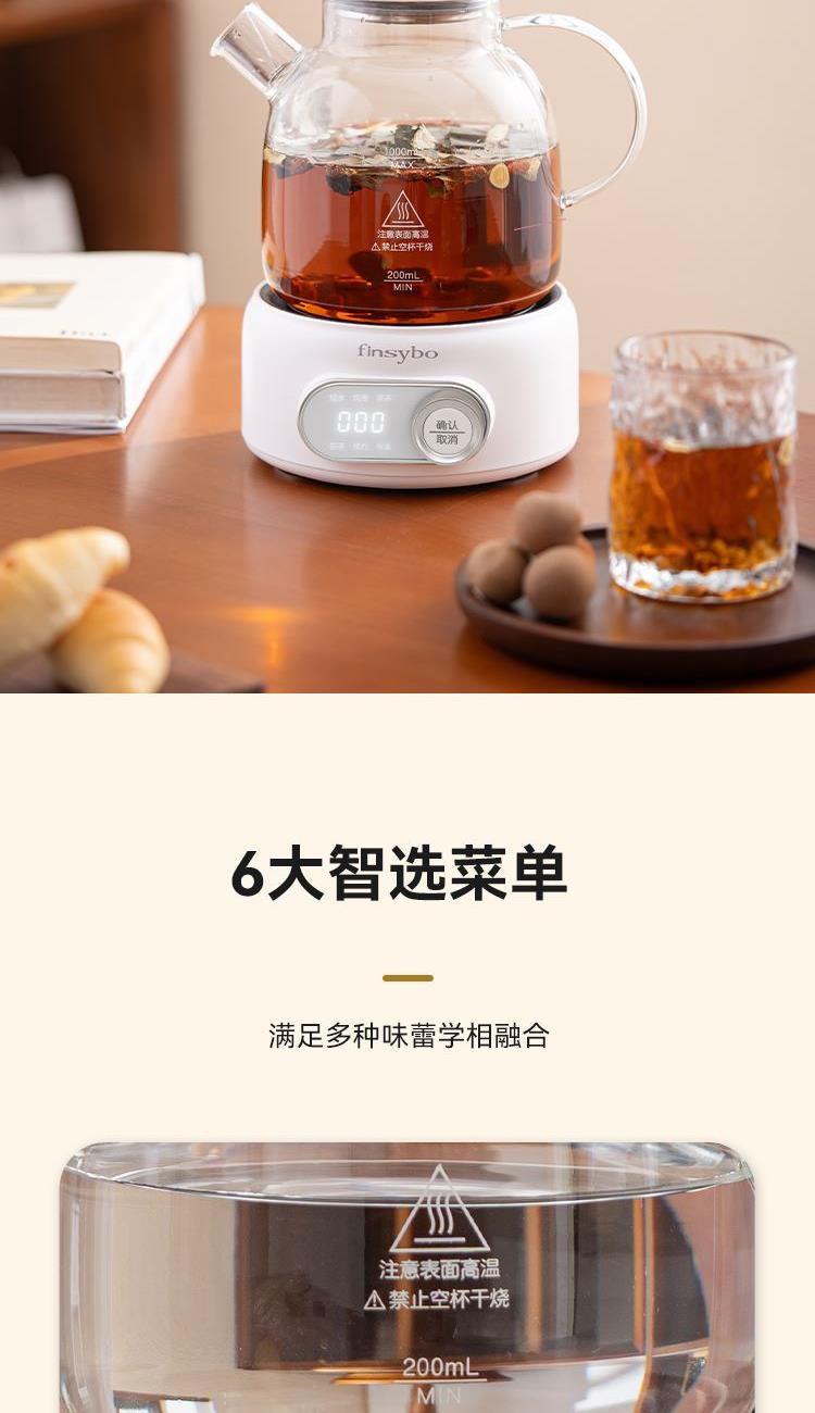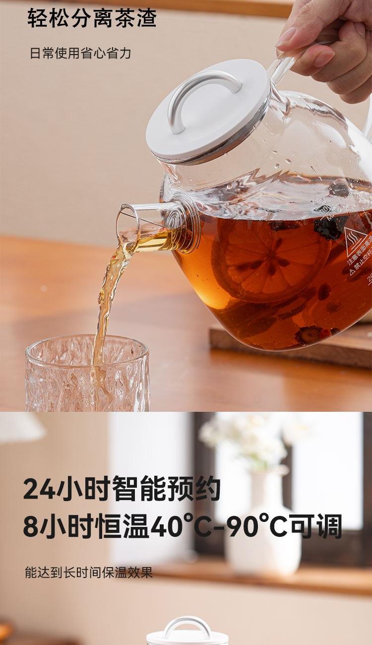 1、加厚防裂高硼硅玻璃 无硅胶,无异味,更放心 2、24小时智能预约,8小时恒温40°C-90°C可调 3、6大智选菜单,满足多种味蕾 4、壶身与壶底悬浮式,分离清洗更方便 5、防烫壶盖,壶口滤网,轻松分离茶渣
