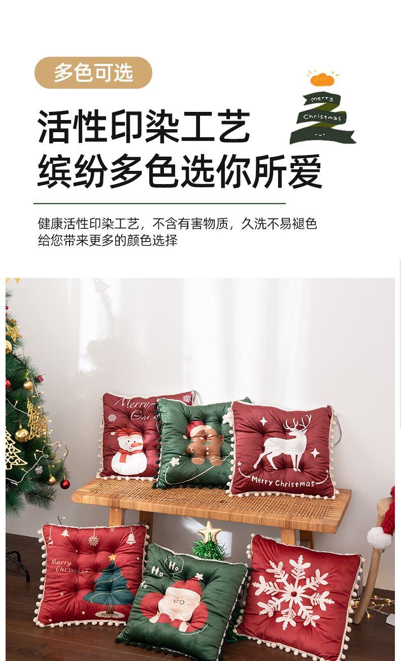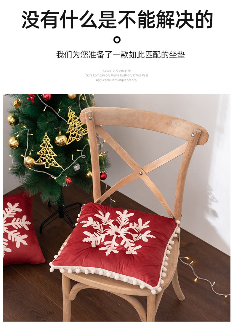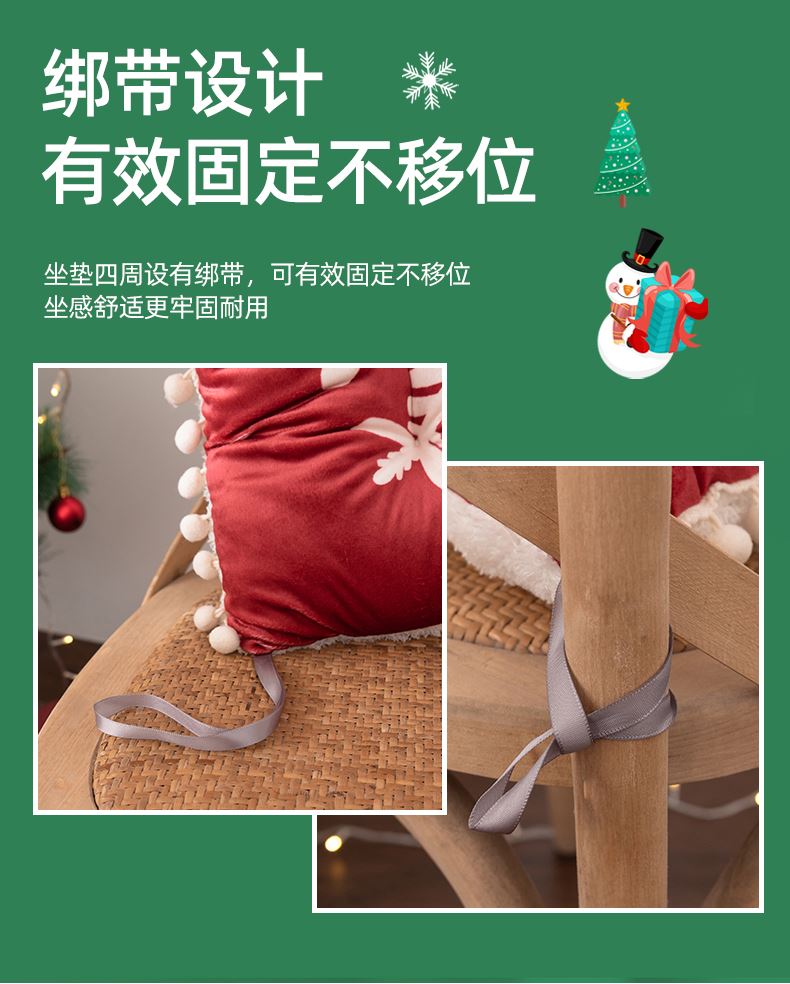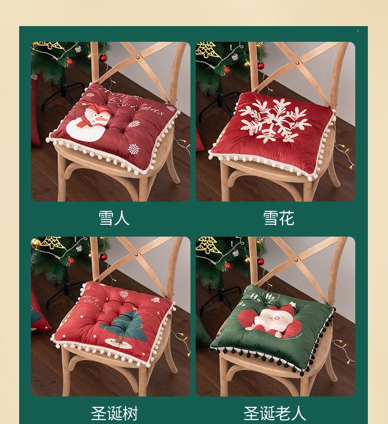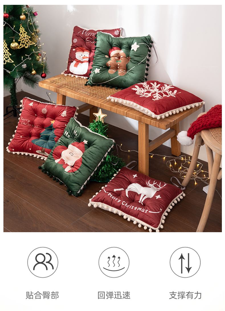 花色:姜饼人、麋鹿、圣诞老人、圣诞树、雪花、雪人 规格:40*40cm 面料:A面水晶绒B面美丽绒 填充:高弹棉 A面水晶绒B美丽绒双面坐垫,柔软细腻舒适;高弹棉填充,不易塌陷舒适回弹好;圆点定型工艺,固定填充不易移位,坐感舒适;绑带设计,有效固定不移位;活性印染工艺,色牢度高,不易掉色。