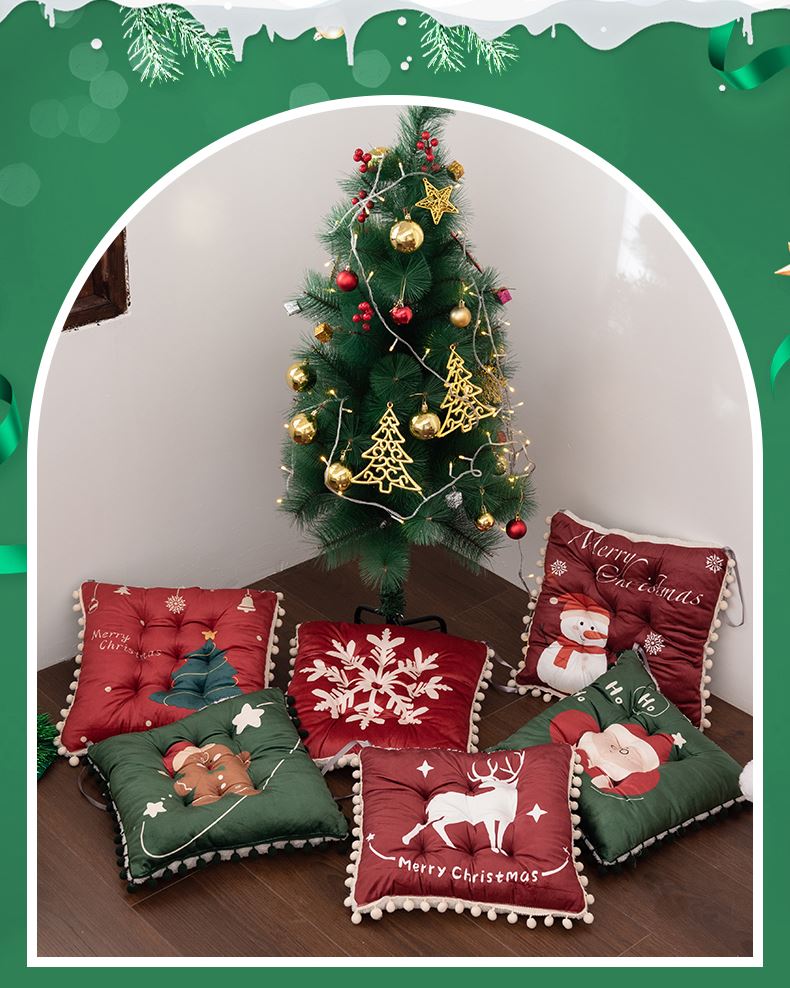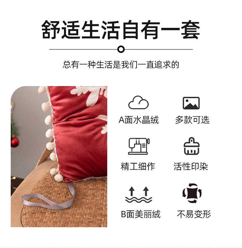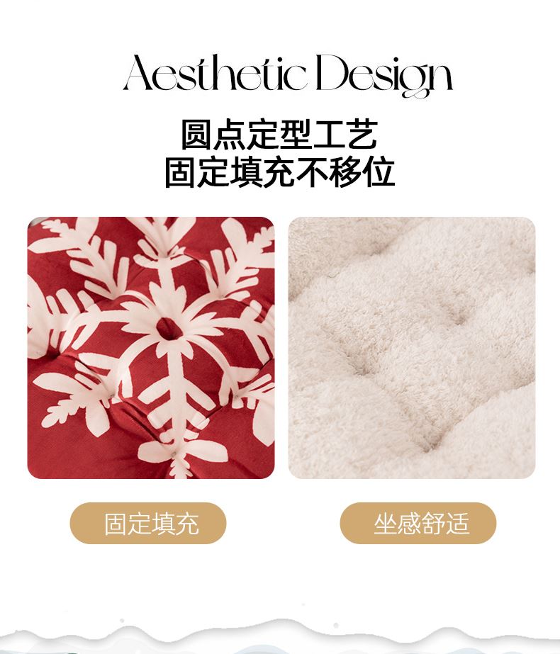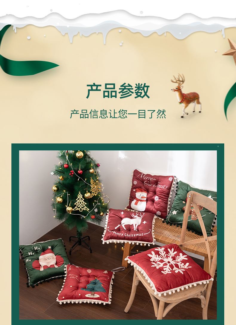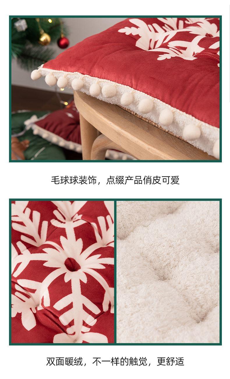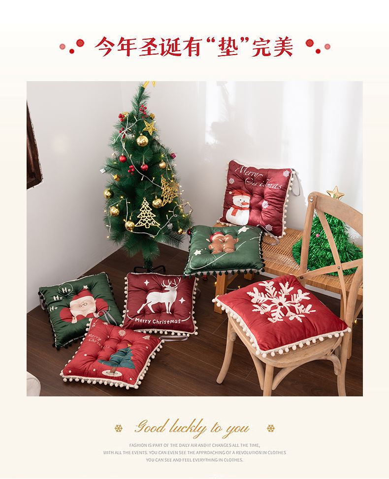花色:姜饼人、麋鹿、圣诞老人、圣诞树、雪花、雪人 规格:40*40cm 面料:A面水晶绒B面美丽绒 填充:高弹棉 A面水晶绒B美丽绒双面坐垫,柔软细腻舒适;高弹棉填充,不易塌陷舒适回弹好;圆点定型工艺,固定填充不易移位,坐感舒适;绑带设计,有效固定不移位;活性印染工艺,色牢度高,不易掉色。