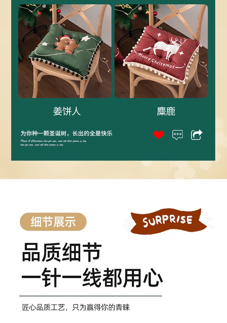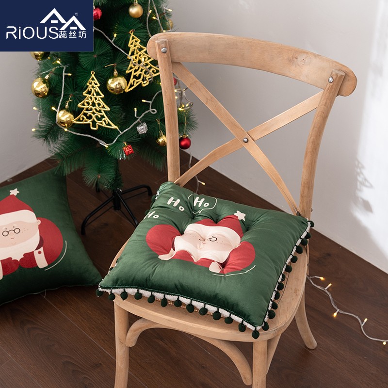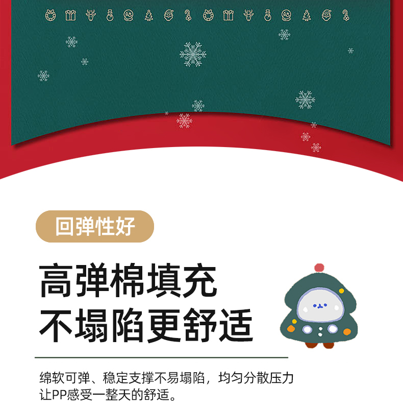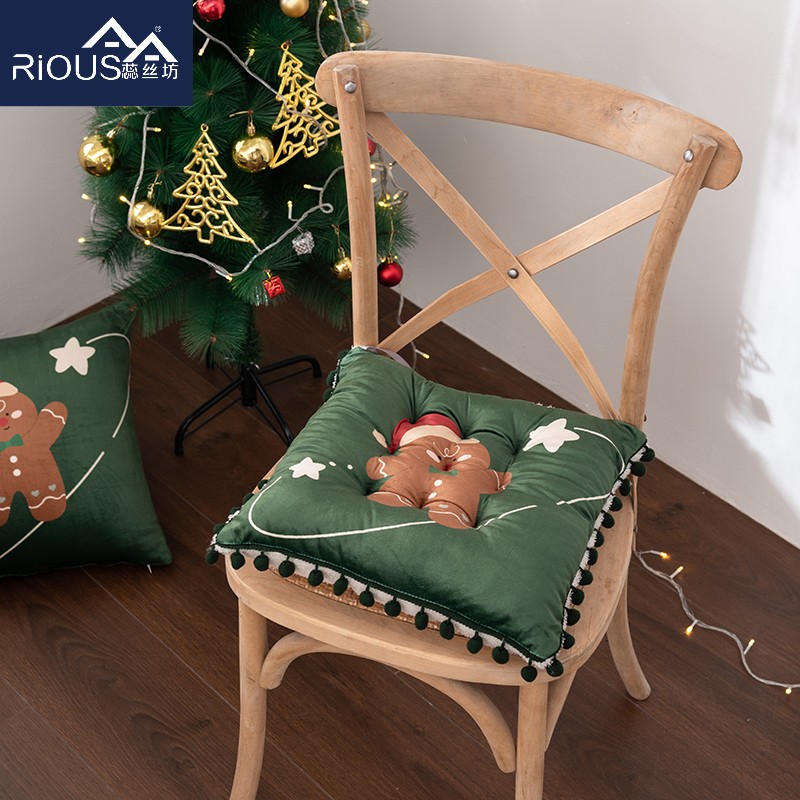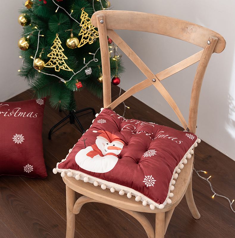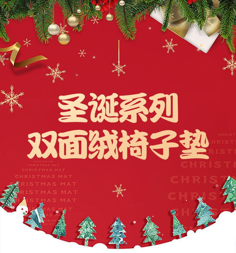 花色:姜饼人、麋鹿、圣诞老人、圣诞树、雪花、雪人 规格:40*40cm 面料:A面水晶绒B面美丽绒 填充:高弹棉 A面水晶绒B美丽绒双面坐垫,柔软细腻舒适;高弹棉填充,不易塌陷舒适回弹好;圆点定型工艺,固定填充不易移位,坐感舒适;绑带设计,有效固定不移位;活性印染工艺,色牢度高,不易掉色。