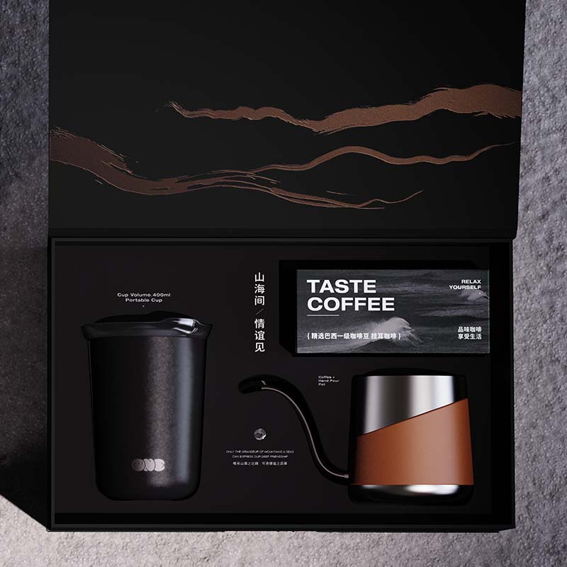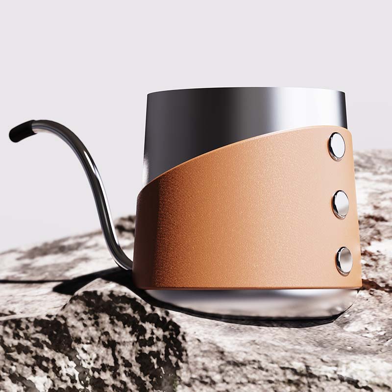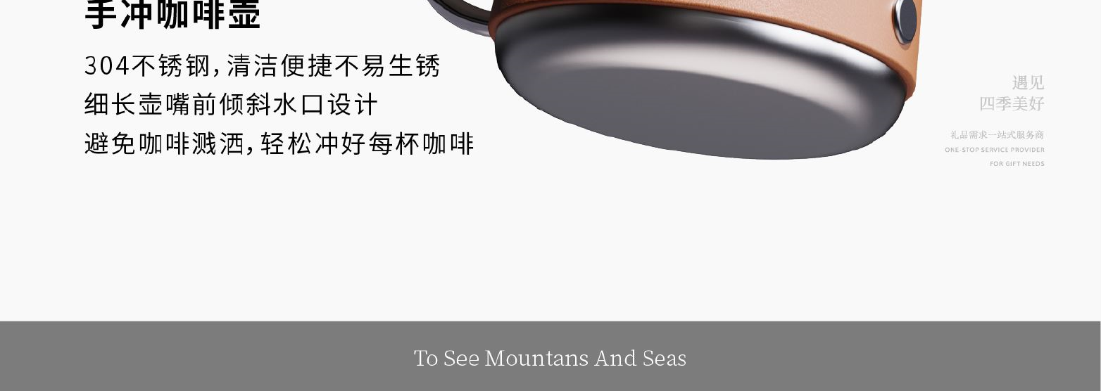 3、手冲咖啡壶,304不锈钢,清洁便捷不易生锈,细长壶嘴前倾斜水口设计,避免咖啡溅洒,轻松冲好每杯咖啡,壶身搭配皮套,隔热防烫,可定制logo。容量:300ml。