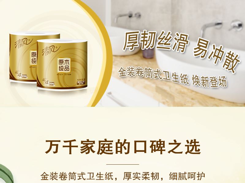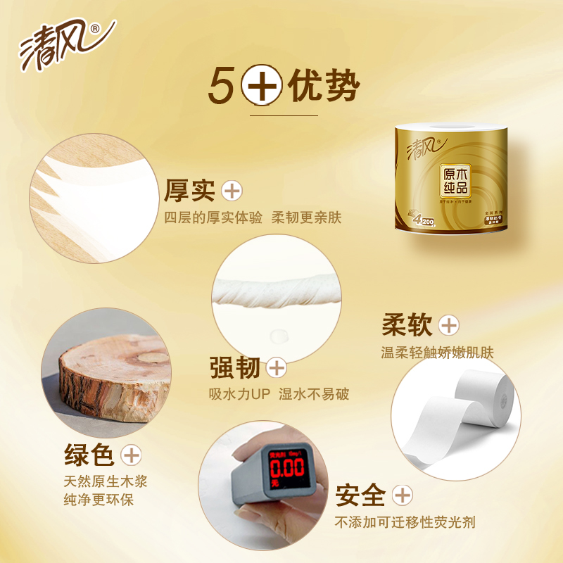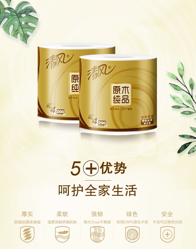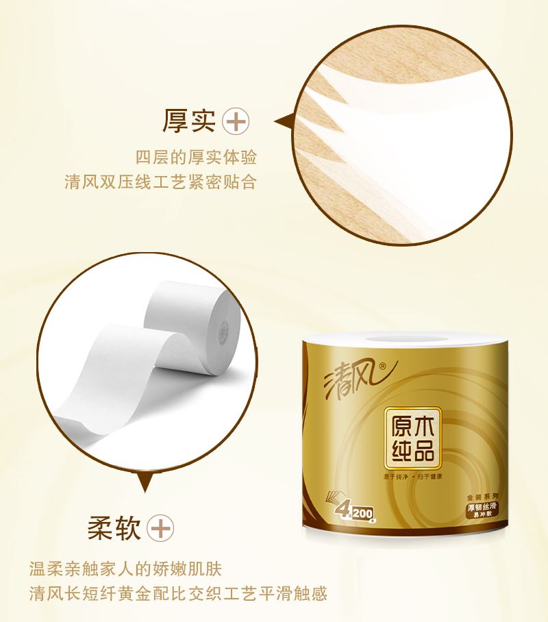2.四层厚实,蓬松舒软 原生木浆好木出好纸,纸感细腻,棉柔亲肤。