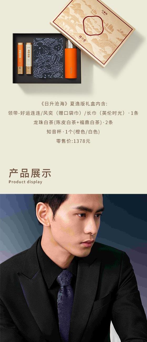 内含: 领带-好运连连/风奕(赠口袋巾)或者长巾(英伦时光)·1条(领带和长巾二选一) 龙珠白茶(陈皮白茶+福鼎白茶)·2条 知音杯·1个(橙色/白色)