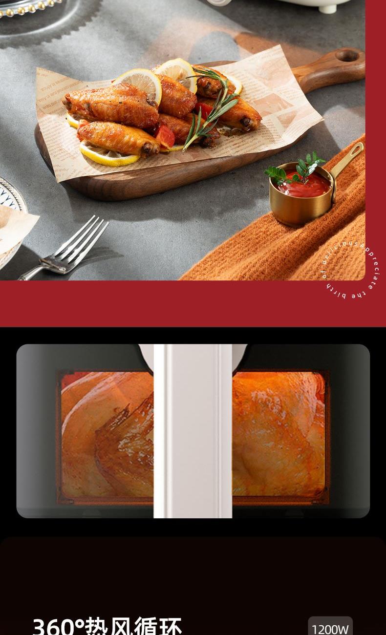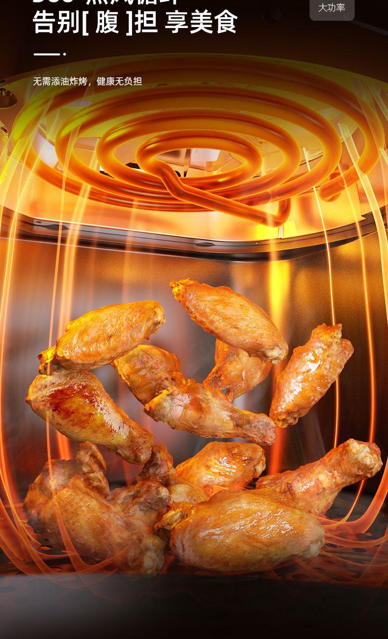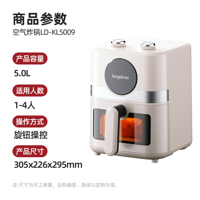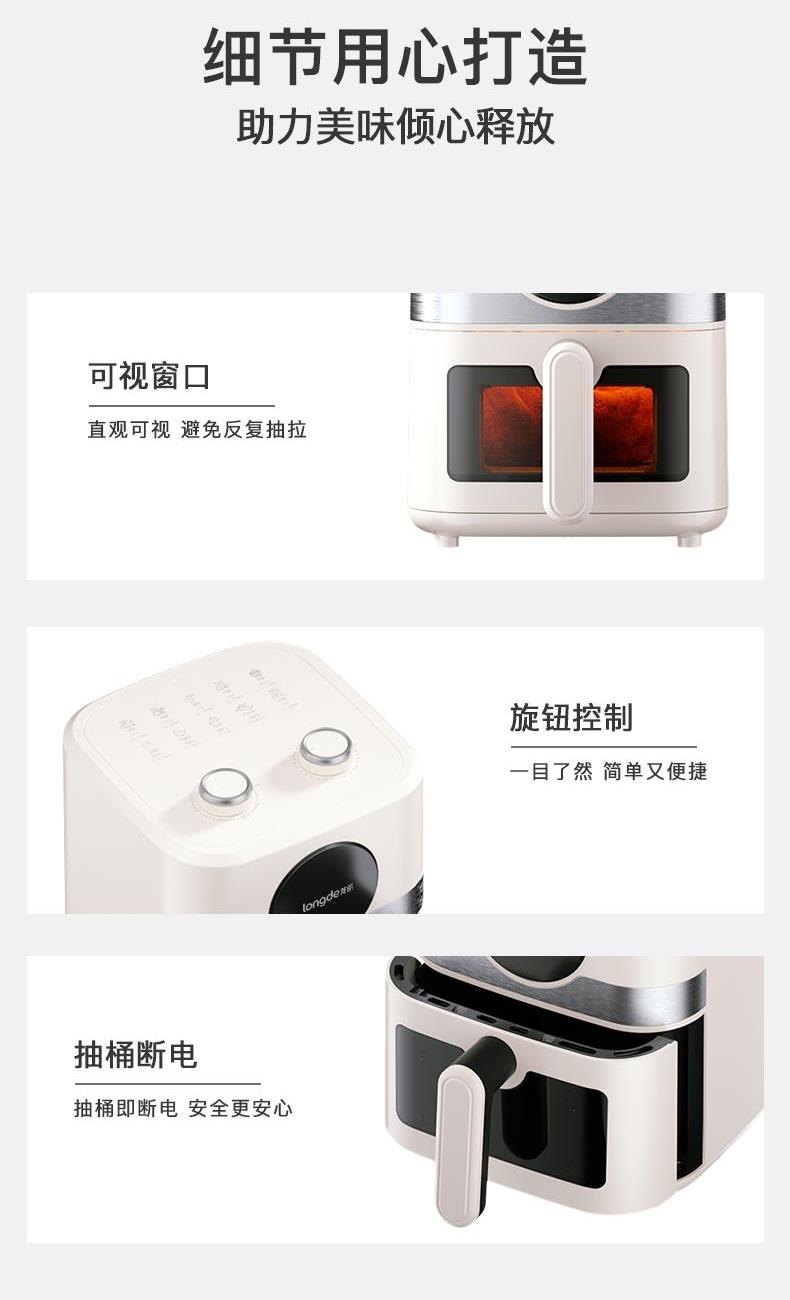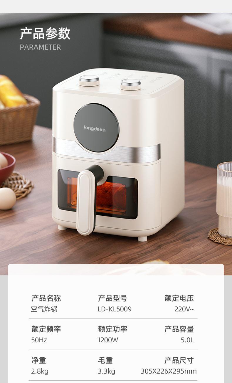 额定功率:1200W 产品容量:5.0L 额定电压:220V~ 产品频率:50Hz 产品净重:2.9kg 产品毛重:3.4kg 整箱重量:14.5kg 装 箱 数:4台/箱 可视大窗口烹饪状态清晰展现,不易烤焦 底加水微蒸汽嫩烤高温热风无油烘炸配合注水快速蒸汽补水,保持食物口感酥嫩 智能触摸面板时间/温度/菜单随心调控,满足多种烹饪需求 抽桶断电记忆抽离炸篮自动停止工作,加料自由