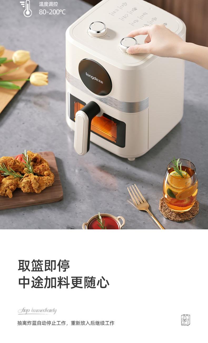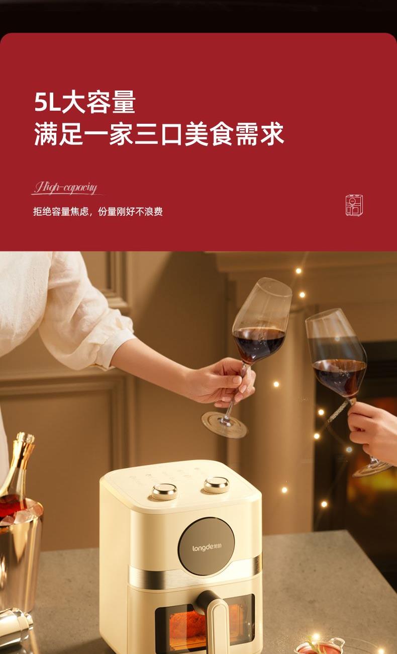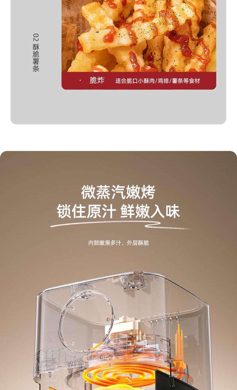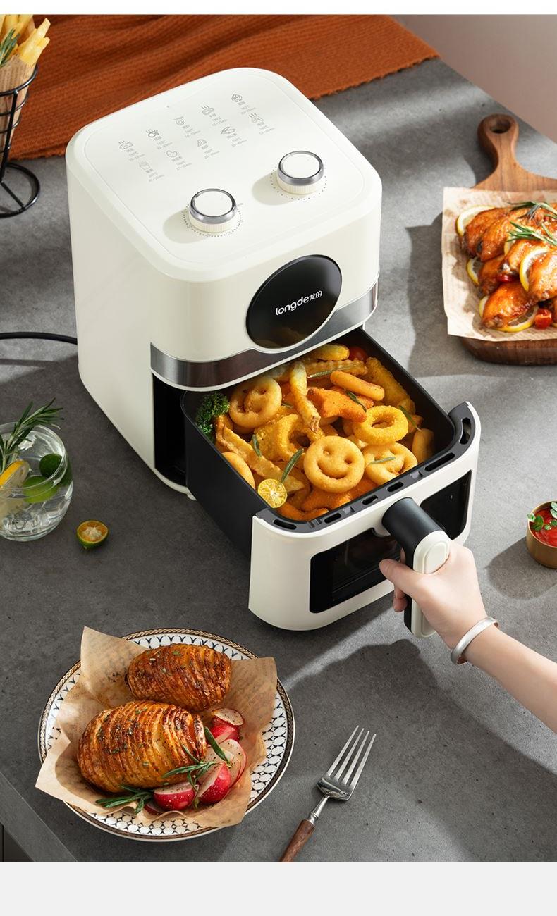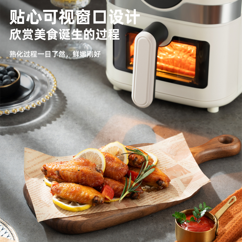 额定功率:1200W 产品容量:5.0L 额定电压:220V~ 产品频率:50Hz 产品净重:2.9kg 产品毛重:3.4kg 整箱重量:14.5kg 装 箱 数:4台/箱 可视大窗口烹饪状态清晰展现,不易烤焦 底加水微蒸汽嫩烤高温热风无油烘炸配合注水快速蒸汽补水,保持食物口感酥嫩 智能触摸面板时间/温度/菜单随心调控,满足多种烹饪需求 抽桶断电记忆抽离炸篮自动停止工作,加料自由