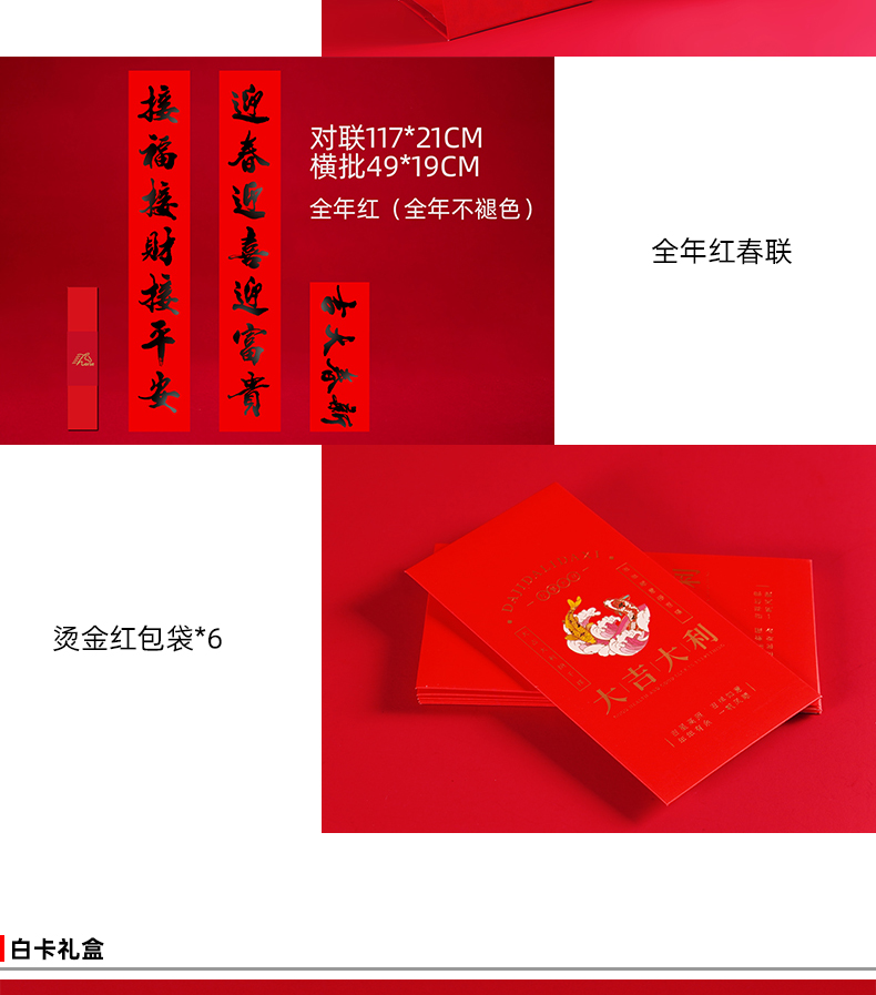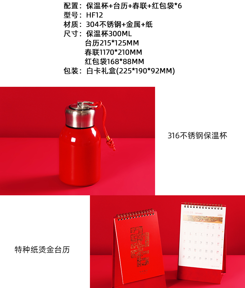 配置:保温杯+台历+春联+红包袋*6 型号:NF12 材质:304不锈钢+金属+纸 尺寸:保温杯300mL 台历215*125mm 春联1170*210mm 红包袋168*88mm 包装:白卡礼盒(225*190*92mm)