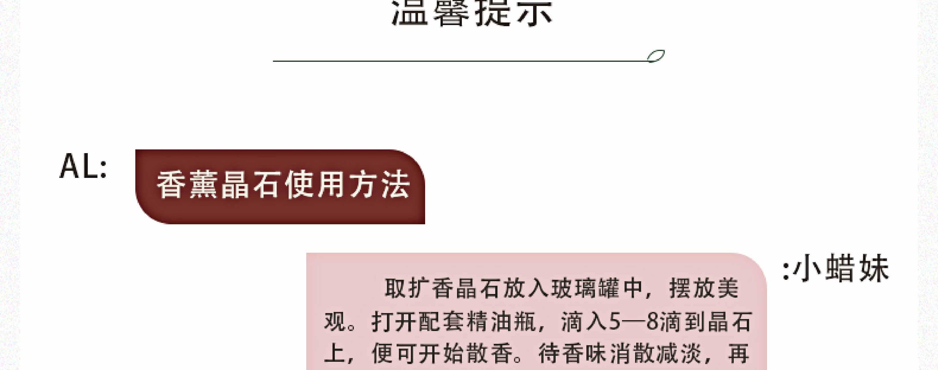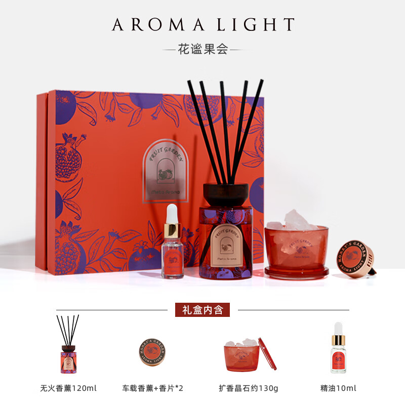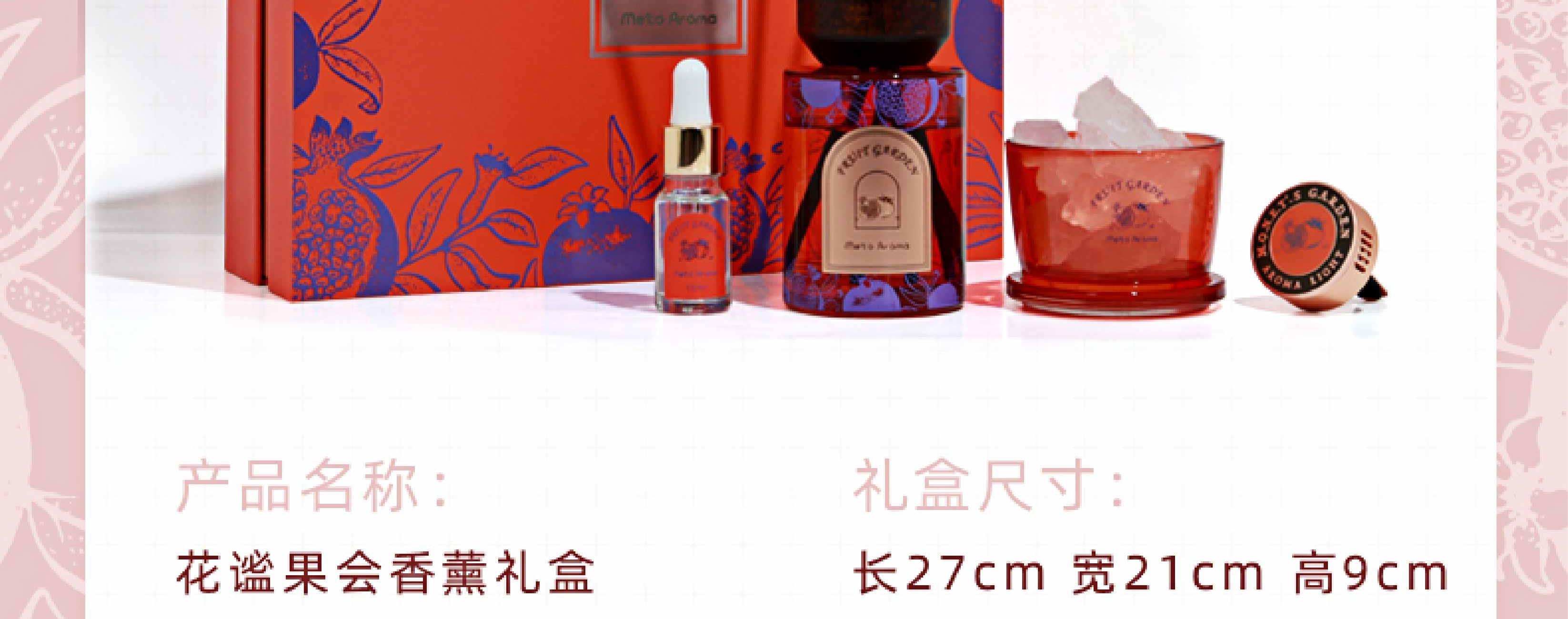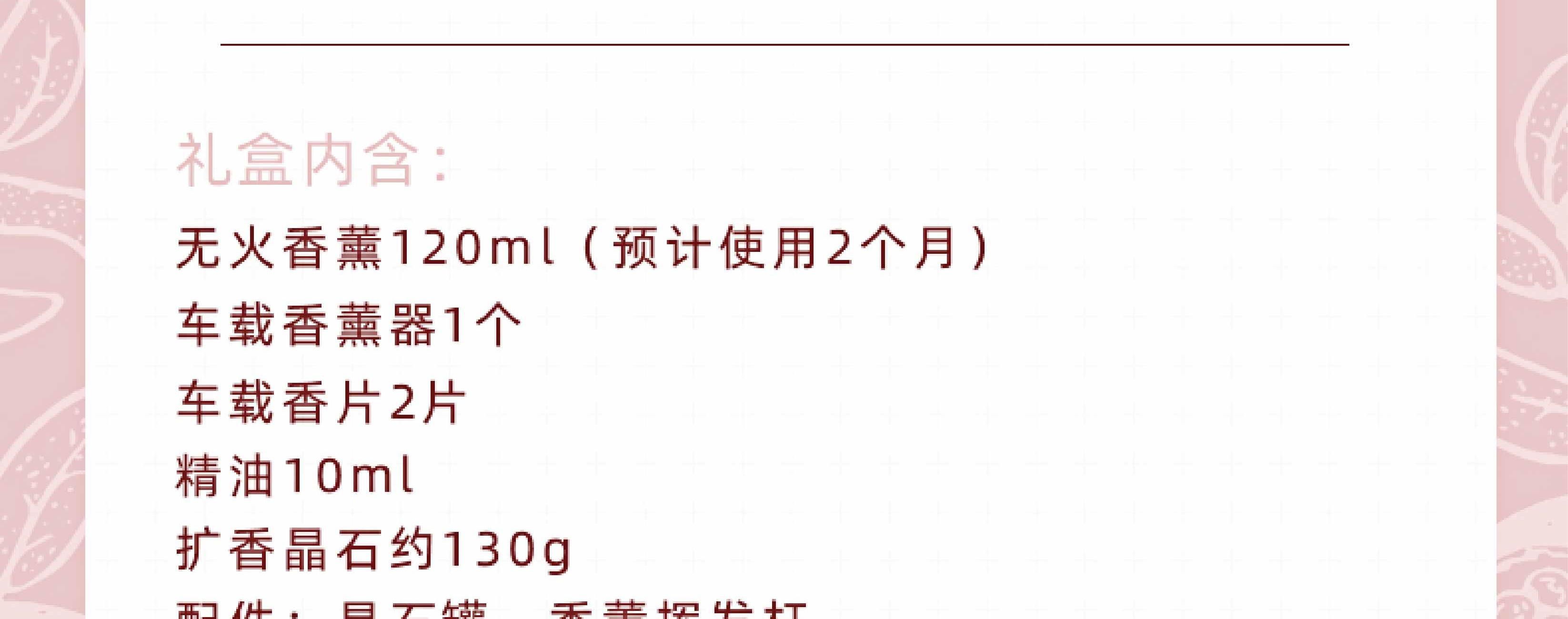 礼盒尺寸:长27cm 高21cm 宽9cm 规格:无火香薰120ml(预计使用2个月)、车载香薰器1个、车载香片2片、 精油 10ml、扩香晶石 约130g 配件 :晶石罐、香薰挥发杆