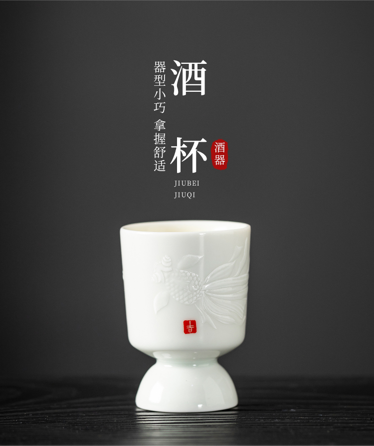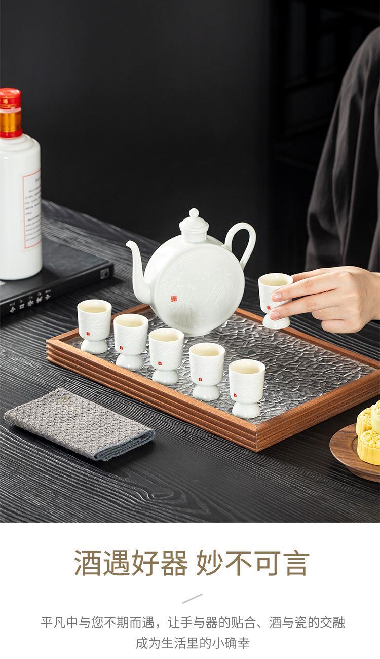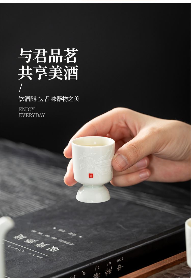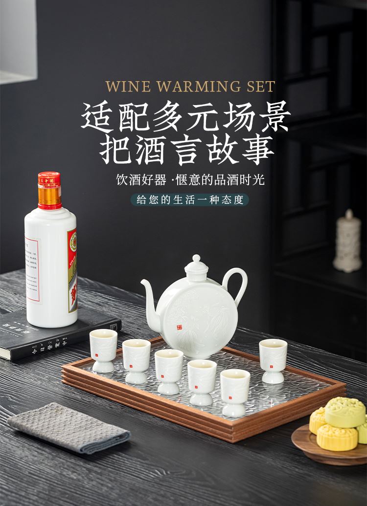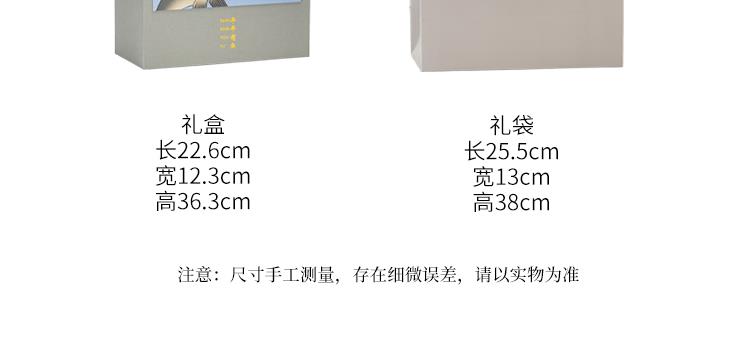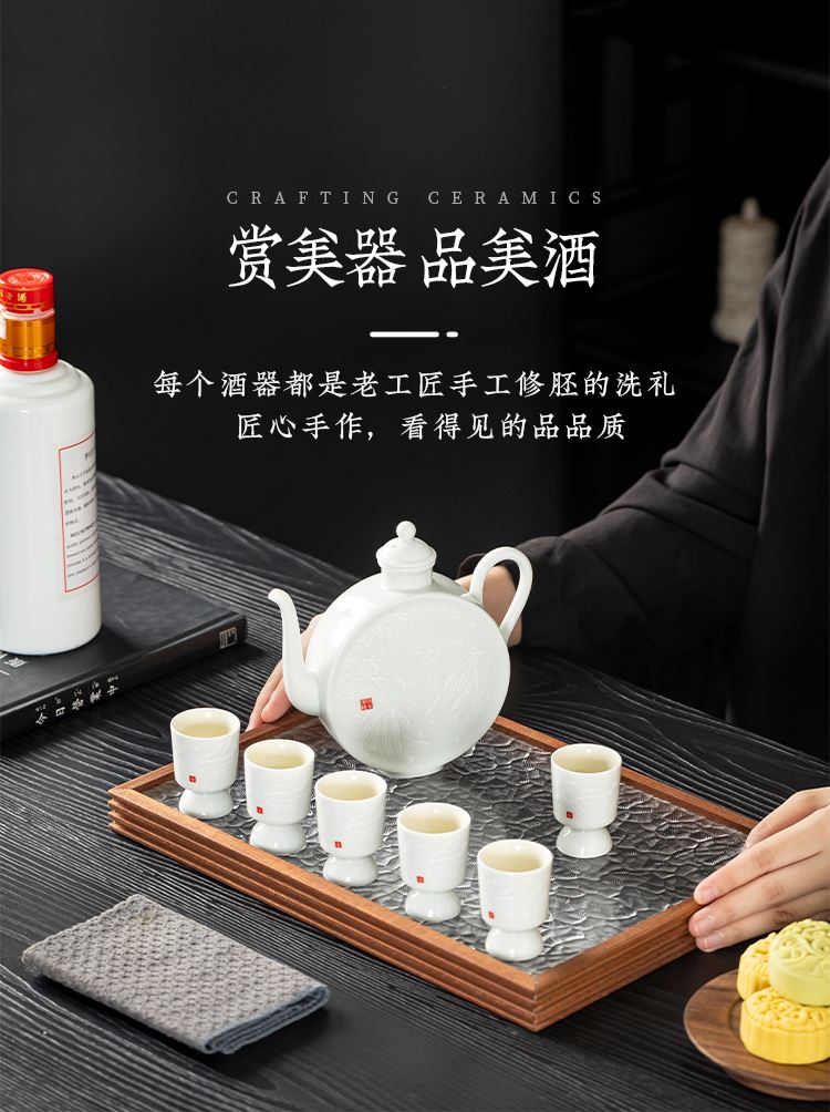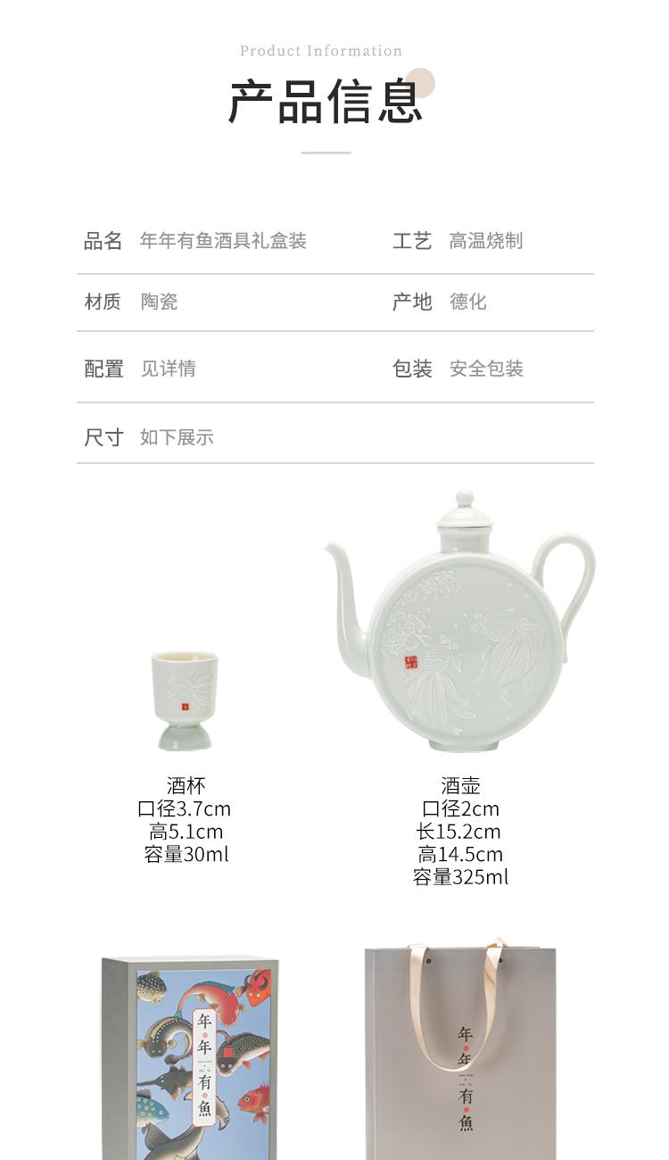 配置:酒杯*6 分酒壶*1 礼盒*1 手提袋*1 材质:影青瓷 礼盒尺寸:36.6cm*23.5cm*12.5cm 产品尺寸:酒杯3.7*5.1cm 容量30ml 酒壶15.2*14.5cm 容量325ml