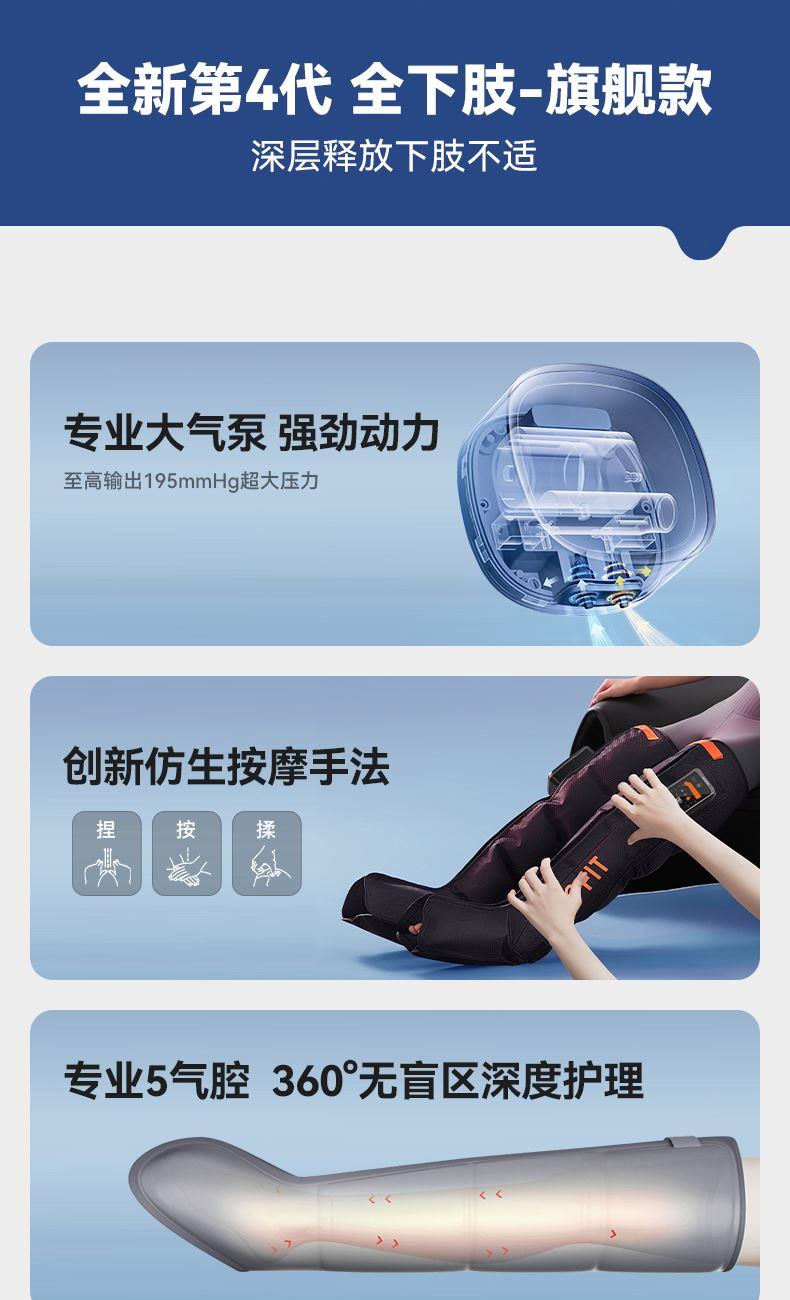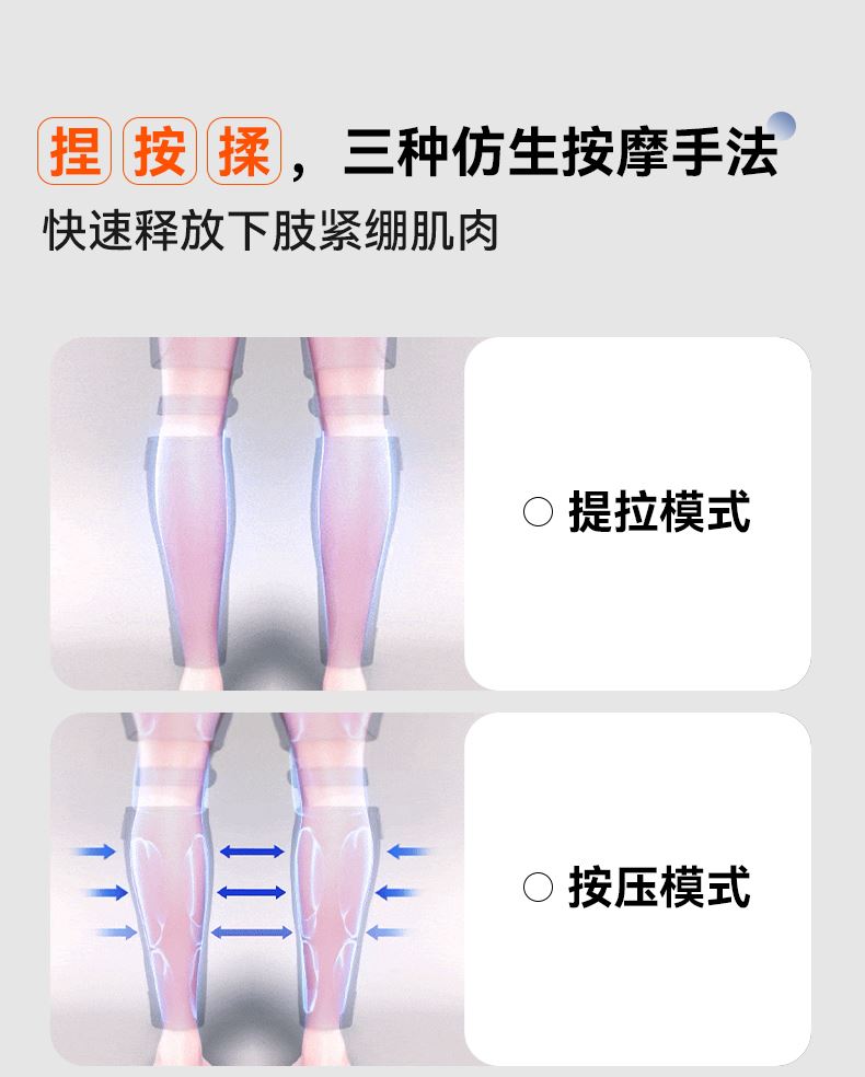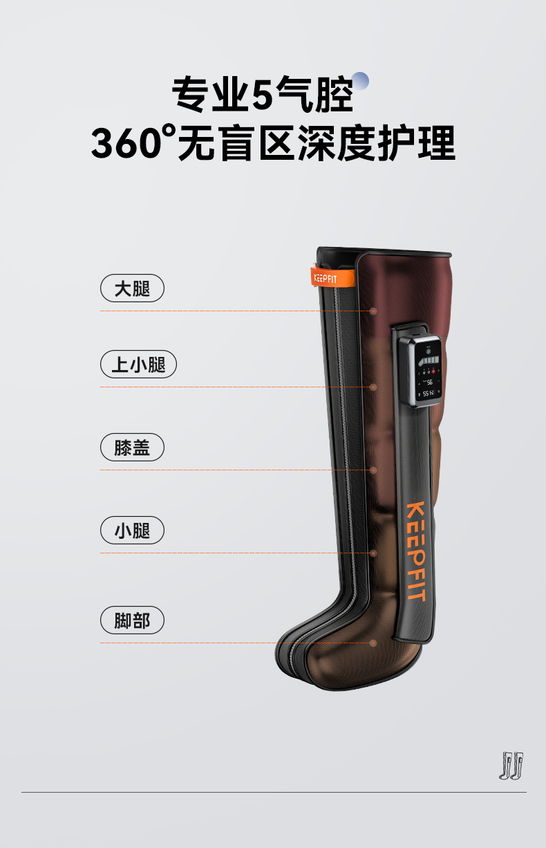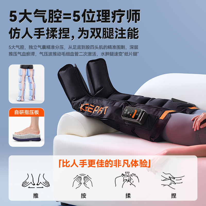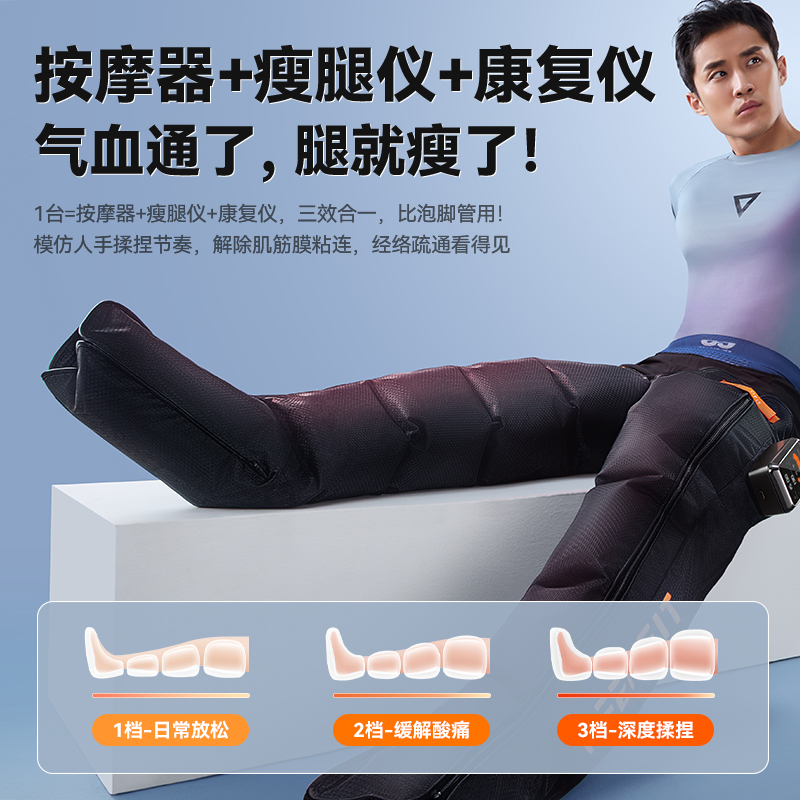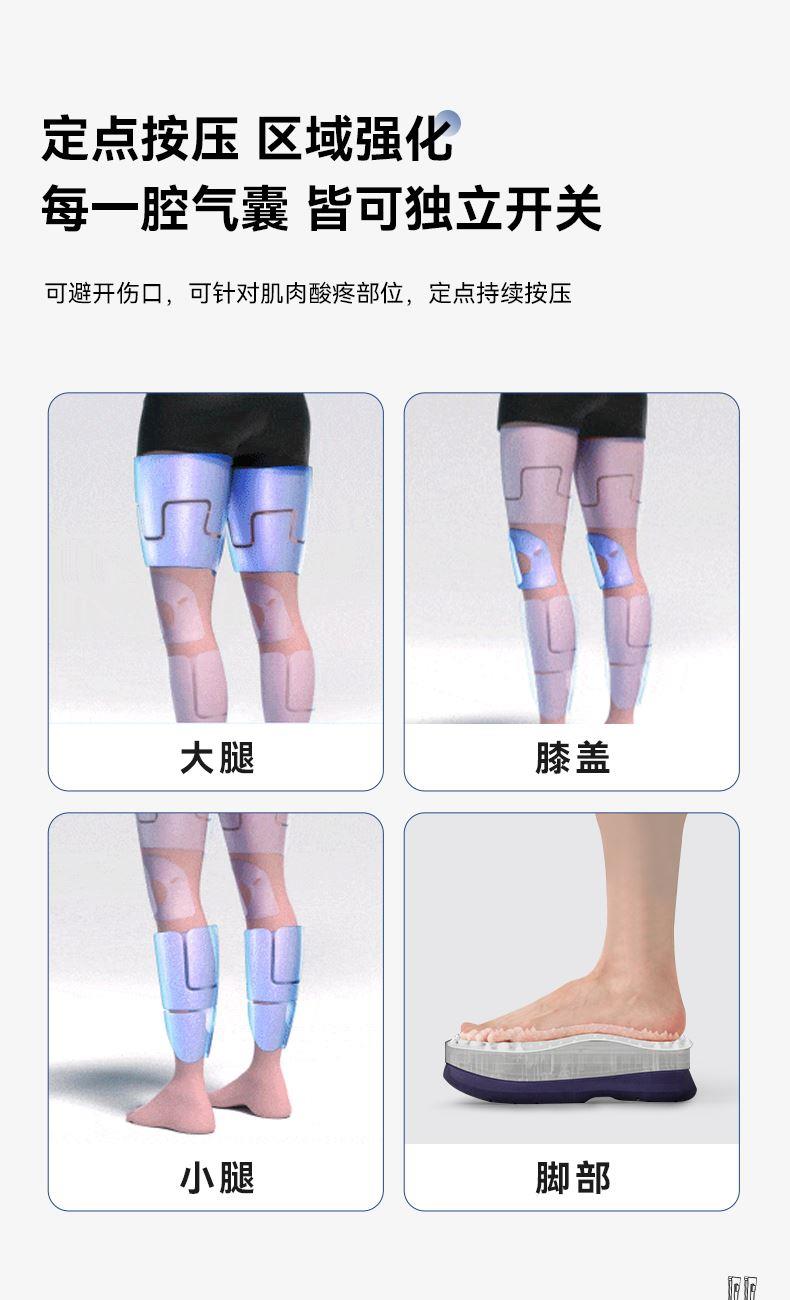 单只装,分左右腿的 【按摩深度】自研250mmHg超强压力,深一度,爽十倍 【智能压力】内置智能压力传感器,粗腿细腿都能感受相同的按摩效果 【五腔六阀】独立气囊设计,按摩位置可控,想按哪里就按哪里 【超长续航】4400mAh大容量电池,持久续航