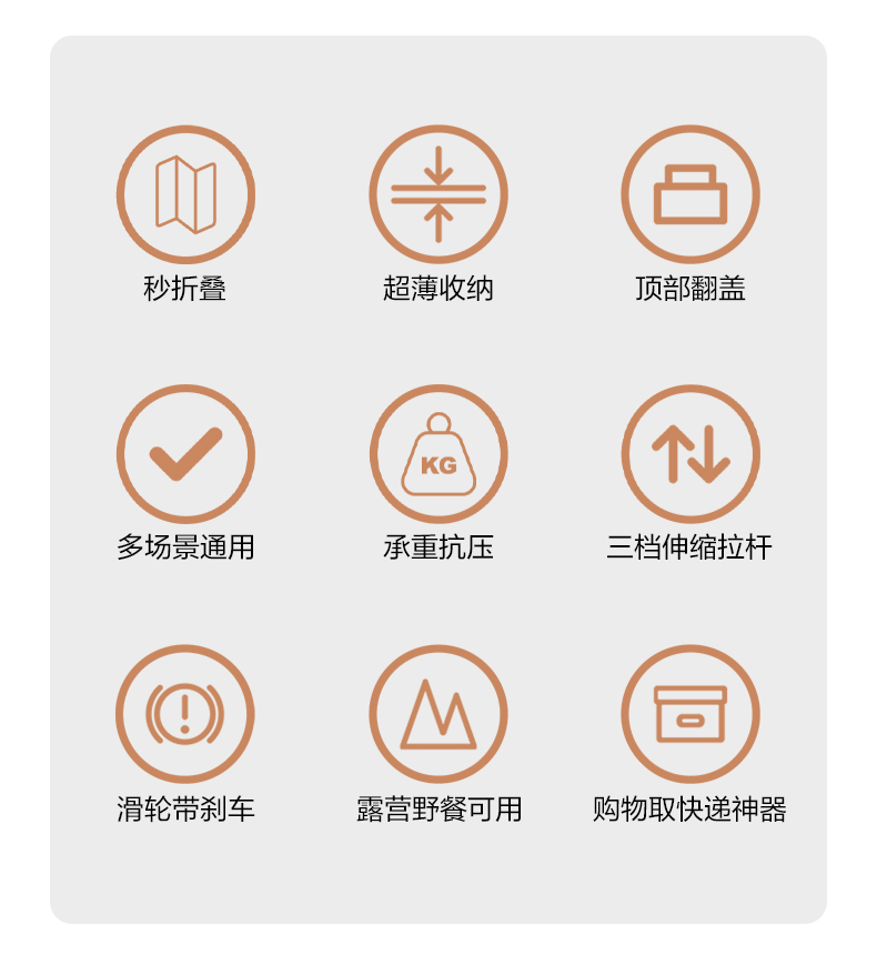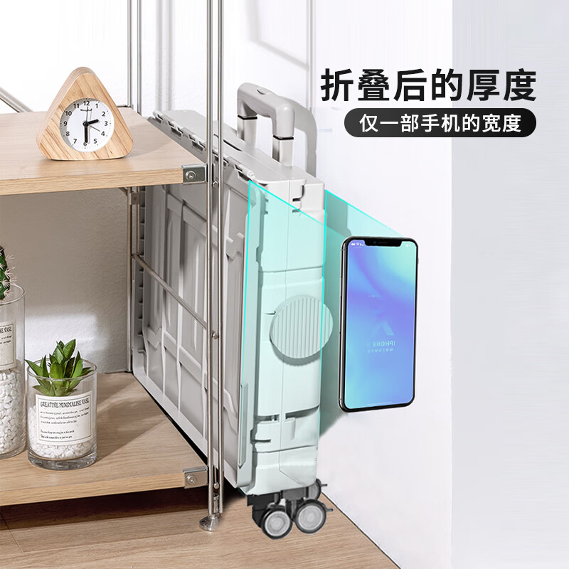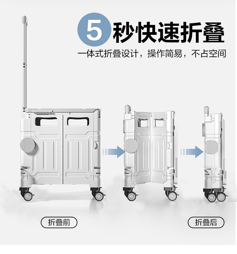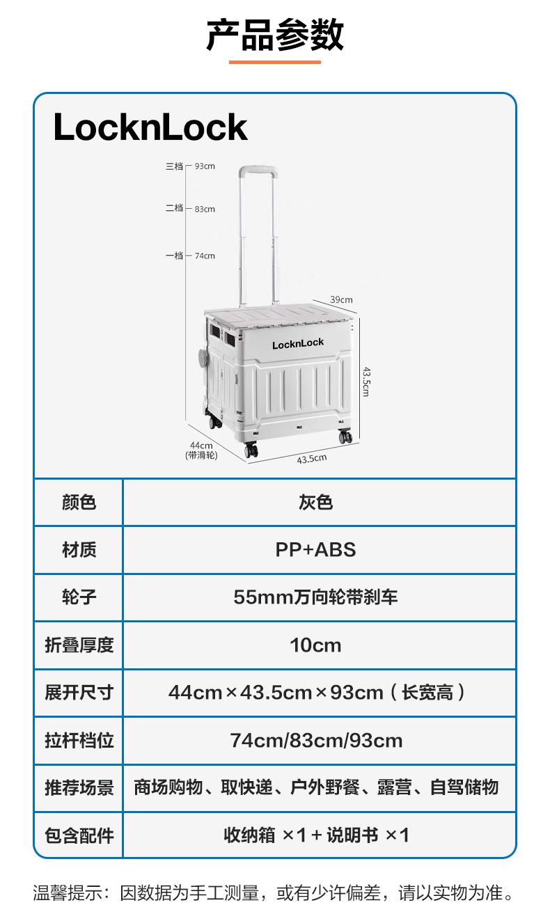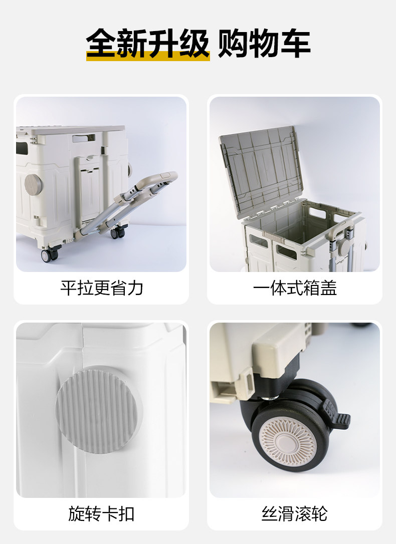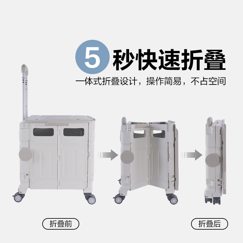 型号:LTZ507 颜色:卡其灰 产品尺寸:44*43.5*93cm 折叠尺寸:47*43.5*10cm 重量:4.42kg 容量:75L 材质:PP+ABS 条形码:6943819173654 一体式折叠设计,5秒快速折叠,操作简易 3档伸缩加厚金属拉杆,也可直拉/平拉自由切换 带刹车丝滑万向轮,动静自如,安全可控 材质坚韧耐用,硬核抗造不怕磨,持久如新好品质 一体式箱盖,旋转式安全卡扣 折叠后厚度10cm,方便收纳,节省空间 多场景适用:商场购物,户外野餐,车载出行,搬运重物,临时座椅,休闲钓鱼,摆地摊,拉快递…