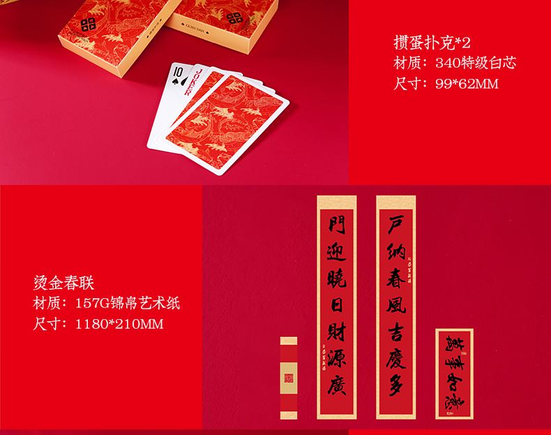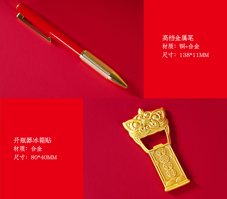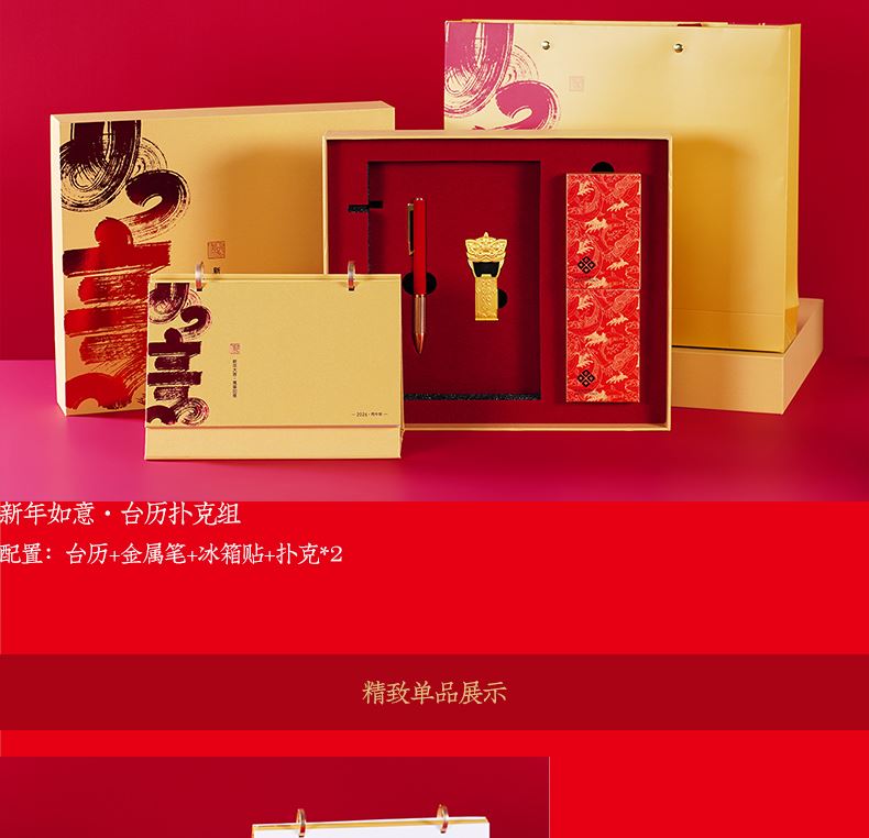 配置:台历+笔+冰箱贴+春联 材质:珠光金纸+白卡+合金 尺寸:台历210*150mm 签字笔138*11mm 冰箱贴80*40mm 春联1180*210mm 包装:珠光金礼盒(302*262*53mm)+手提袋