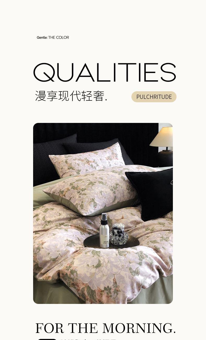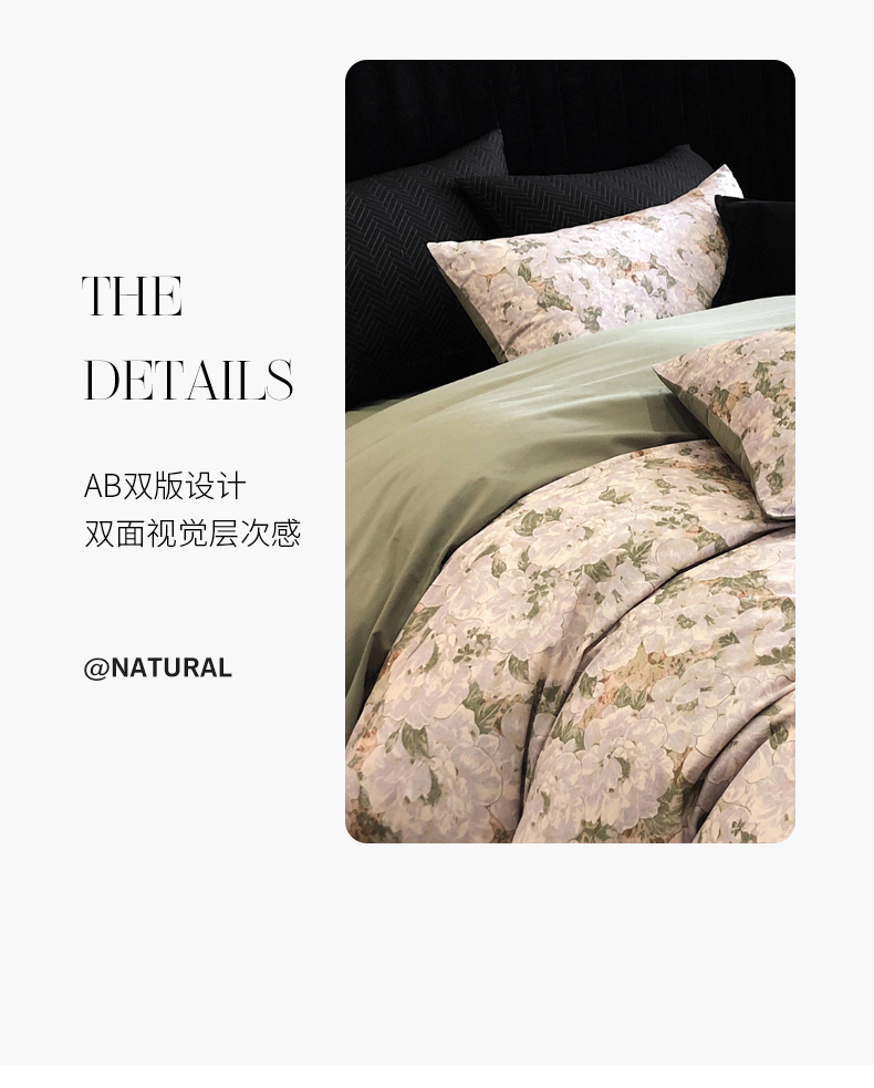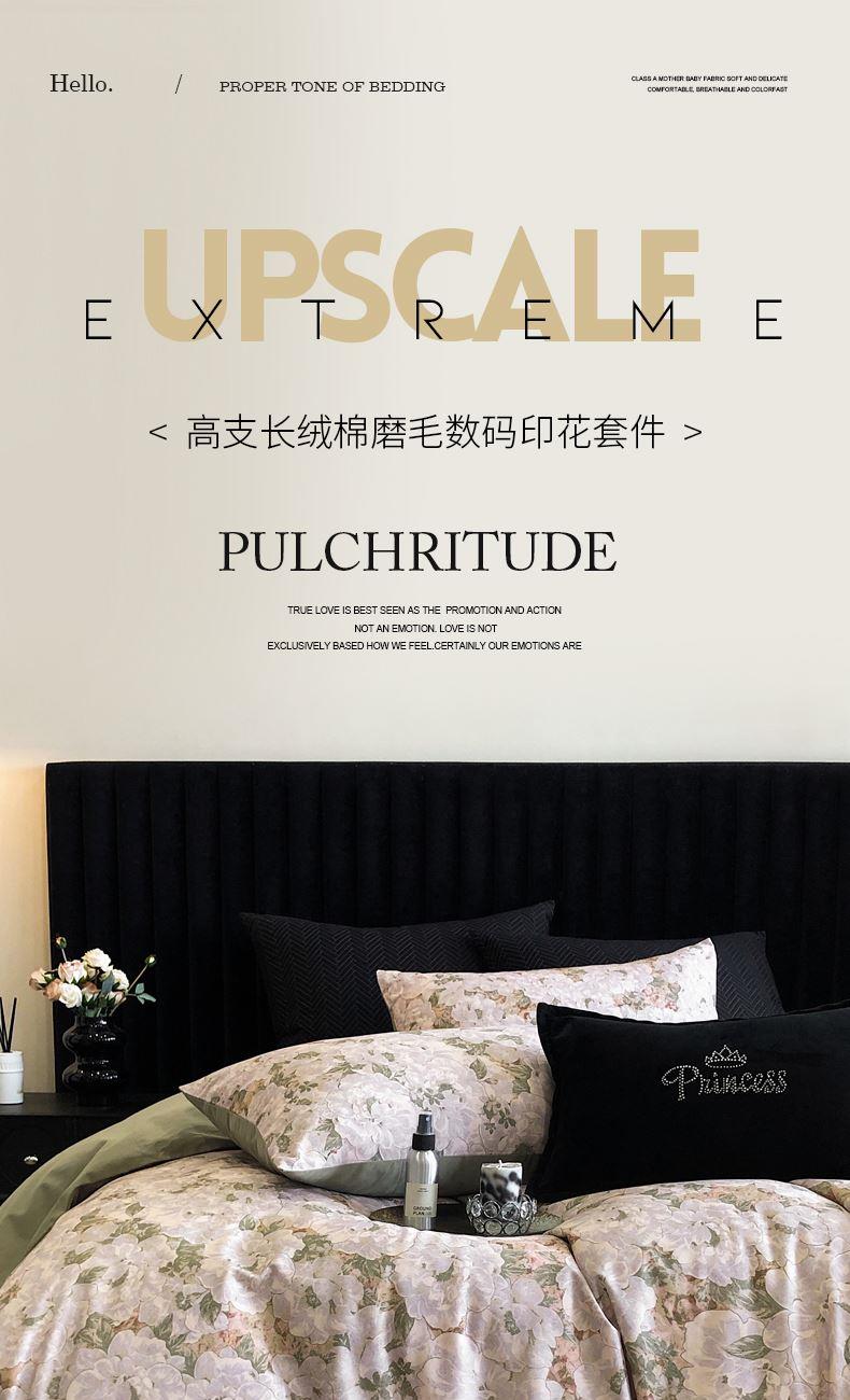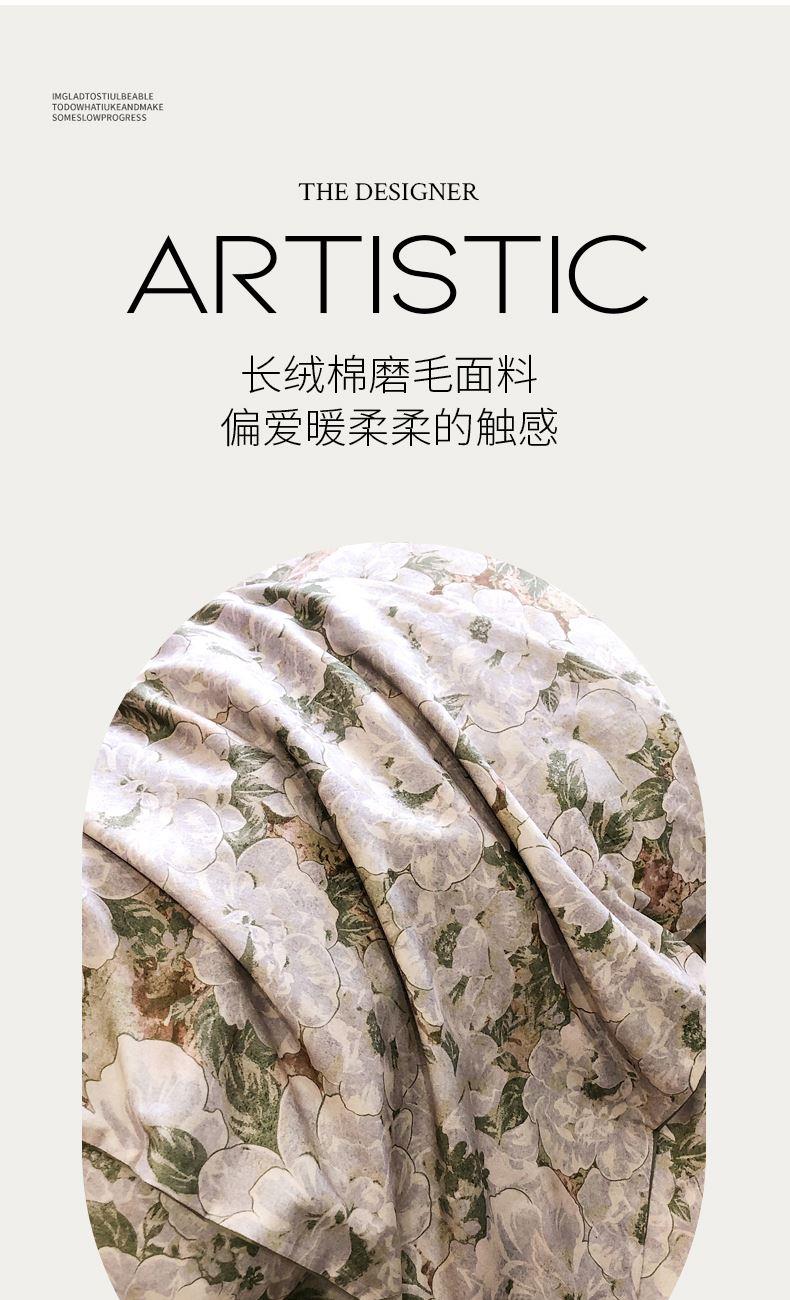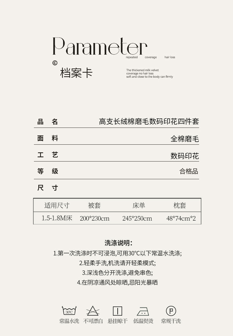 被套:200×230cm 床单:245×250cm 枕套:48×74cm 适用:1.5M-1.8M床 面料:全棉磨毛(棉) 印染工艺:数码印花 数码全棉磨毛面料,贴合肌肤零距离,顺滑柔软保暖性好,给予肌肤软糯触感,数码印花工艺每一个角度色感与质感俱佳颜色均匀不易褪色是它历久弥新。